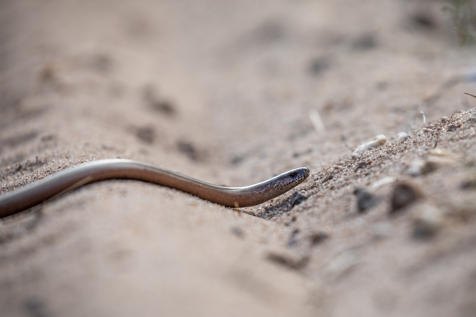 On the way back, Jennie suddenly stops on a dirt track and yells, “Oh, I didn’t run it over, did I?” It soon becomes clear that she has run over a slow worm by a hair’s breadth. Fortunately, the animal escaped unharmed and is hidden in the grass in the middle of the path. In the hope that the reptile will still show itself, I am ready to photograph it. It does indeed appear, but crosses the path (too) quickly (for me) and disappears into the grass on the side of the sandy path. The photo I was able to take just now is not one to hang on the wall. However, the meeting was good enough for us. It was, of course, even better that the Slowworm had reached the other side of the path alive and well…