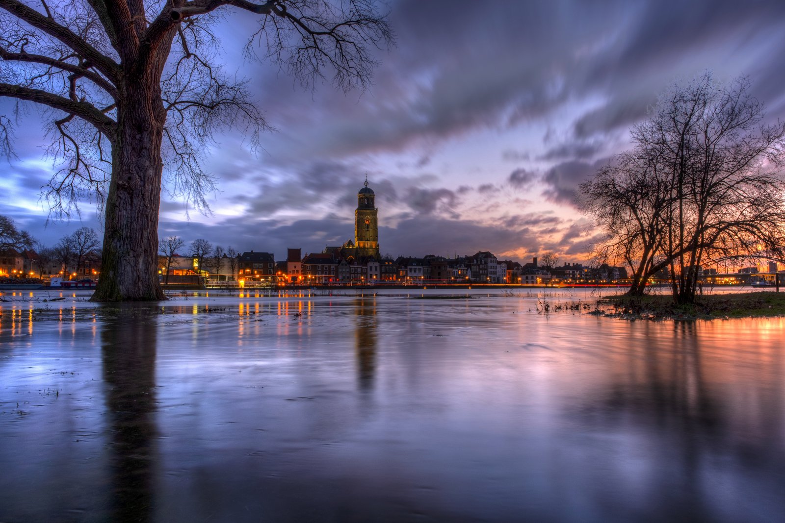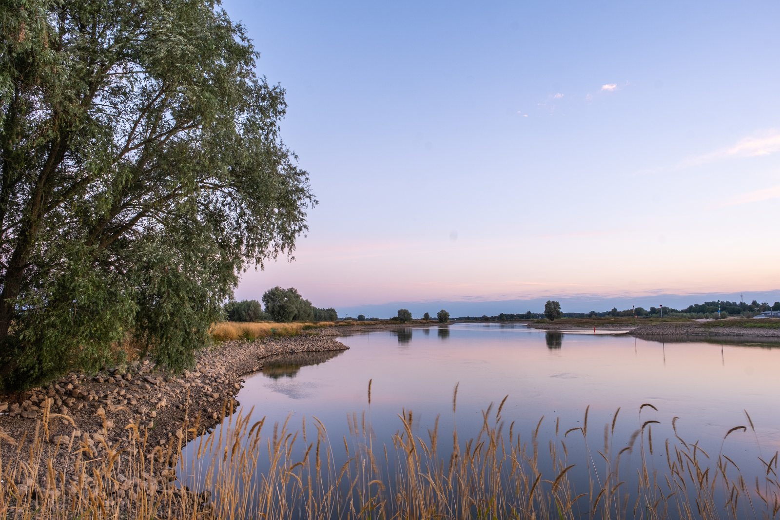 Enthusiastic about my first acquaintance with the IJssel near Welsum, today exploring again. This time I start at the start of the blue hour on the left bank of the IJssel opposite Deventer. This spot, located in front of the IJsselhotel on the edge of the Plantsoen de Worp, is a popular photo location. You have a beautiful view of the skyline of Deventer with the Lubuiuskerk as a beacon. It’s not the first time I’ve been here in the dark again. The last time was on February 12, ’20. Then you couldn’t possibly be standing in the exact same spot I’m standing this morning. In contrast to today, where the water level is extremely low, on February 12 the water level was extremely high. An enormous contrast, but both situations photogenic.
