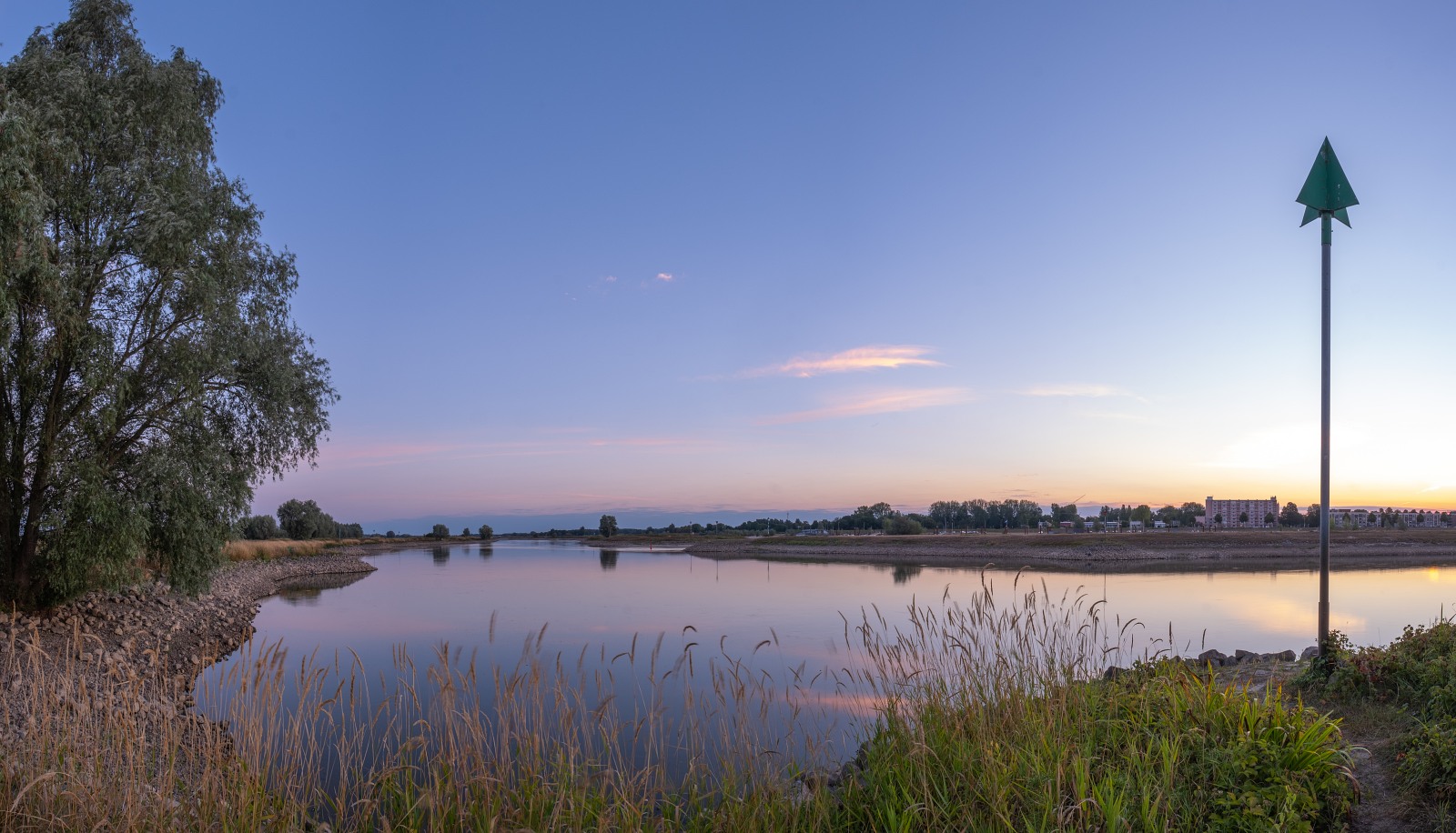 Op zich ben ik tevreden met de zonsopkomst foto, maar zou eigenlijk wat meer van de omgeving in de foto willen zien. Daarom pas ik de techniek van het maken van panorama opnames toe. De serie foto’s die ik maak voor de uiteindelijke panorama foto, maak ik met dezelfde 16-55mm lens. Mijn camera staat waterpas op mijn driepoot statief in de portret stand. Zo krijg ik uiteindelijk de foto waar net iets meer op staat als een enkele foto. Een mini minpuntje op deze locatie is de bebouwing aan de overkant van de IJssel.