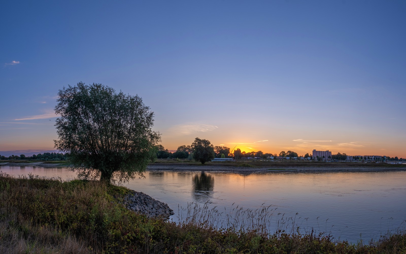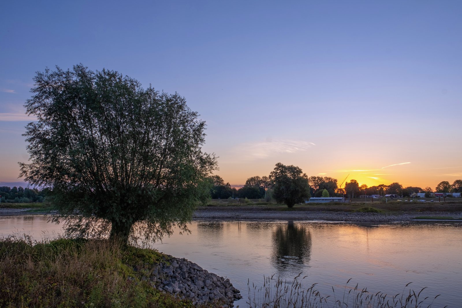 Precies op tijd om de zon op te zien komen, sta ik aan de waterkant. De zon komt, ten opzichte van mijn standpunt, op aan de overzijde van de rivier. Wat betreft de compositiemogelijkheid heb ik eveneens geluk deze ochtend. Een fraaie lindeboom op de oever waar ik sta en eentje die aan de overkant van het water staat dienen als zichtpunten in de opname.