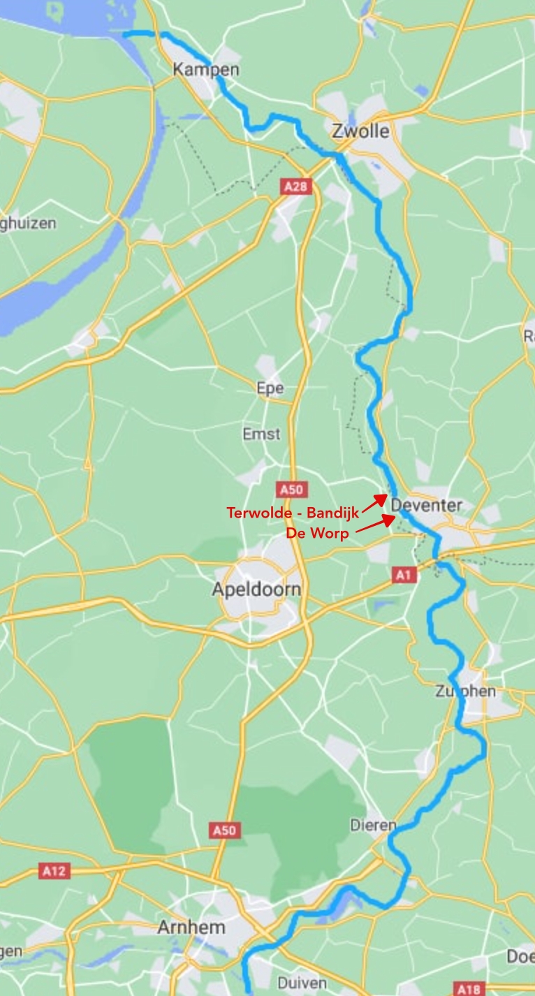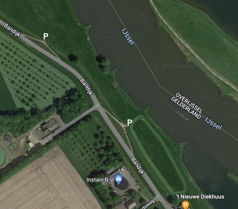 Even voordat de zon opkomt vertrek ik naar de volgende locatie en blijf daarbij opnieuw aan de linkeroever. Deze locatie ligt slechts enkele kilometers verder in Noord Westelijke richting bij het dorp Terwolde. Net na het restaurant Het Nieuwe Diekhuus zijn er op verschillende plekken onderaan de Bandijk kleine parkeermogelijkheden – zie afbeelding. Vandaar af kun je in verschillende richtingen door de uiterwaarden van de IJsel lopen en genieten.