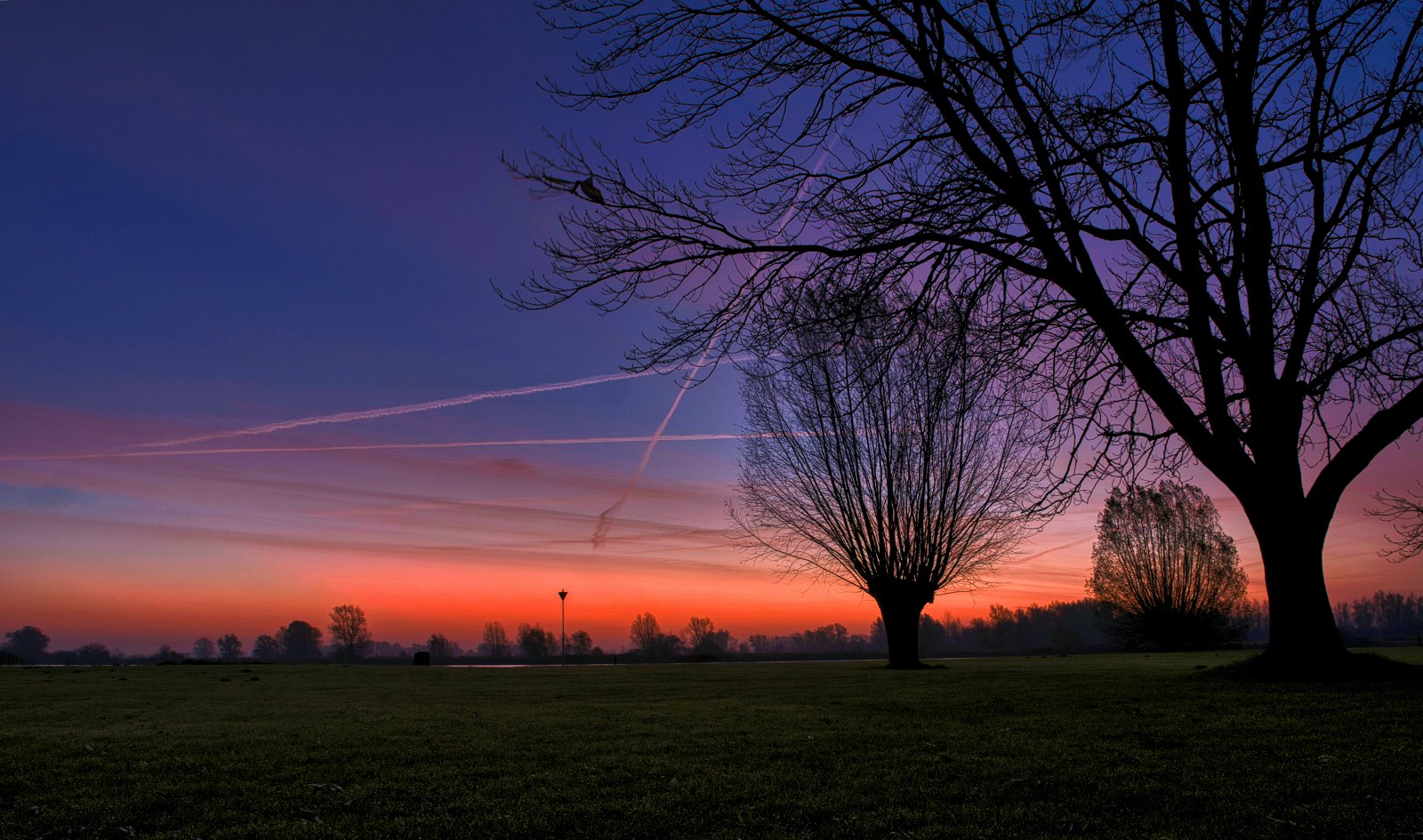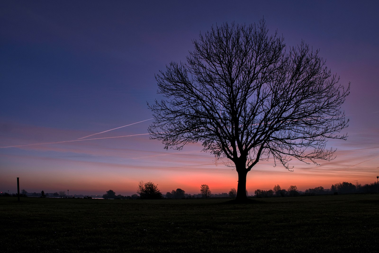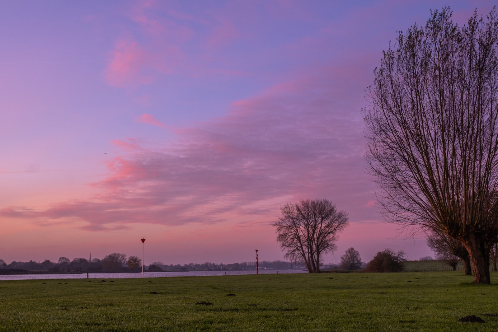Nu is het niet zo dat nadat de zon is opgekomen het dan pas de moeite is om een tijdje te wachten. De lucht om je heen kan al veel eerder kleuren, zoals ik laatst merkte toen ik in de Heulsewaard was. Zoals gebruikelijk startte ik met fotograferen tijdens het blauwe uurtje. Kort voordat de zon opkwam zag ik rechts van mij dat niet alleen de hemel, maar ook een sluierbewolking begon te kleuren. Dit is het effect van het strijklicht dat de opkomende zon verspreidt. Op onderstaande foto is het effect van het strijklicht te zien aan de linkerrand van de wolken.