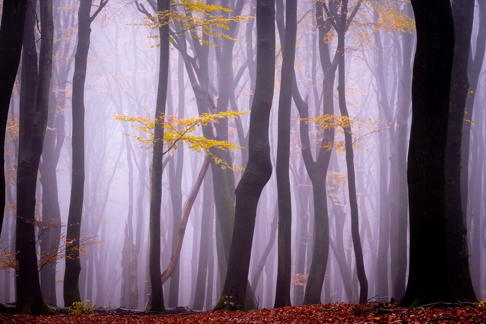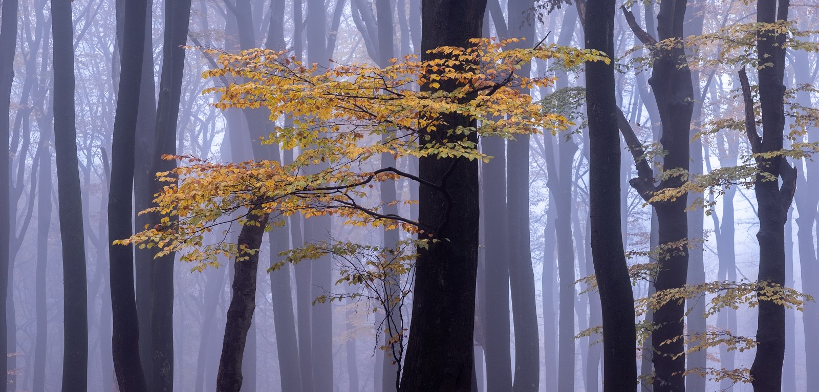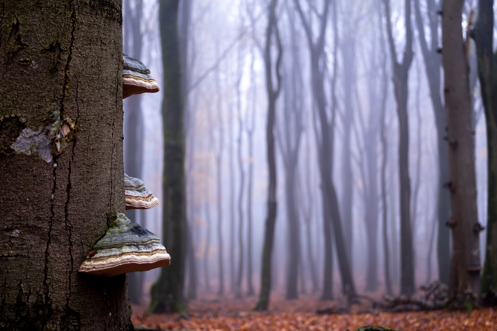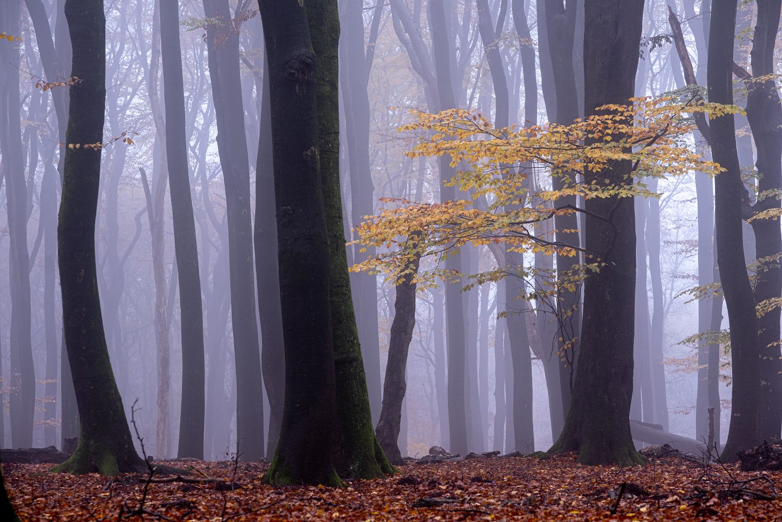 Nee, het was juist genieten op de vroege en vooral mistige ochtend van 29 november ’22. Genieten in het bos bij het Dorp Vierhouten op de Veluwe. Een bos waarin vooral enorme beukenbomen de hoofdrol spelen. Een bos, dat in tegenstelling tot bijvoorbeeld een loofbos, een meer open bos is. Vooral als er nagenoeg geen blad meer aan de bomen hangt, lijkt het er nog ruimtelijker. Hierdoor krijgen mist en licht die ochtend wel vrijspel om een mystieke sfeer te creëren en ….. dat was die ochtend het geval.