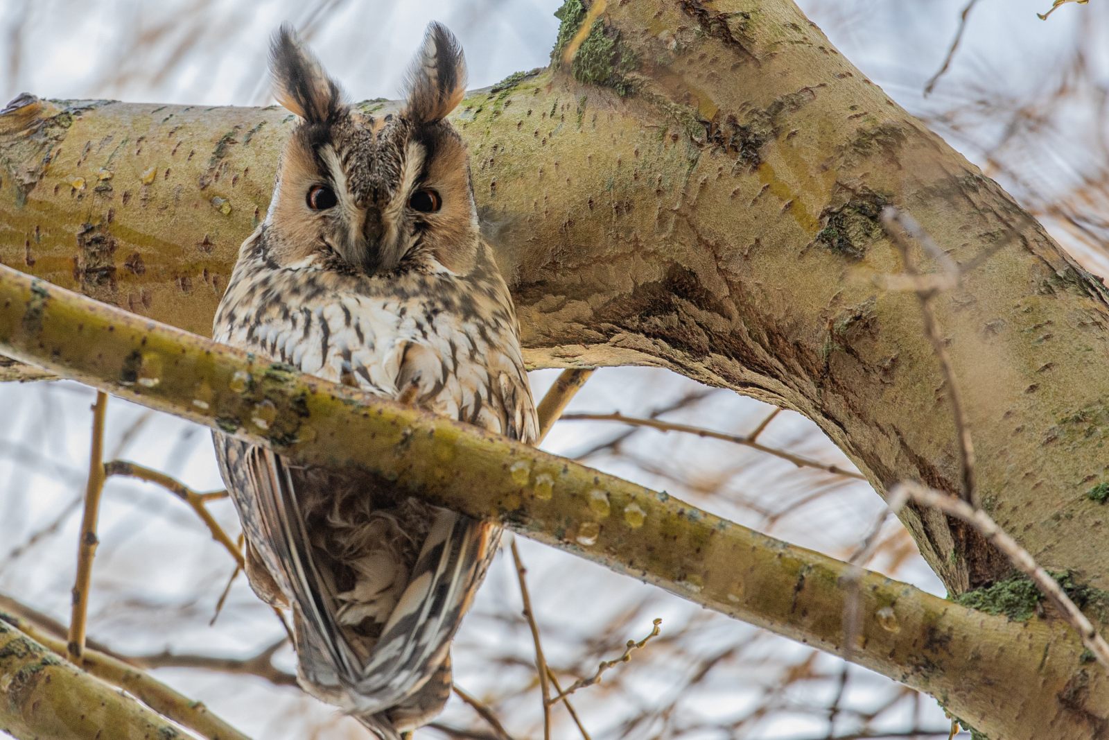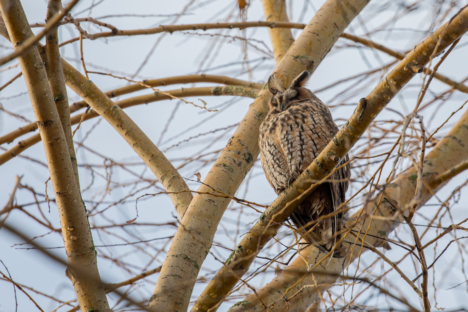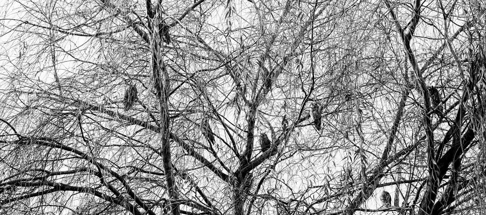 Deze ransuilen hebben een flinke es(?) als roestboom uitgekozen. Een boom die nu geen bladeren meer heeft, maar daarentegen wel een enorme hoeveelheid enorm takjes. Voor de uilen biedt deze boom daardoor de nodige bescherming en beschutting. Maar, als je de uilen wilt fotograferen heb je meestentijds wel een takje dat voor de uil hangt. Zeker omdat je naar boven toe moet fotograferen en dus snel een tak(je) in de weg zit. Lastig dus om door die takken een pose te vinden waarin een uil (redelijk) vrij zit. Maar met een beetje geduld en vooral veel geluk kun je de foto schieten die je wilt.
