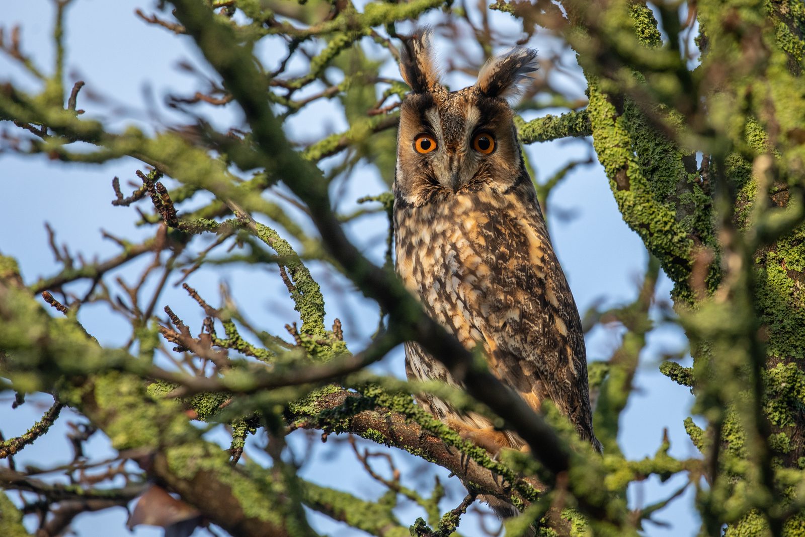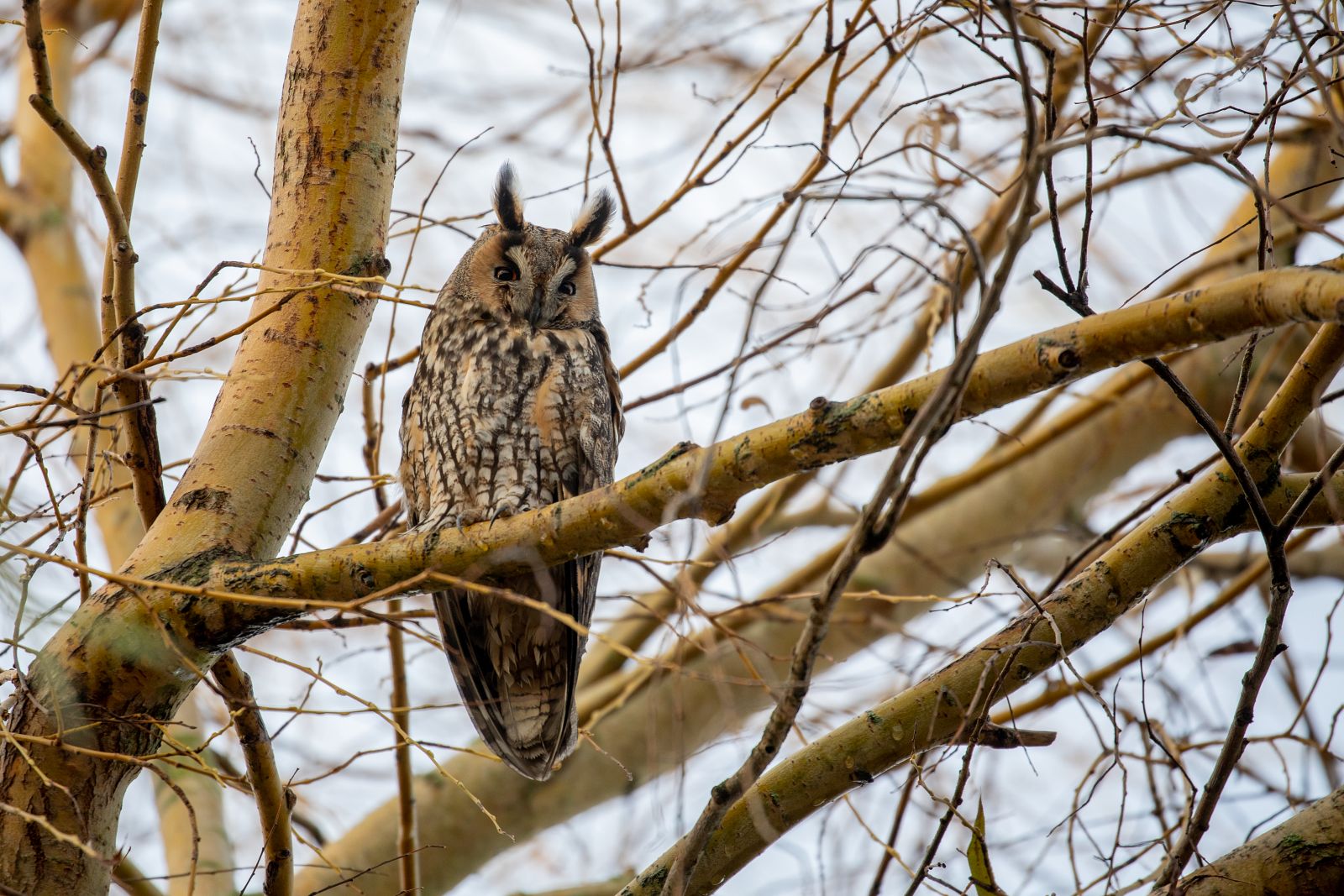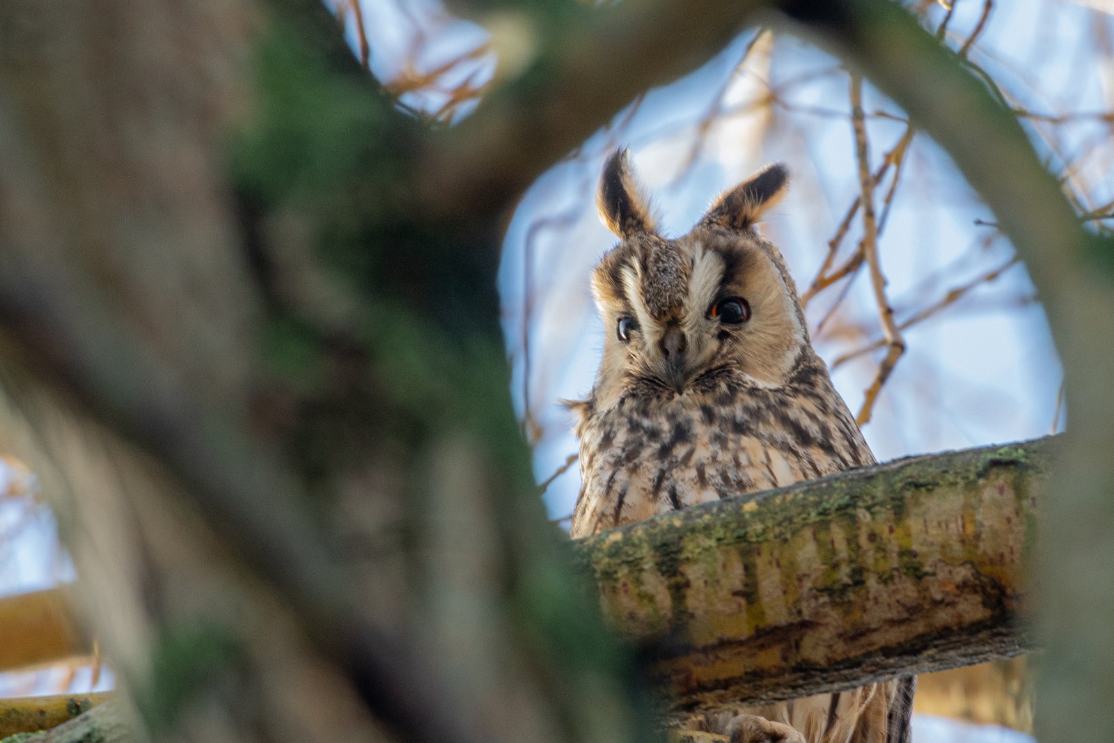 Deze ransuilen hebben een flinke es(?) als roestboom uitgekozen. Een boom die nu geen bladeren meer heeft, maar daarentegen wel een enorme hoeveelheid enorm takjes. Voor de uilen biedt deze boom daardoor de nodige bescherming en beschutting. Maar, als je de uilen wilt fotograferen heb je meestentijds wel een takje dat voor de uil hangt. Zeker omdat je naar boven toe moet fotograferen en dus snel een tak(je) in de weg zit. Lastig dus om door die takken een pose te vinden waarin een uil (redelijk) vrij zit. Maar met een beetje geduld en vooral veel geluk kun je de foto schieten die je wilt.