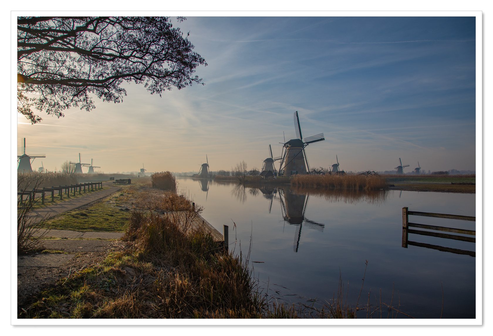 Acht verschillende tijdstippen, acht verschillende perspectieven en composities. Een beeldverhaal van een ochtend fotograferen bij de molens van Kinderdijk op 16 februari ’23.