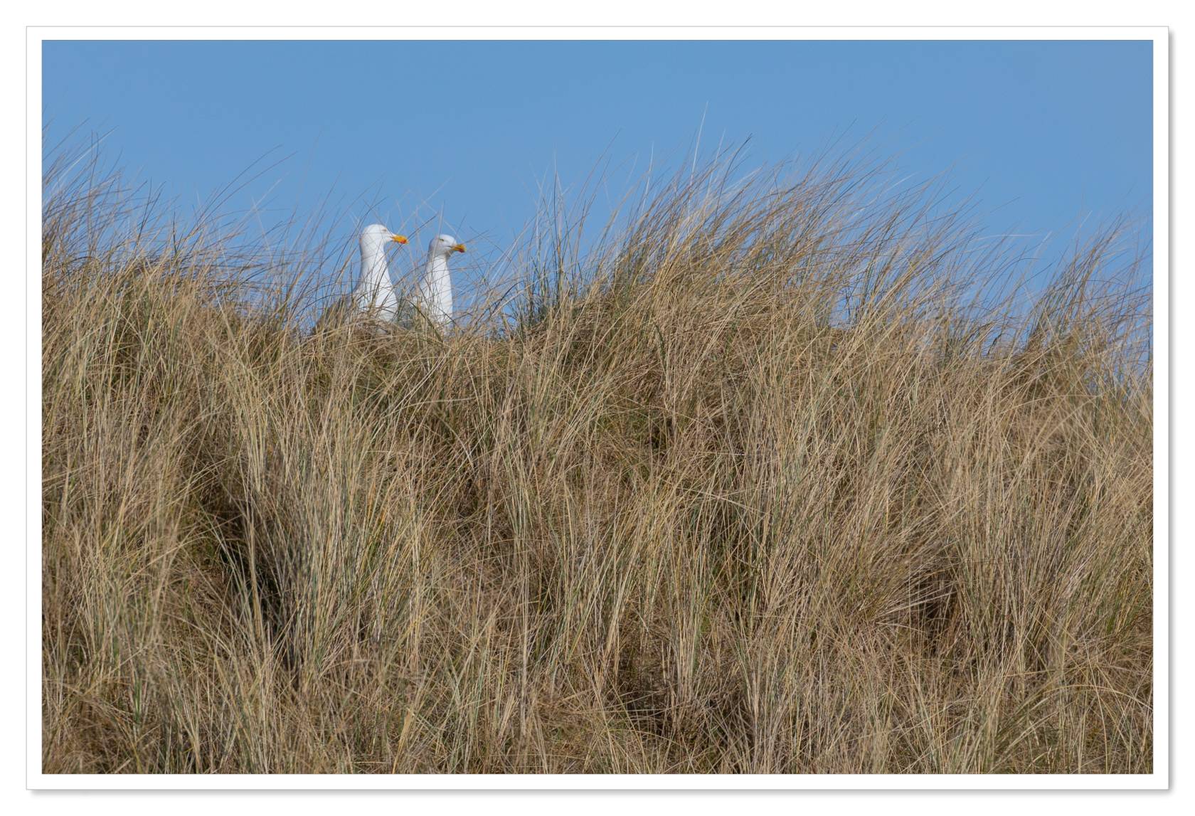 Twee grote mantelmeeuwen hebben al vast een broedplek gevonden in de duinen
