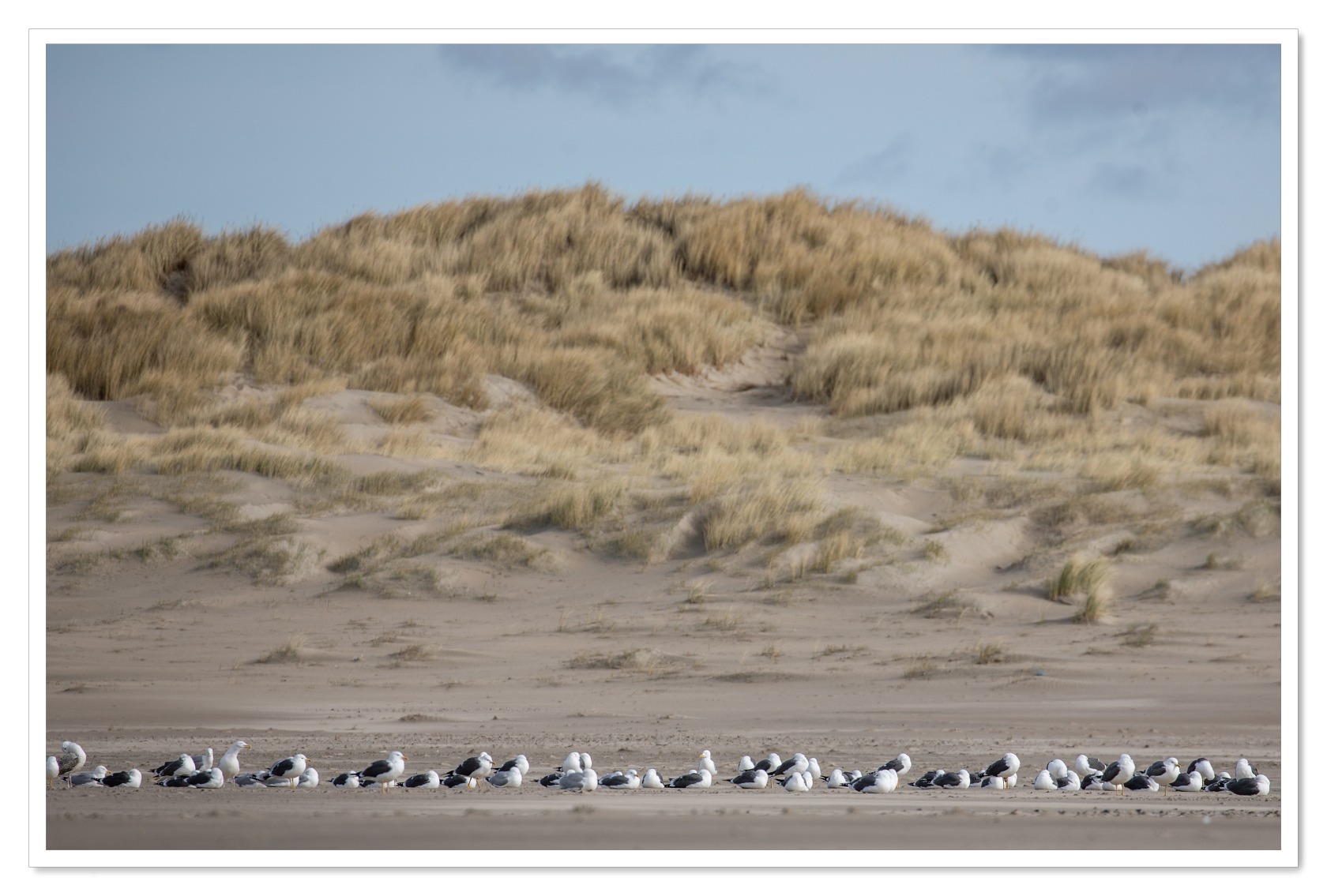 Een groep kleine mantelmeeuwen rust op het strand uit in de luwte van de duinen