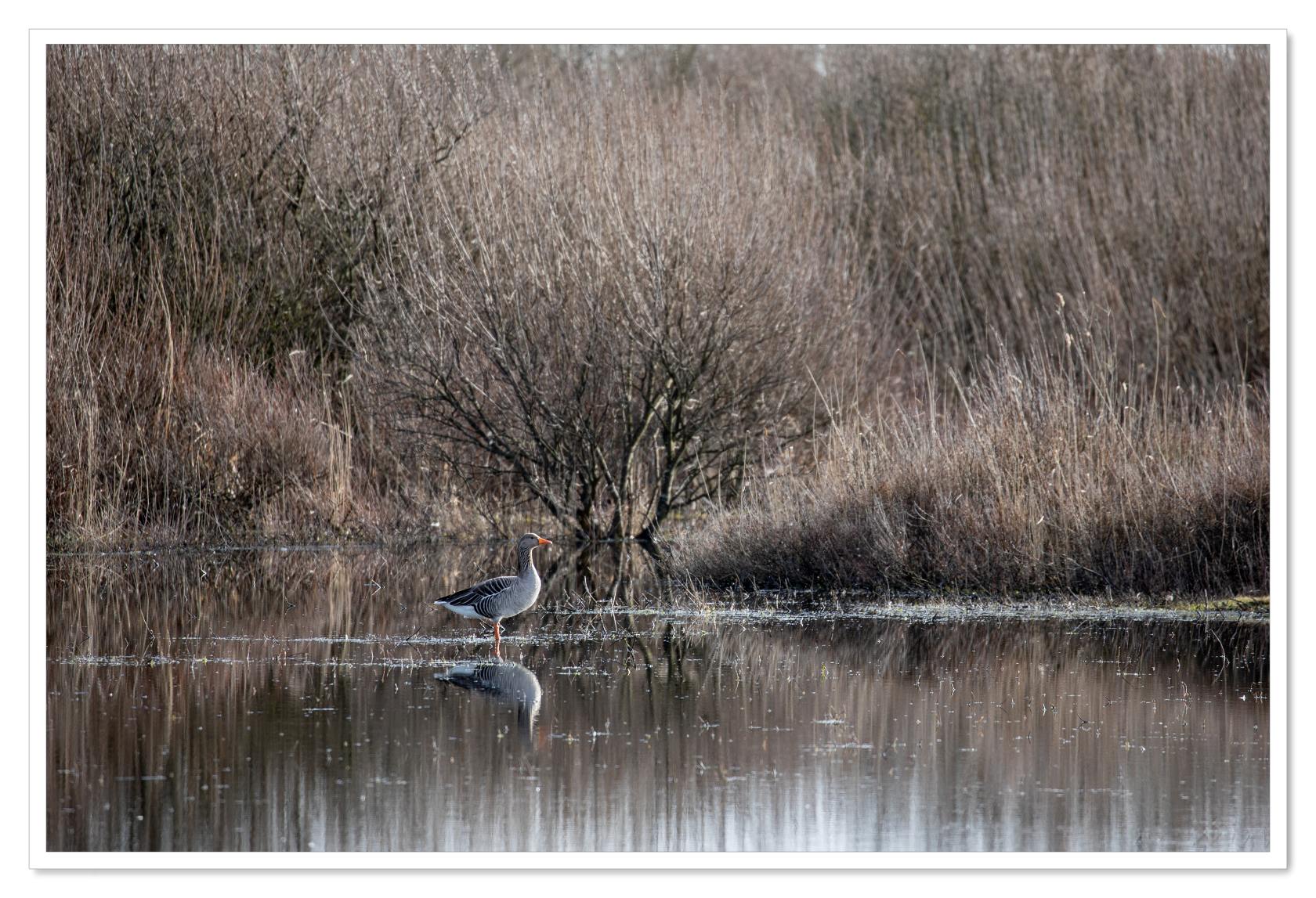 Een eenzame grauwe gans in een van de vele duinmeertjes