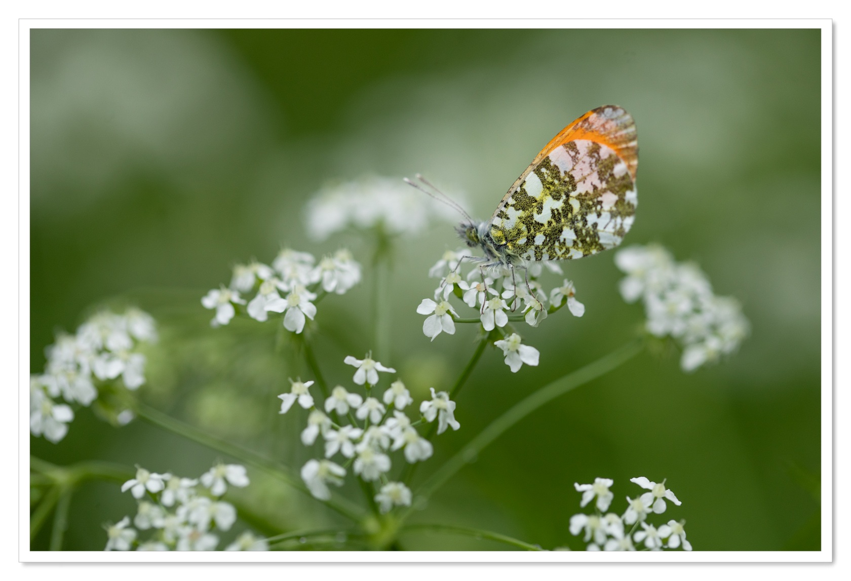 Ook een oranjetipje heeft de bloempjes van het fluitenkruid gevonden