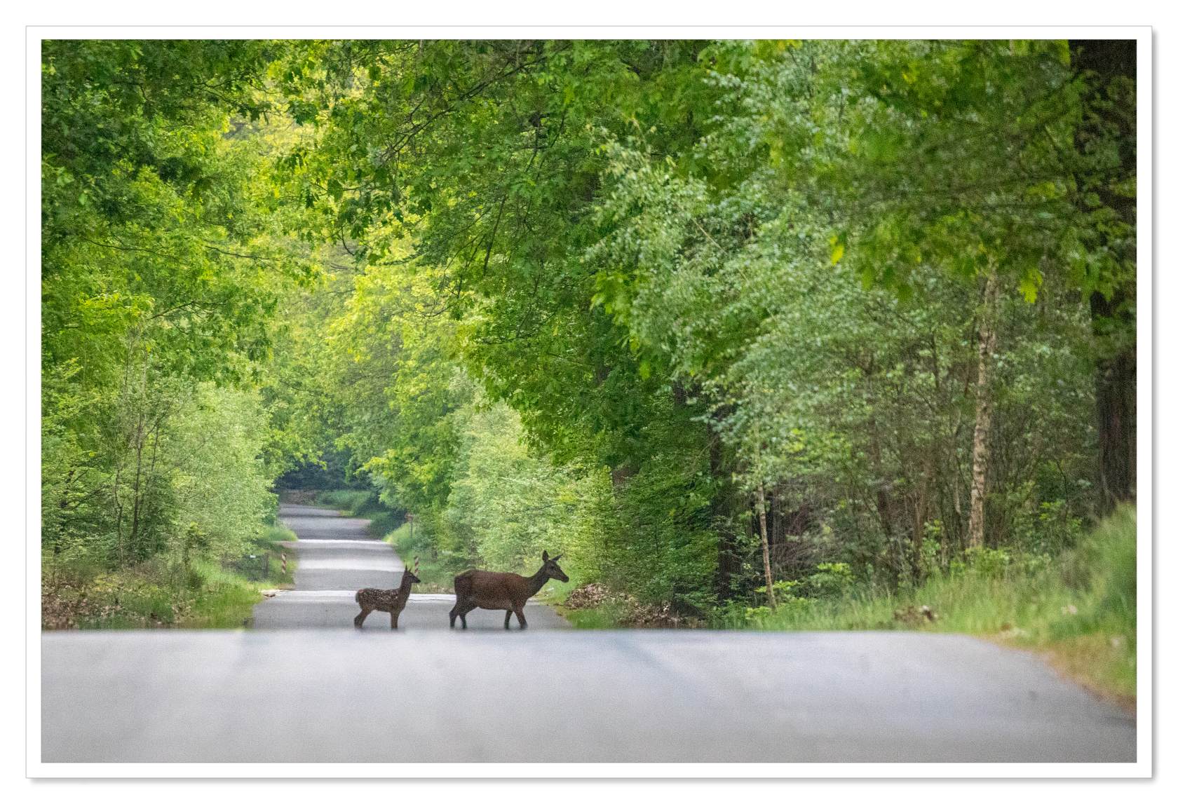 Zonder zich al te zeer te haasten, steken een hinde en haar jong de weg over. Gelukkig is er op dit vroege tijdstip geen verkeer. Bovendien is het zondag …..