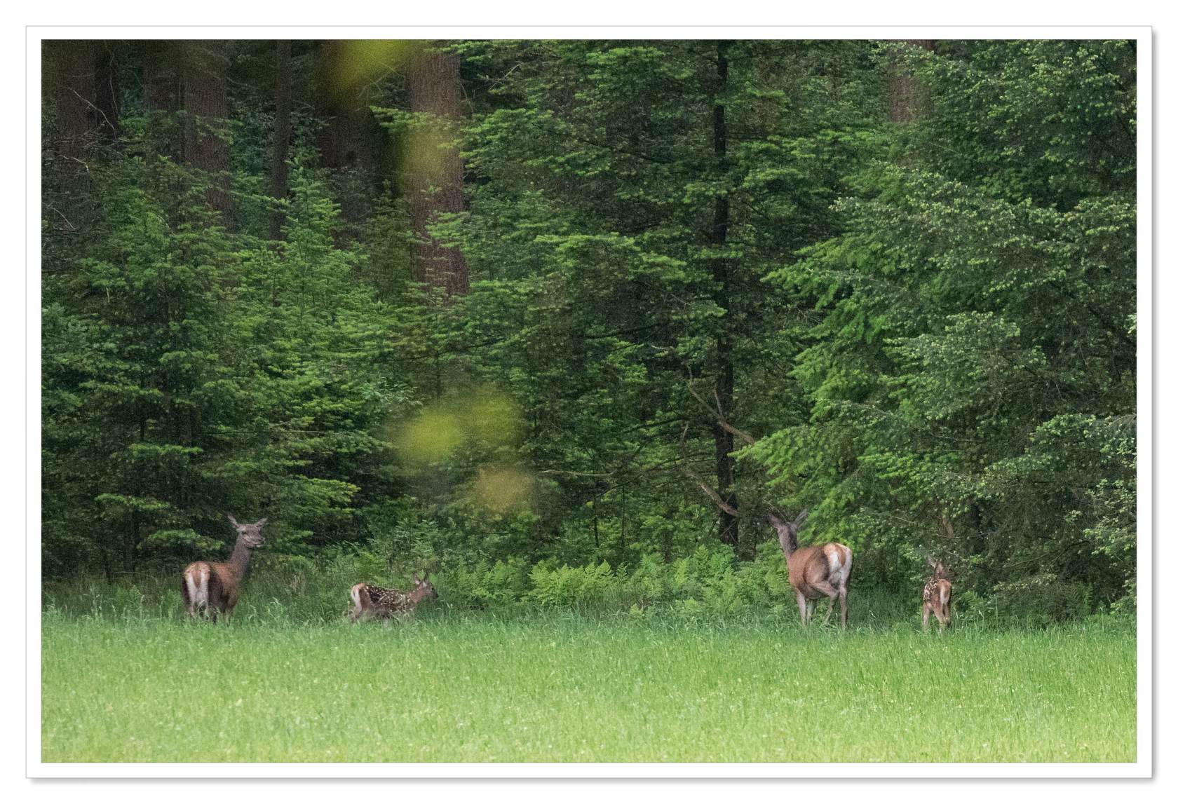 Aan de rand van het bos twee hindes en twee hertenjongen, genietend van het frisse groen. Onwetend dat îk sta te genieten van hèn ……