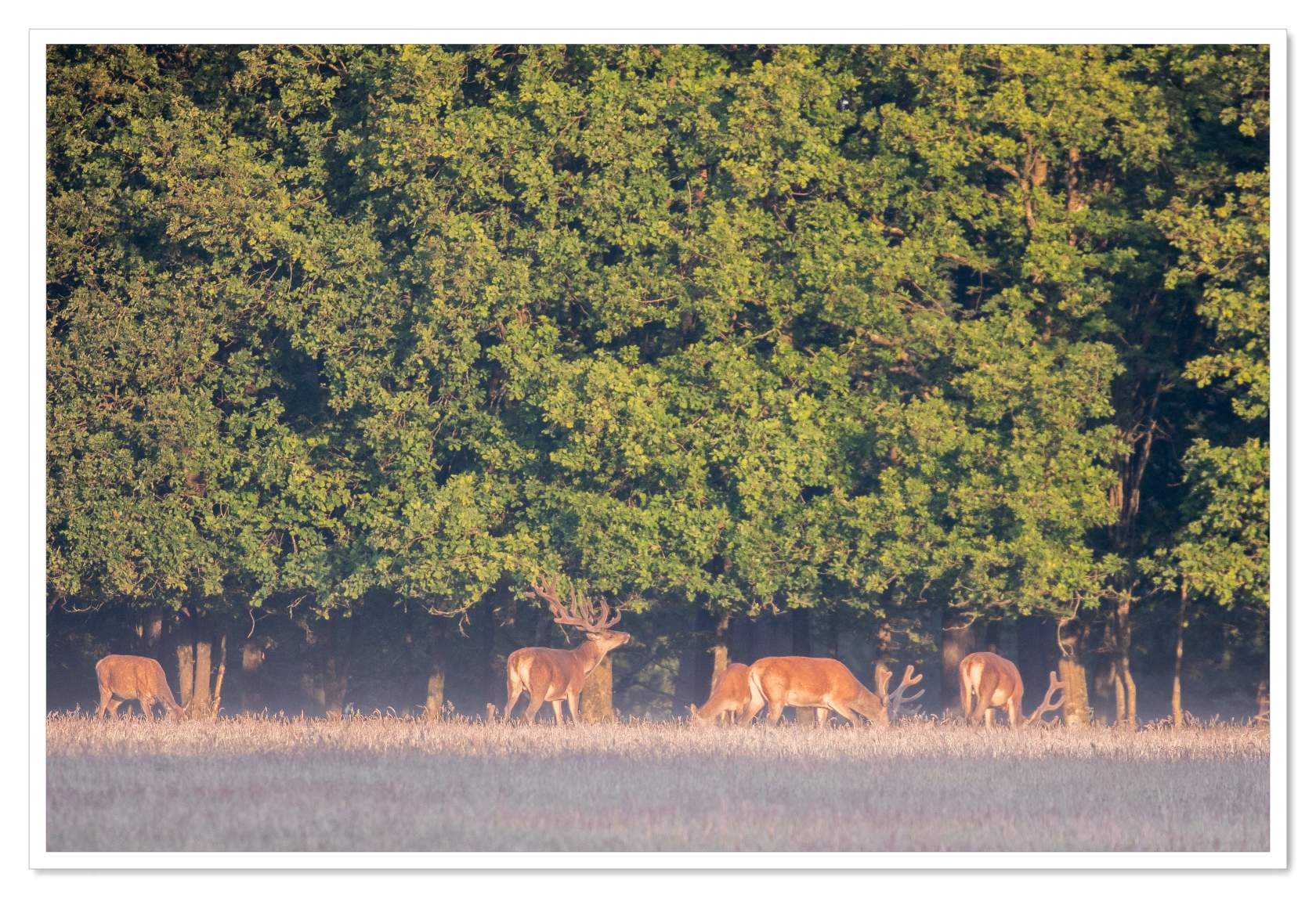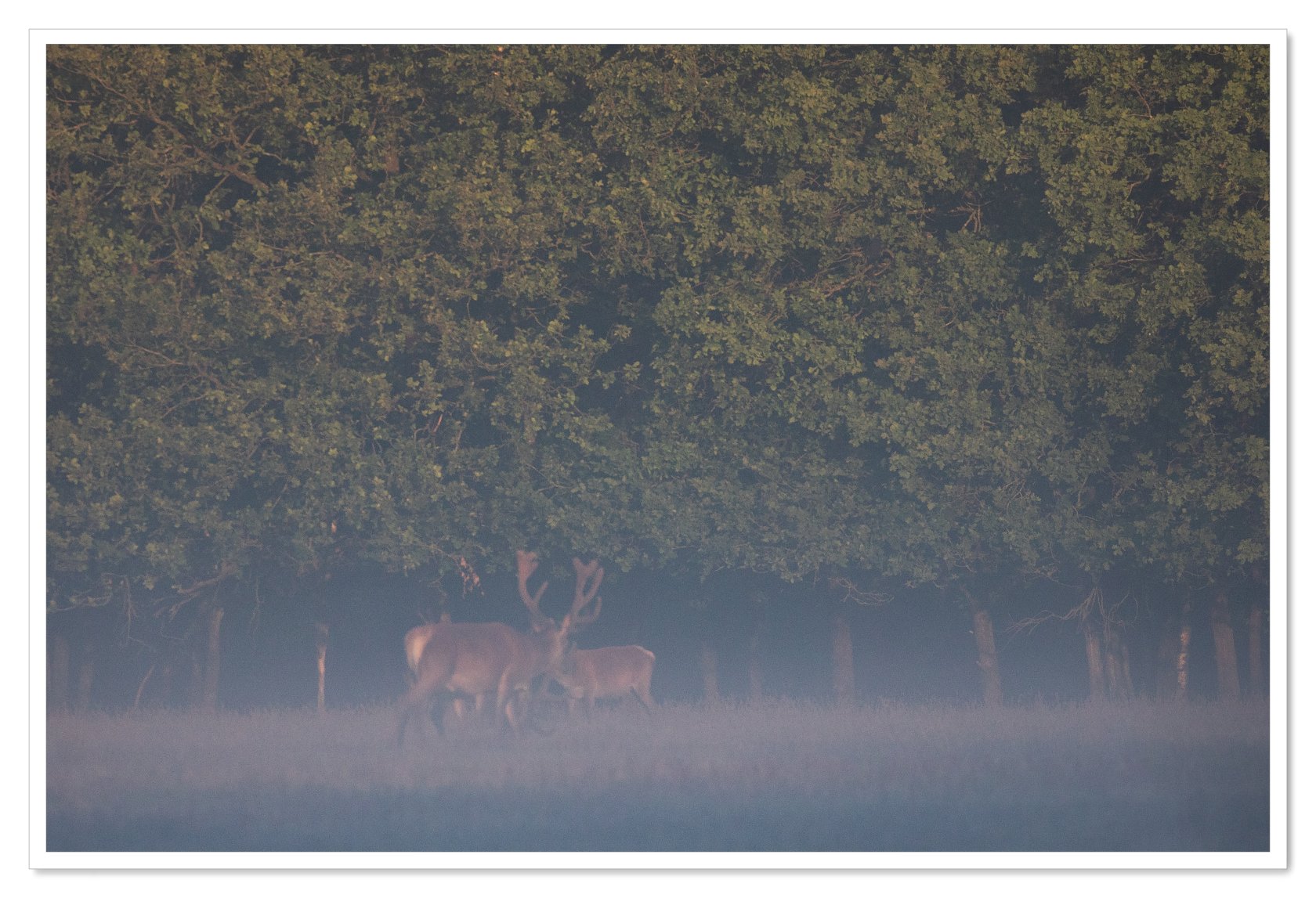Op een vroege ochtend zien we in de mist een groep herten staan, waarvan enkele mannen en waarvan een met een enorm gewei. Wij blijven verdekt staan in de hoop dat de mist optrekt ….