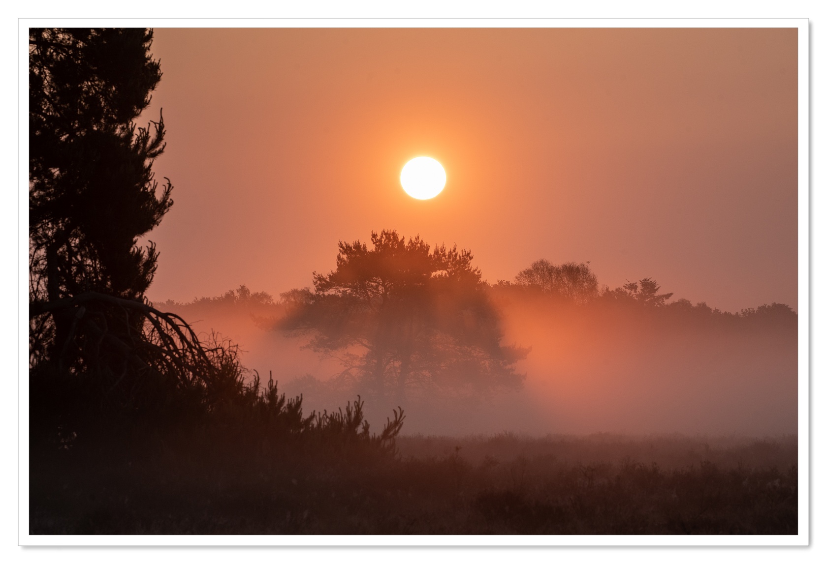 Was ik gisteren al lyrisch over de ontmoeting met de drie mannelijke edelherten, zo werd daar vanmorgen nog een schepje bovenop gedaan. Nou ja schepje….zeg maar gerust een hele kruiwagen vol. De ochtend begon al fantastisch. Zo konden wij onderweg nog net de zon mooi fotograferen die boven een met nevel bedekte heide verscheen. Wat een start van de dag!