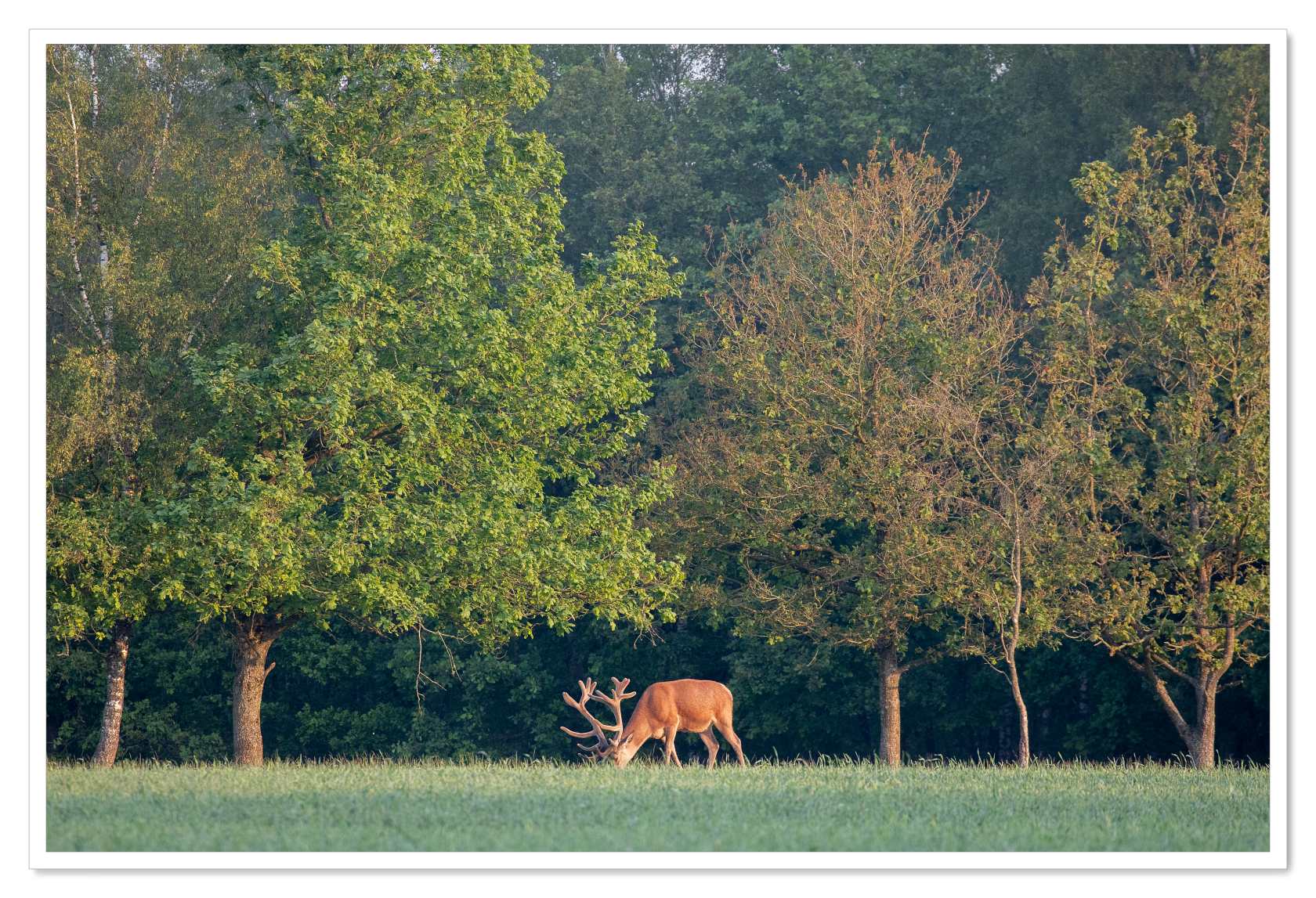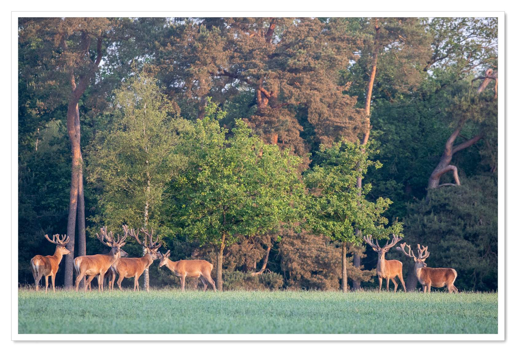 Even later bereikten wij de plek waar wij gisteren de 3 mannelijke edelherten uit de mist zagen verschijnen. Nu was er geen mist, maar werd de bosrand aan de overkant van de akker prachtig beschenen door de opkomende zon. Tot onze verbazing verschenen op nagenoeg dezelfde plek en tijdstip opnieuw 3 mannelijke herten. Dezelfde als gisteren? Nog groter werd onze verbazing toen er nog meer mannelijke exemplaren verschenen. Uiteindelijk verschenen er 12 stuks die in alle rust begonnen te grazen. Allemaal flink uit de kluit gewassen mannen met dito geweien.
