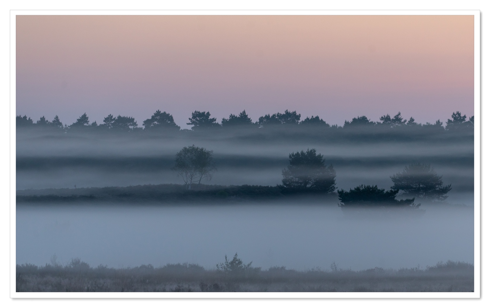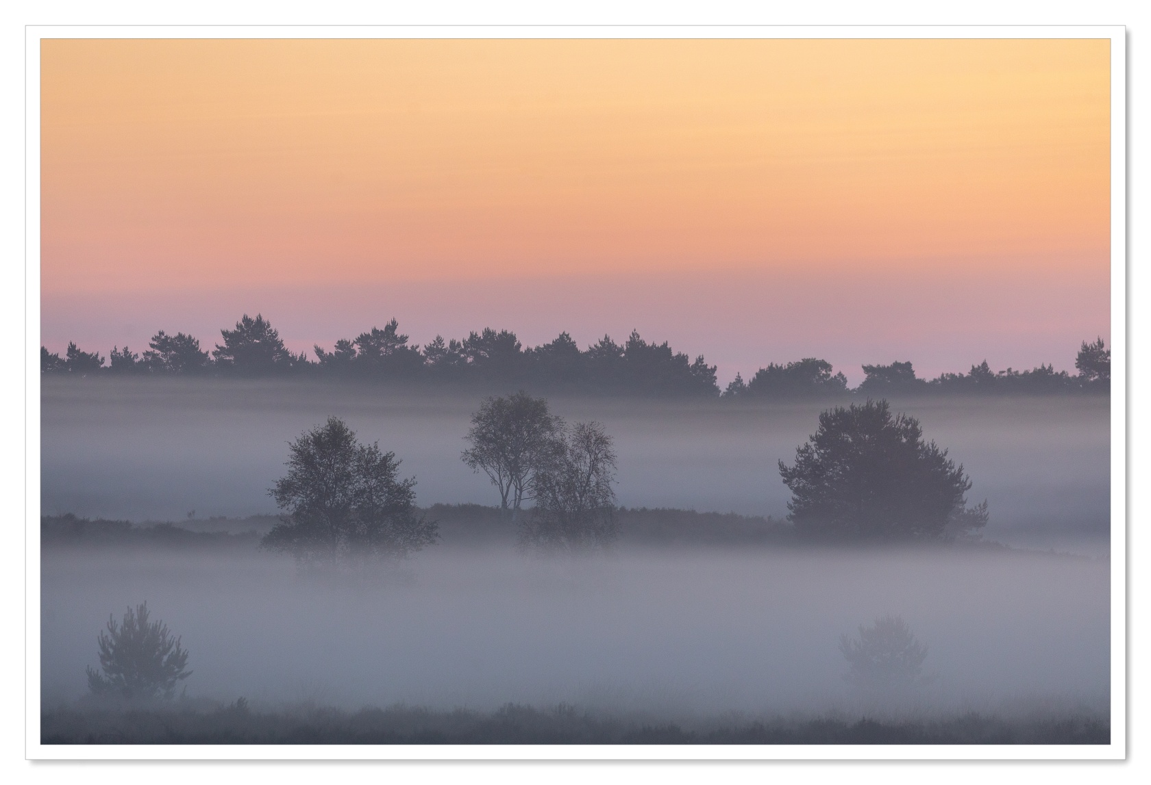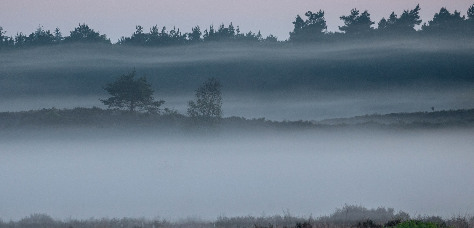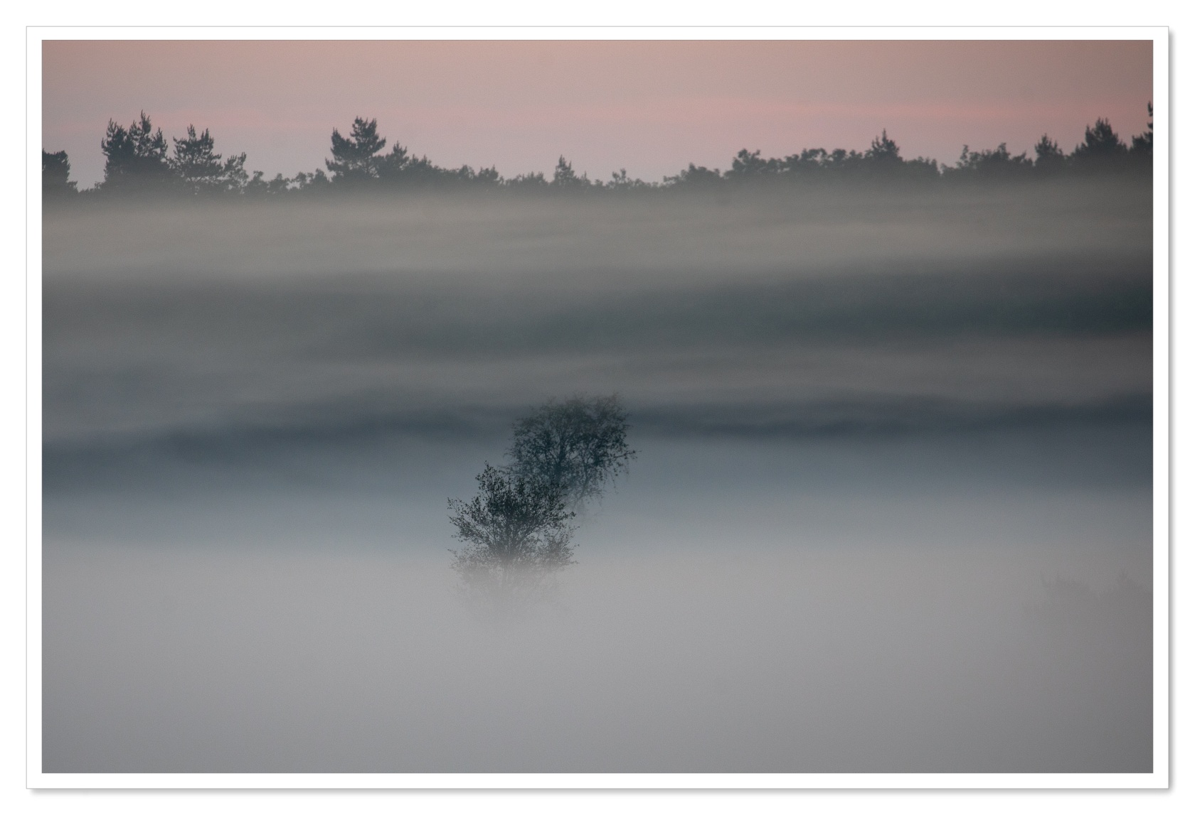 Twee boompjes op de `Gortelse heide doemen op in de nevellaagjes …….