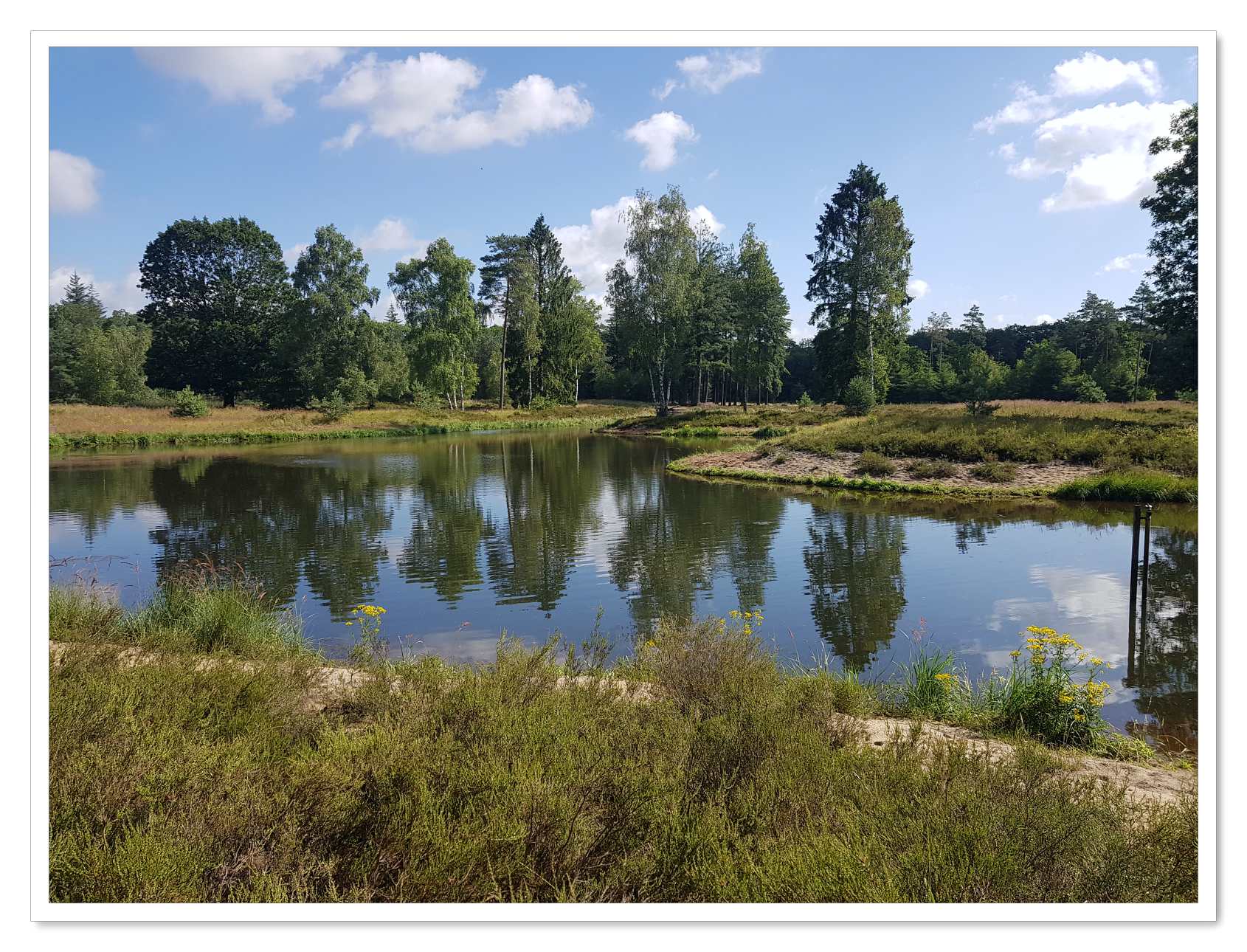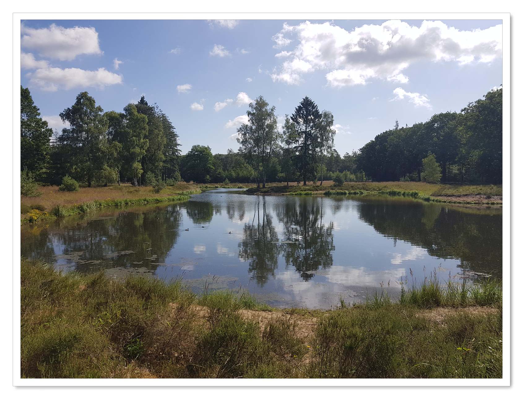 Sinds wij met grote regelmaat op de Veluwe verblijven, blijft de fiets niet vaak onaangeroerd. Met grote regelmaat stippel ik via Routiq, voorheen Route.nl, een fiets- of wandelroute uit. Op 11 juli ’23 reden wij een rondje Renderklippen met als startpunt de camping in Schaveren. Tijdens deze fietstour rijden wij, niet ver van de Renderklippen af, langs enkele prachtige waterpartijen. Ondanks dat wij hier in deze omgeving al wat fietsroutes hebben afgelegd, is deze plek nieuw voor ons. Het zijn aangelegde infiltratievijvers voor de drinkwatervoorziening voor enkele plaatsen in de Gemeente Epe.