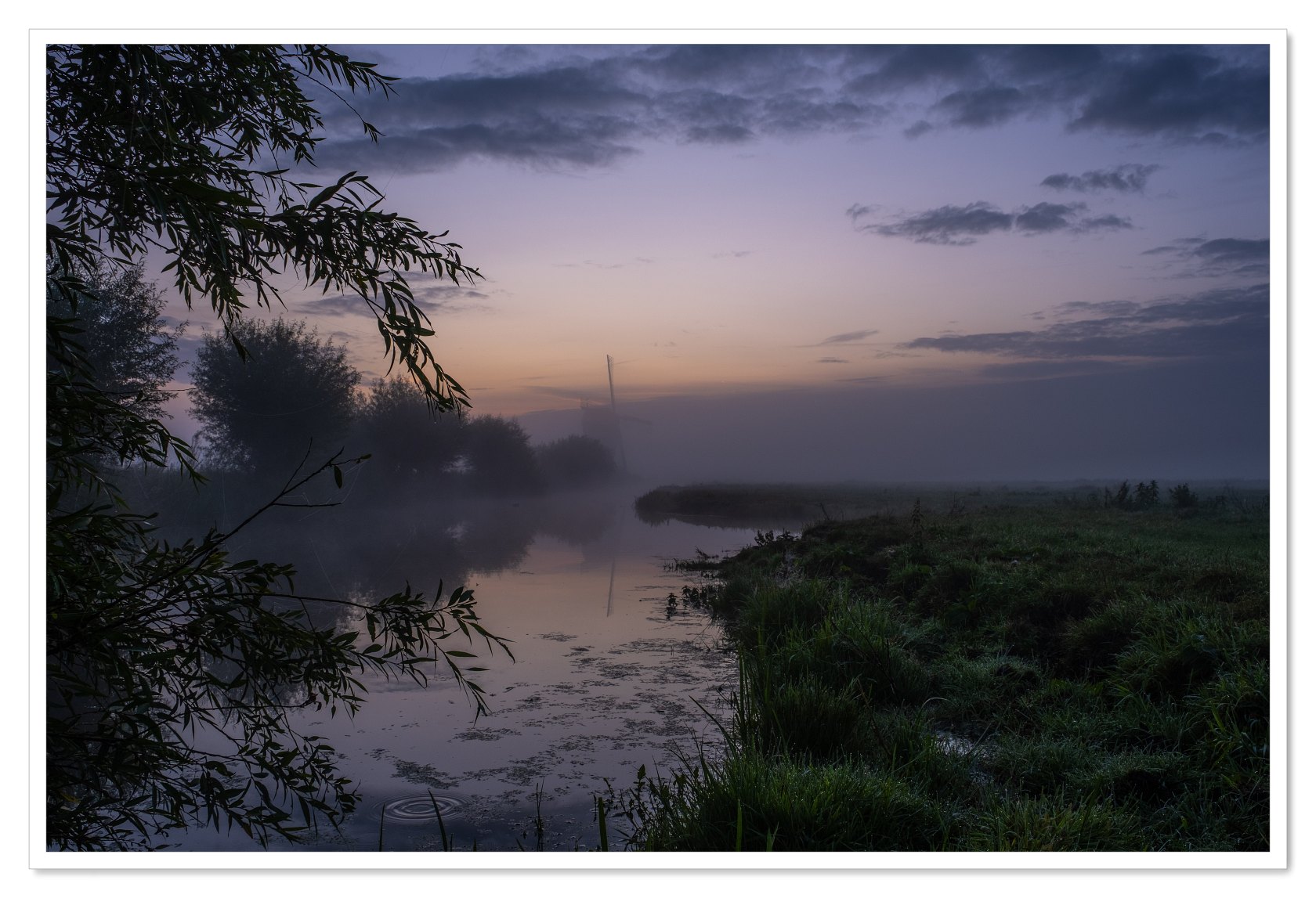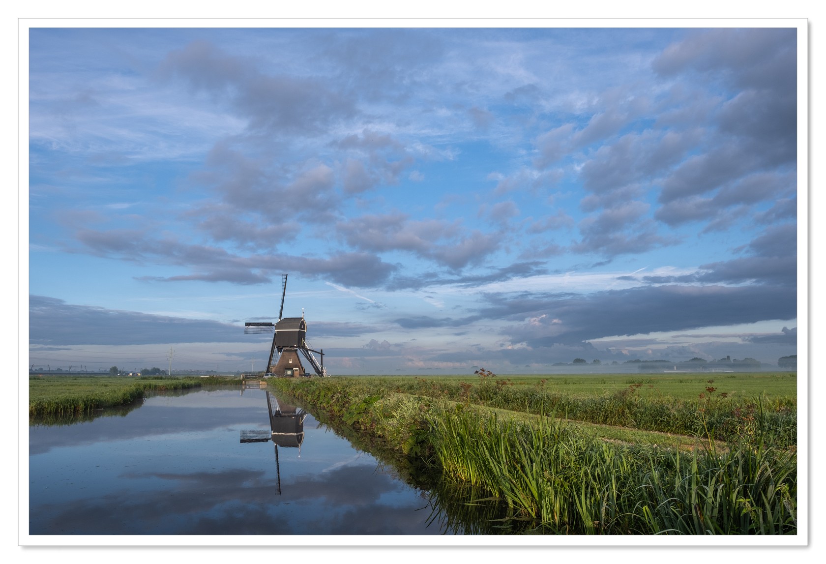 Vanmorgen eindelijk weer eens voor dag en dauw op pad. En eindelijk ook weer eens om een geliefd onderwerp te fotograferen; een molen. De Tiendwegse Molen om precies te zijn. Een wipmolen in de polder bij Hardinxveld Giessendam. Een prachtige molen gelegen aan de en hoe kan het ook anders, de Tiendweg. De molen is via deze Tiendweg van twee zijden benaderbaar. Zo is er een korte route van goed 500 meter en een langere route van ca anderhalve kilometer. Ook nu kies ik voor de langere route. Dit omdat hier bij het begin een parkeermogelijkheid is terwijl die aan de andere zijde ontbreekt. Bovendien is het geen straf om over het smalle dijkje te lopen. Deze wordt aan weerszijden geflankeerd door oude wilgen die op deze ochtend vol in het blad staan. Dit plus het hoge en natte gras, bemoeilijkt het lopen enigszins. Even voor zonsopkomst kom ik aan op de plek vanwaar ik de molen graag fotografeer.