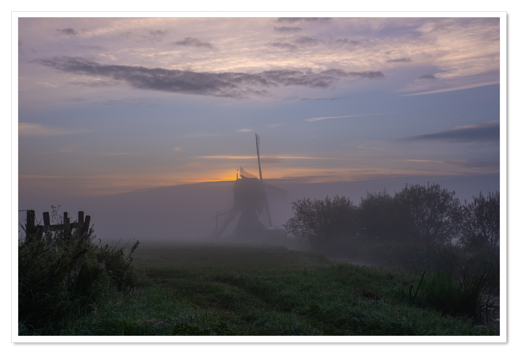 Helaas is de mist zo dik dat de molen nauwelijks zichtbaar is. Maar niet getreurd, de Tiendwegse Molen is aan deze zijde op meer plekken mooi te fotograferen. Maar ook daar blijft de molen voor het grootste deel verscholen in de mist. Als ik mij omdraai, dan zorgt daarentegen de nevel en de opkomende zon voor een fraai beeld van de Tiendweg. Bovendien zijn ook de wolkenluchten in combinatie met de landelijke omgeving goed voor heel erg fraaie beelden.