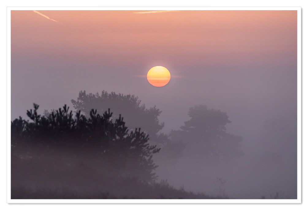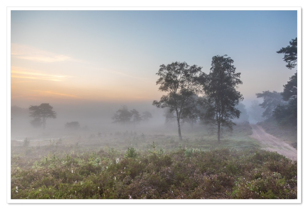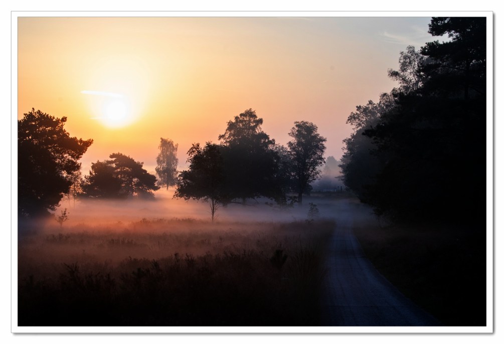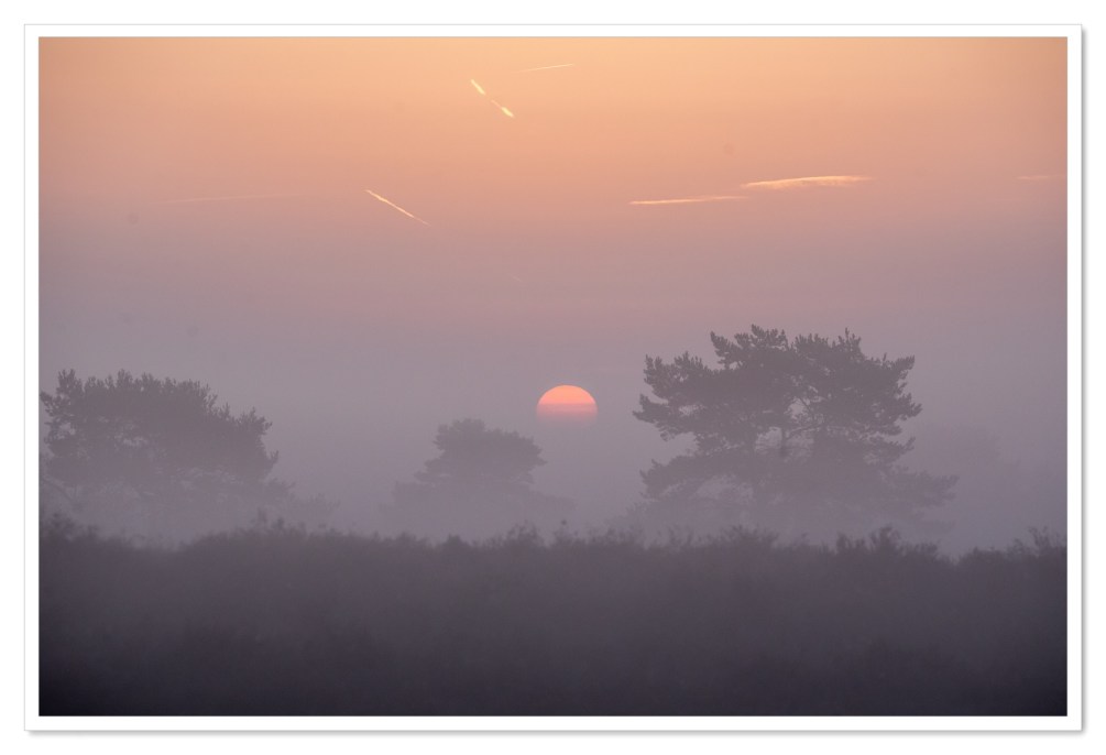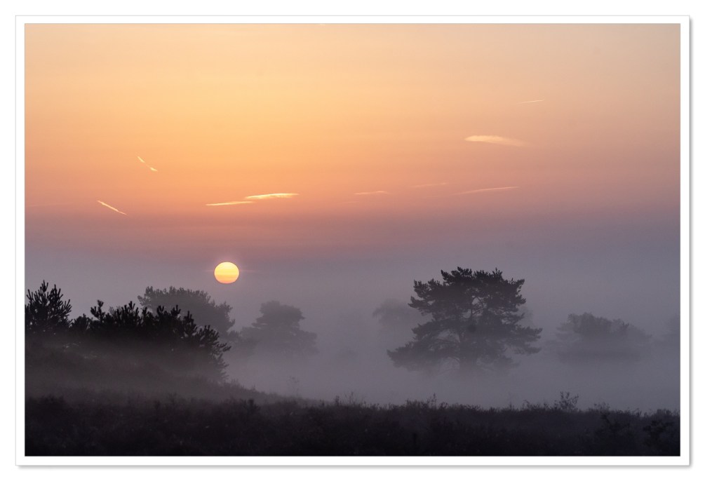 Onlangs waren wij vier dagen in ons buitenverblijf op de Veluwe. Drie ochtenden daarvan ging ruim voor dag en dauw mijn wekker en iedere keer dat ik mijn neus buiten de caravandeur stak was het mistig. Samen met met mijn foto kameraad Lennie bezocht ik twee van die drie ochtenden, respectievelijk de Tongerense Heide en de Gortelse Heide. Beide heidegebieden, onderdeel van Kroondomein Het Loo, liggen in elkaars verlengde. Toch kozen wij iedere ochtend voor een ander heidegebied en dat was maar goed ook. Nu konden wij namelijk volop genieten van de prachtige sfeer, gecreëerd door de opkomende zon en de mist, zonder van gebied naar gebied te fietsen.