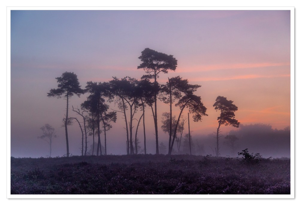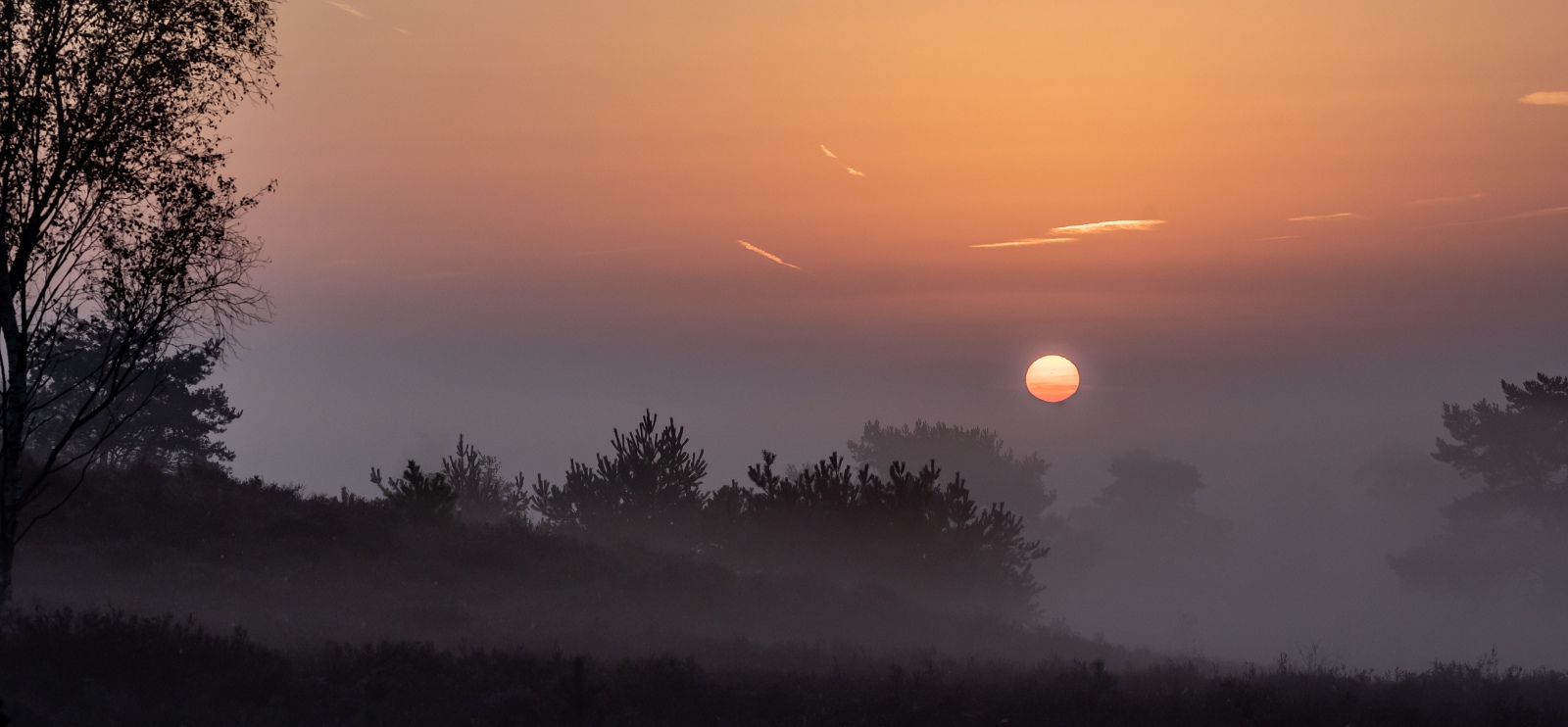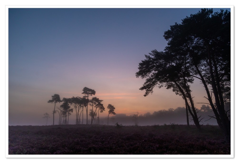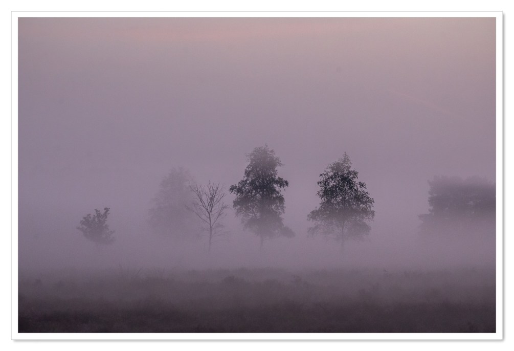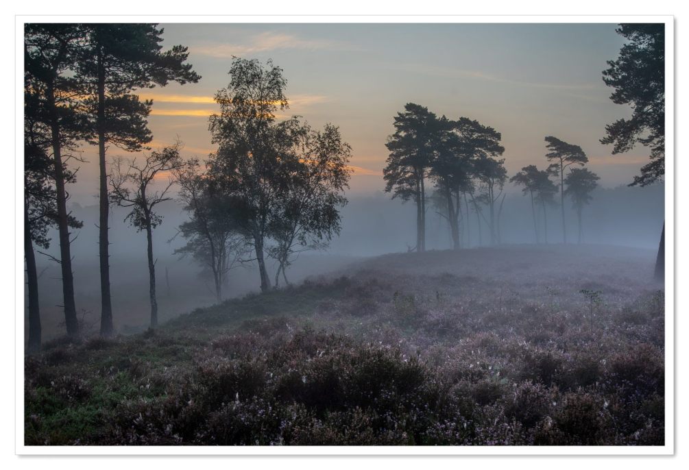 Onlangs waren wij vier dagen in ons buitenverblijf op de Veluwe. Drie ochtenden daarvan ging ruim voor dag en dauw mijn wekker en iedere keer dat ik mijn neus buiten de caravandeur stak was het mistig. Samen met met mijn foto kameraad Lennie bezocht ik twee van die drie ochtenden, respectievelijk de Tongerense Heide en de Gortelse Heide. Beide heidegebieden, onderdeel van Kroondomein Het Loo, liggen in elkaars verlengde. Toch kozen wij iedere ochtend voor een ander heidegebied en dat was maar goed ook. Nu konden wij namelijk volop genieten van de prachtige sfeer, gecreëerd door de opkomende zon en de mist, zonder van gebied naar gebied te fietsen.
