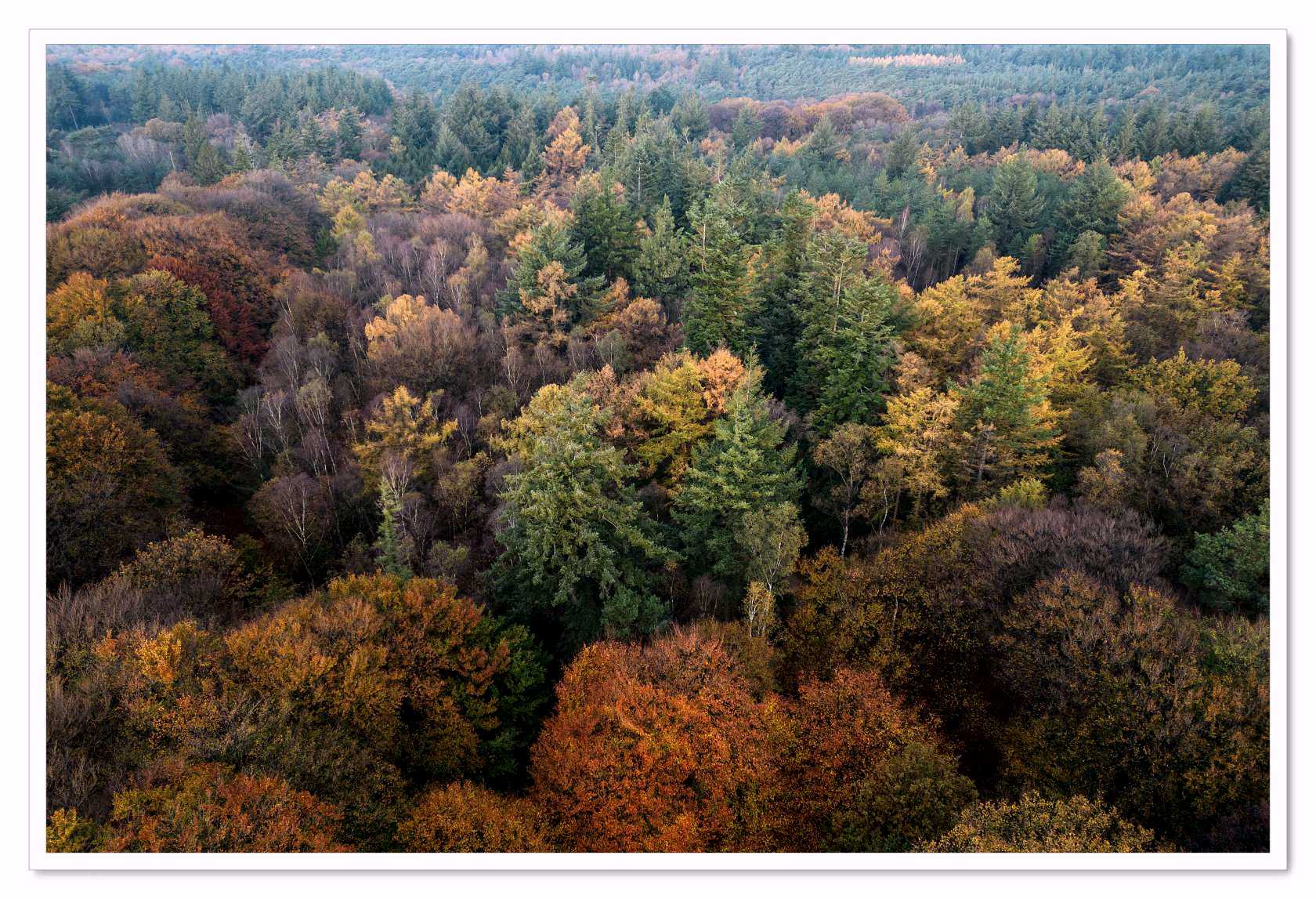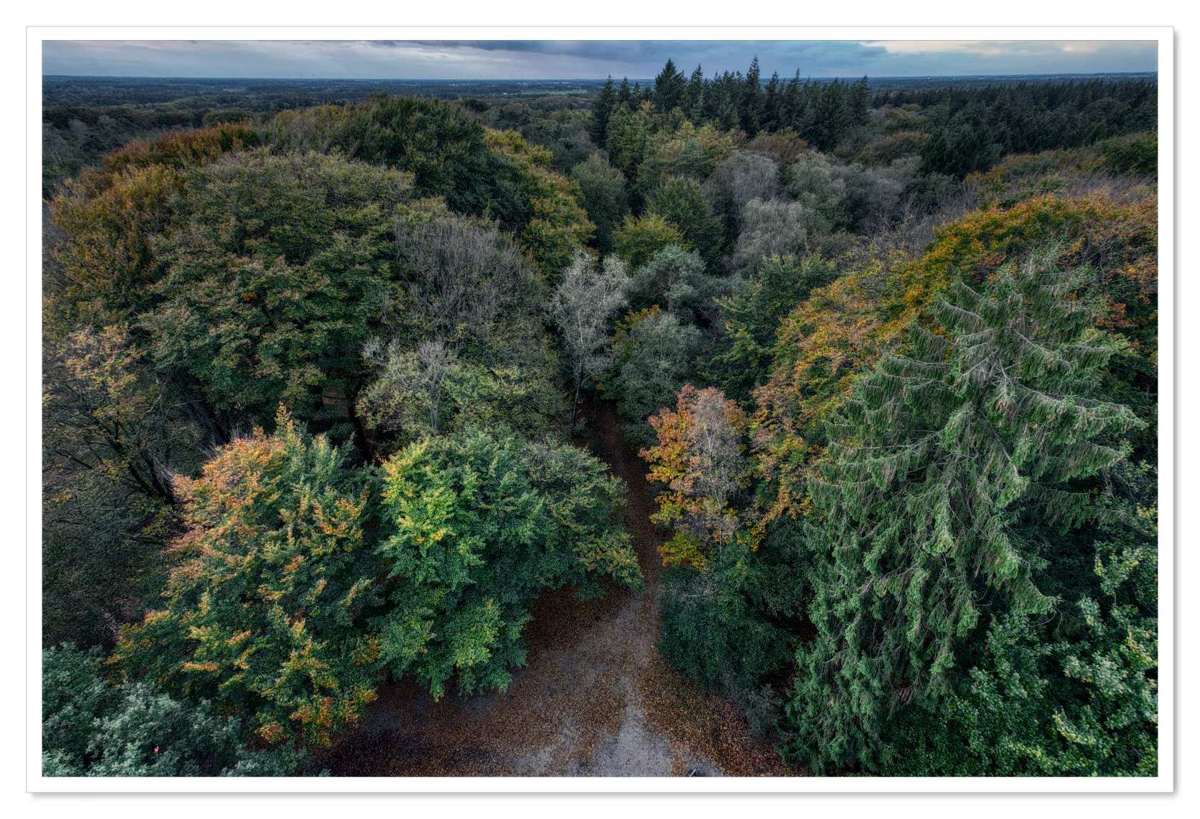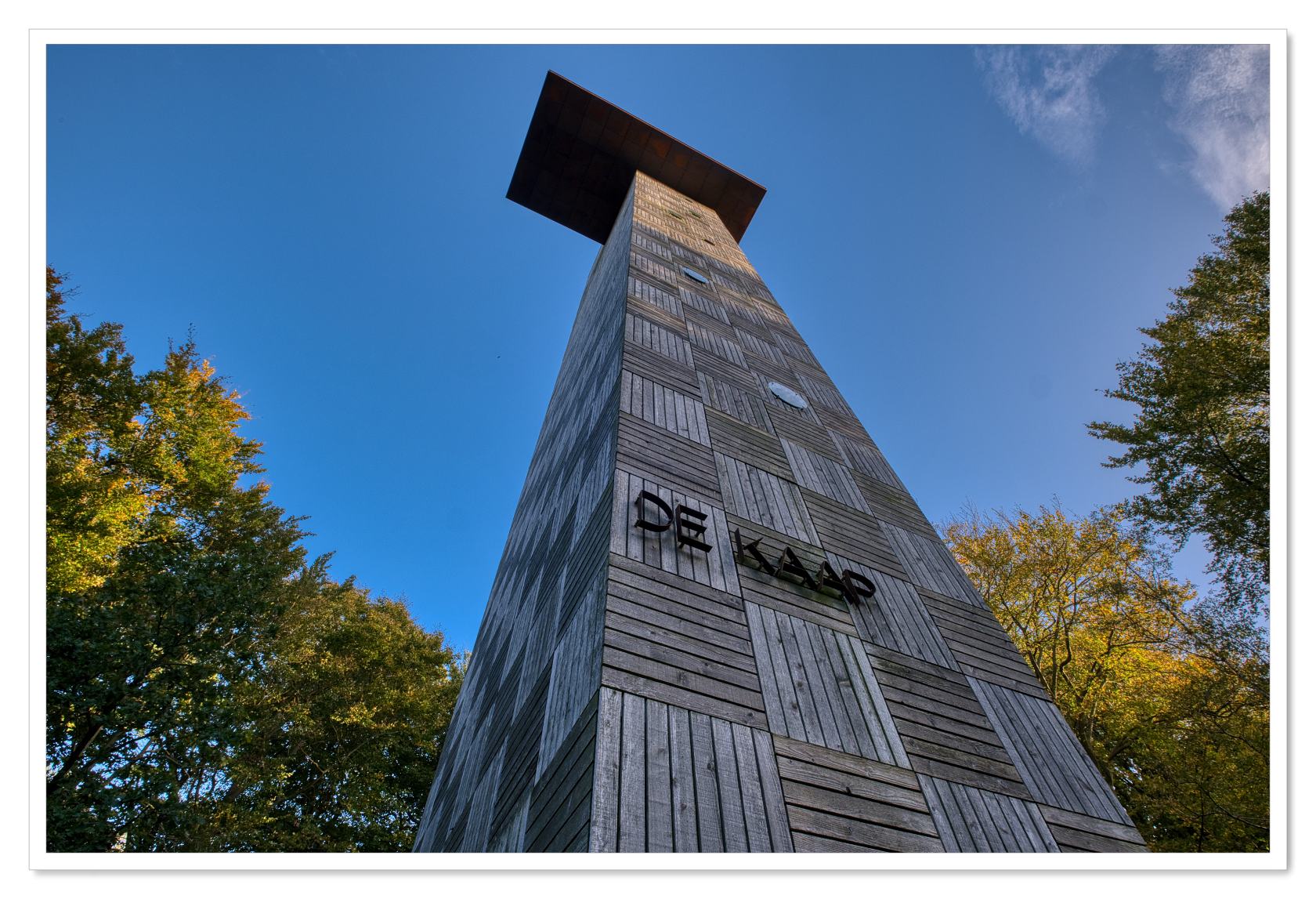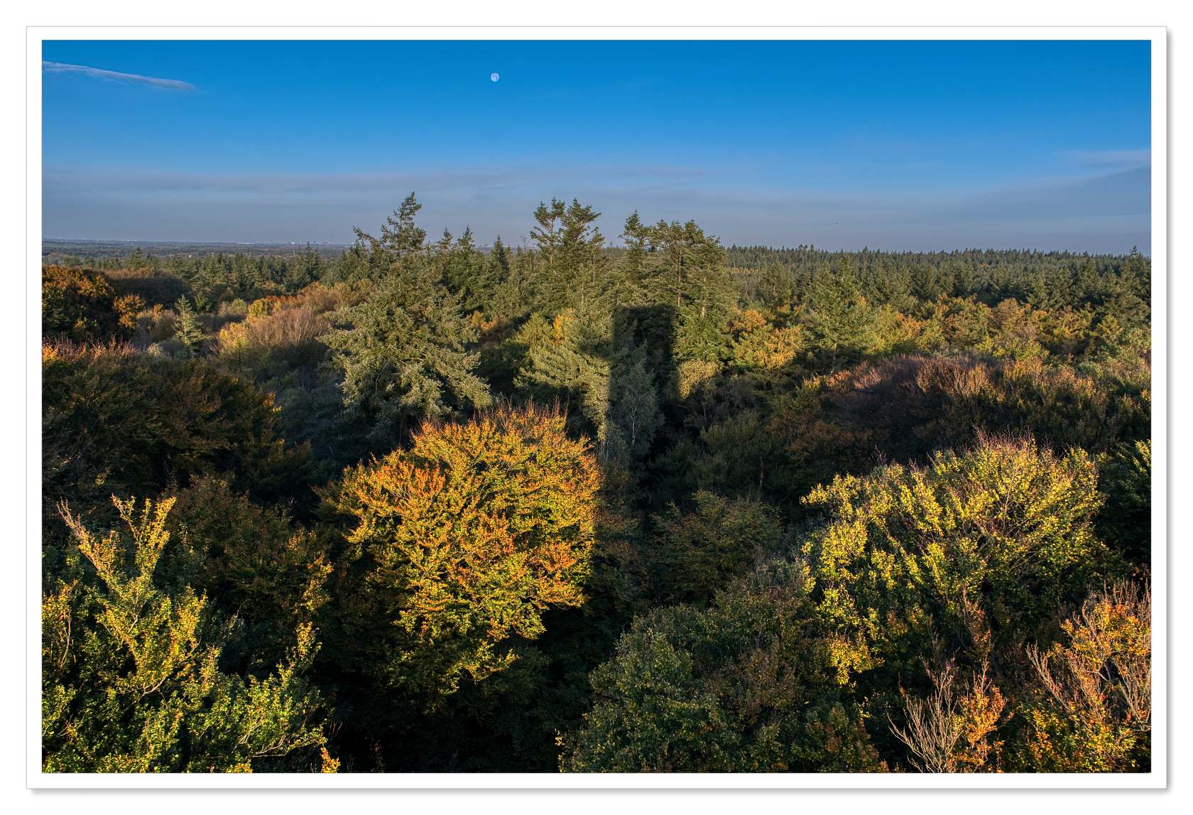 Behalve dat ik de laatste tijd veel met mijn neus op de bosbodem van de Kaapse Bossen lig om paddenstoelen te fotograferen, bekijk ik het bos ook graag vanaf een hoogte. Twee middelen staan mij daarvoor ter beschikking. Ten eerste Toren de Kaap, een 25 meter hoge uitkijktoren, die bovendien op een 40 meter hoge heuvel staat. Zo sta je, als je eenmaal alle traptreden hebt overwonnen, op 65 meter hoogte en dat is ruim boven de bomen. Een onvergetelijk uitzicht met enorme vergezichten bij helder weer. De herfst voegt aan dit prachtige uitzicht nog een extra kleurpallet toe.