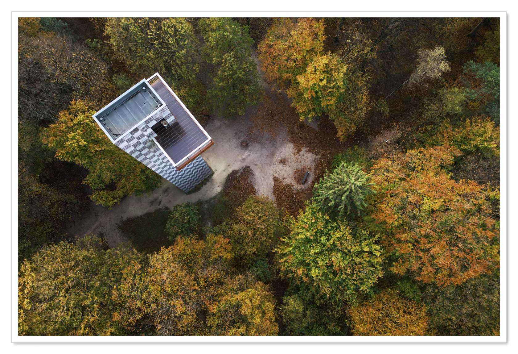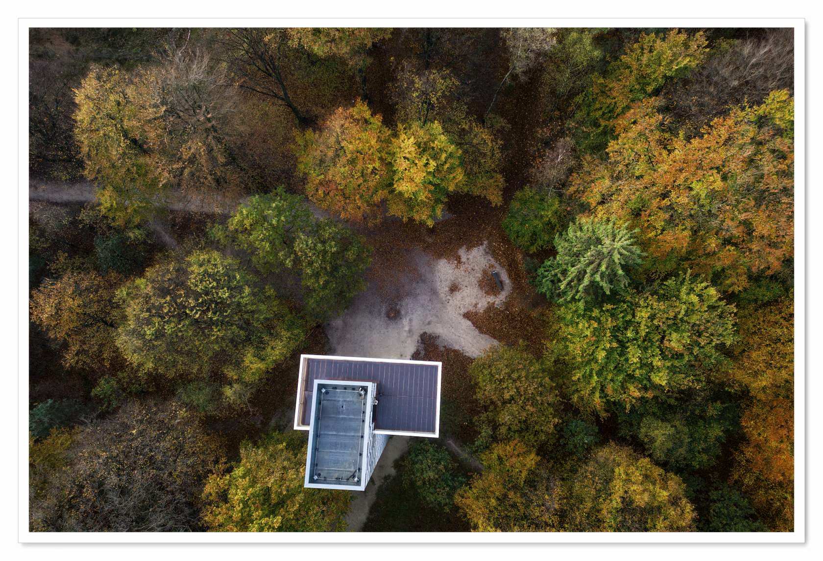 Het tweede middel dat mij ter beschikking staat is mijn DJI Mini 3 Pro drone. Heel kort laat ik mijn 248 gram wegende drone het luchtruim kiezen vanaf het platform van de toren. Het is nog vroeg, er is niemand te zien of te horen rond de toren. Slechts vijf minuten zijn wat mij betreft meer dan genoeg om een paar opnames te maken van de toren en de Kaapse Bossen van bovenaf. Oh ja, ik ben mij er van bewust dat er boven de Kaapse Bossen niet met een drone gevlogen mag worden. Die ochtend sta ik dus voor een dilemma, waarbij uiteindelijk de verleiding om toch heel even te vliegen het grootst is …….