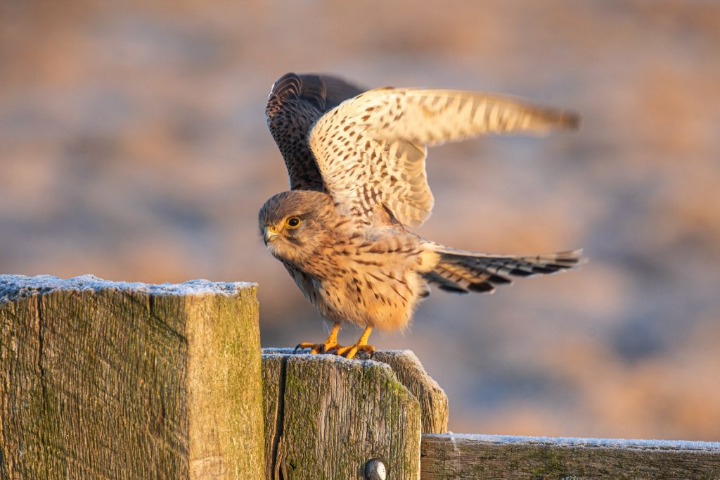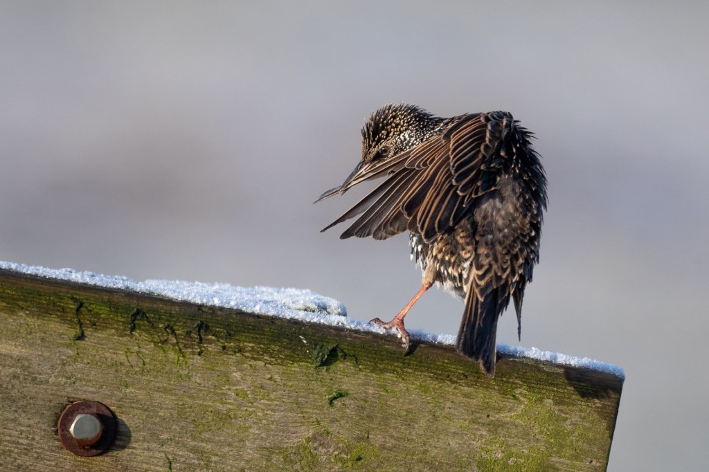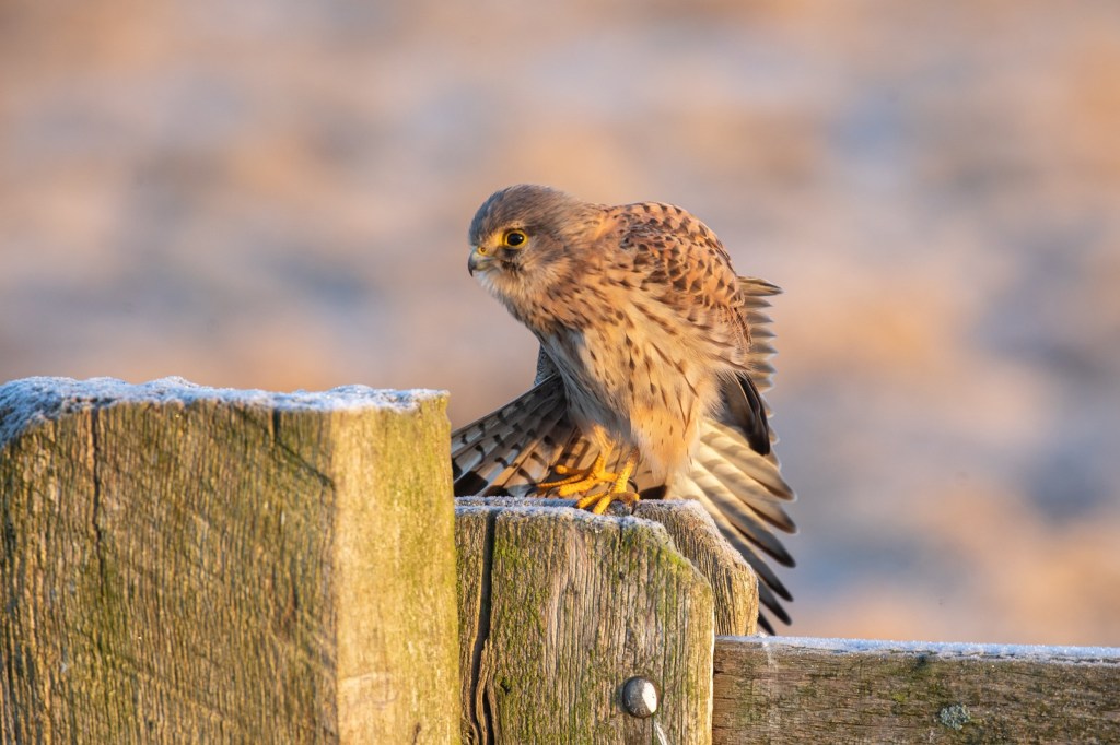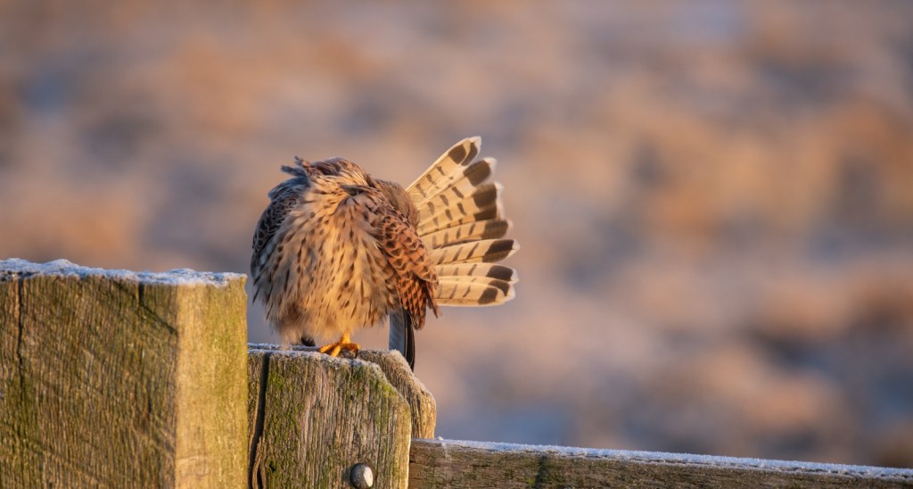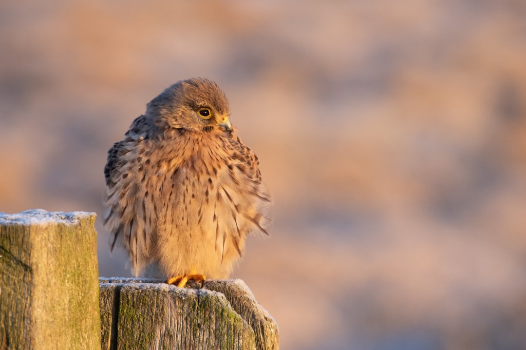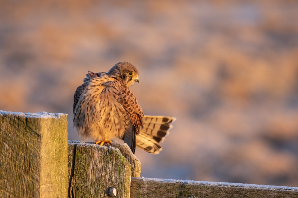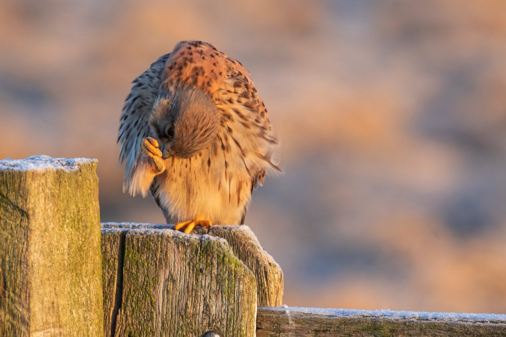 Als ik vanmorgen vroeg wil vertrekken, moet ik de auto eerst ontdoen van een flinke laag sneeuw. De hoop op mooie winterse foto’s van een torenvalk in de Arkemheenpolder groeit daarmee. Het is glibberen en glijden naar de snelweg en ook daar is het oppassen geblazen. Halverwege de rit is plotseling de sneeuwlaag verdwenen en die situatie is in Arkemheen hetzelfde: geen sneeuw helaas. Gelukkig zie ik wel een torenvalk op een hek zitten. Het dier maakt geen aanstalten om te vertrekken, maar geniet zichtbaar van de opkomende zon. Ook ik heb zeker geen haast. Het begint zich zelfs uitgebreid te poetsen en ik permitteer mij de vrijheid om het dier daarbij te fotograferen. Na de poetsbeurt vertrekt de valk. Waarschijnlijk gaat het op zoek naar iets eetbaars voor diens ontbijt. Als de valk na een half uur wachten niet terugkeert, vertrek ook ik met opnieuw een hele lading fijne foto’s.