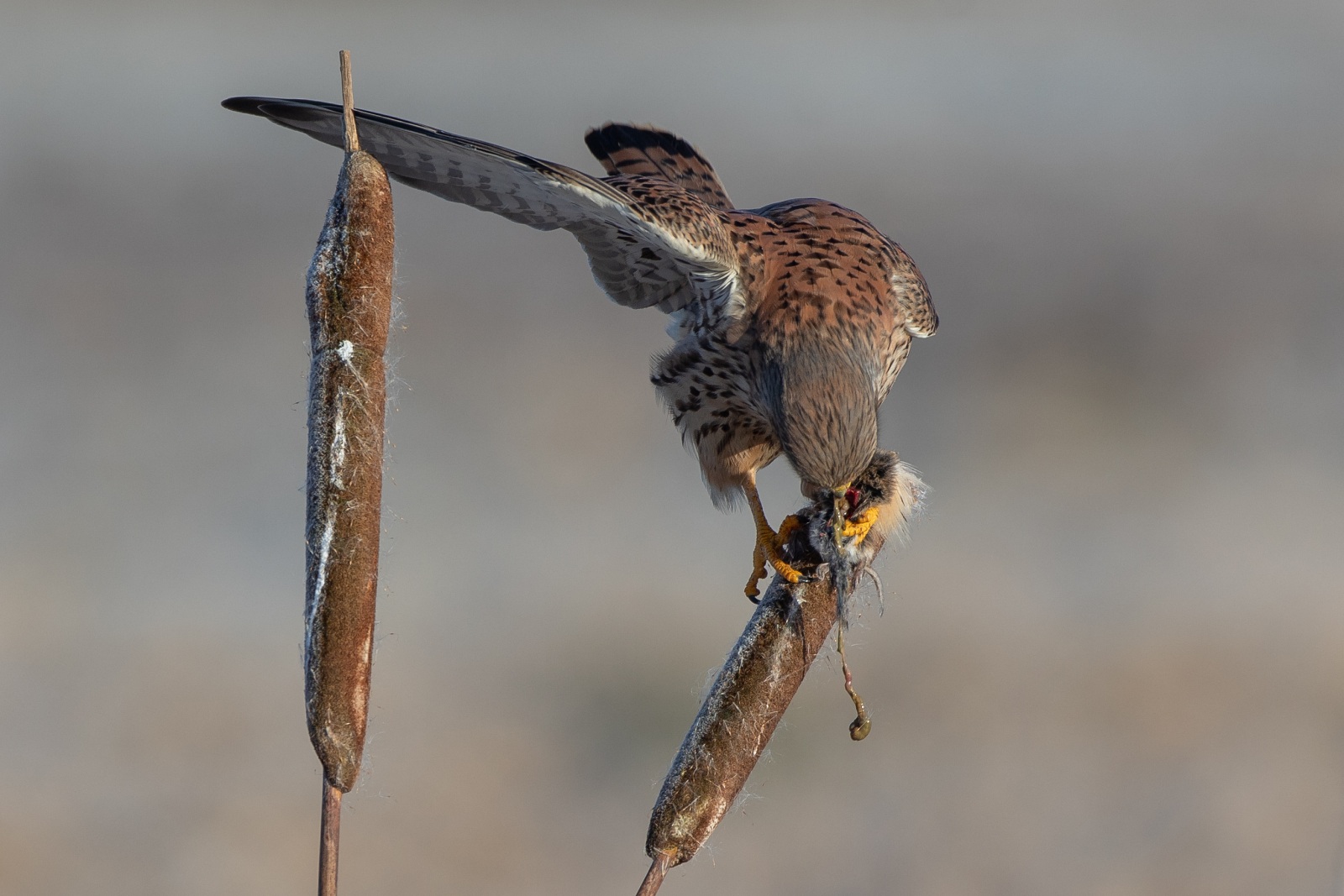 Schitterend om zien hoe jij je plaatsen steeds wederom weet te vinden om welbepalende soorten te kunnen waarnemen en fotograferen. Een torenvalk op een lisdodde balancerend, en dan nog een hapje eten. Buitengewoon prachtige foto’s Hans.