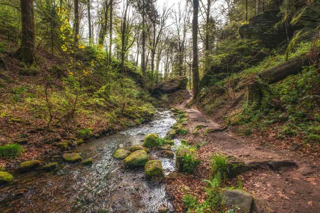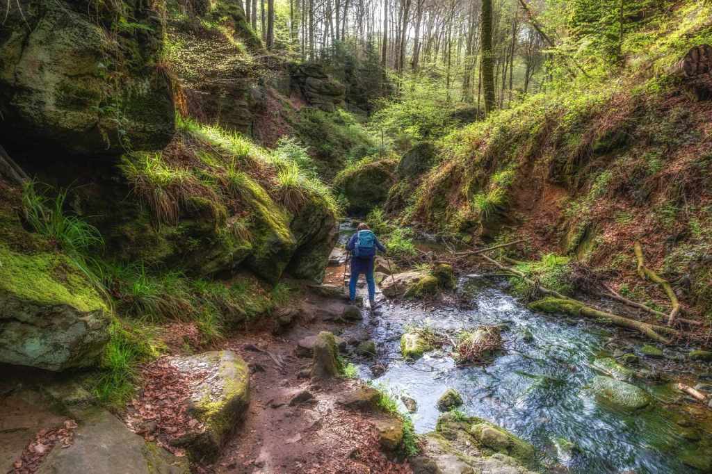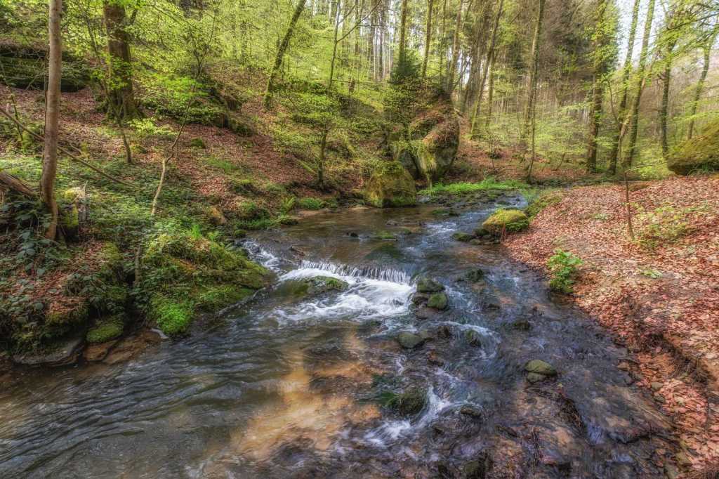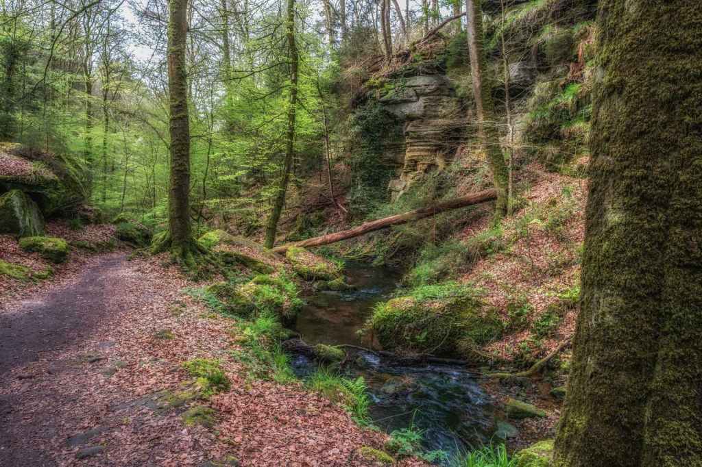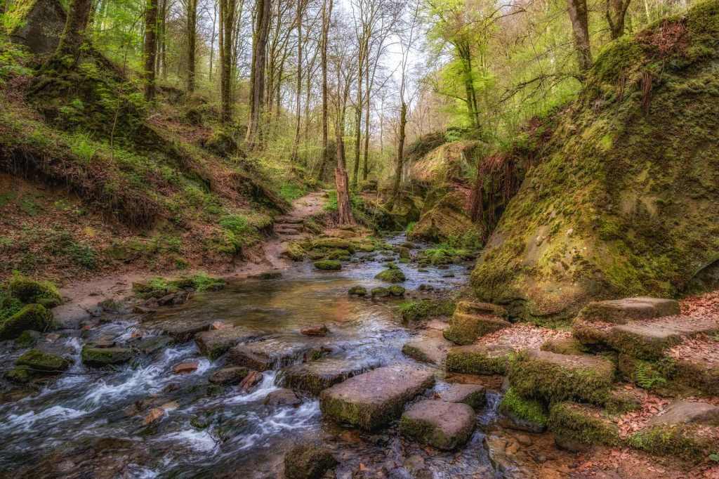 Op de derde ochtend in Luxemburg kozen wij om een wandelroute te starten vanuit het hotel. Het is slechts enkele meters lopen naar het Chateau Beaufort waar tegenover het pad begint. Direct voert de route ons langs een stromend beekje dat zijn weg vindt door een sprookjesachtige groen dal. Het is werkelijk genieten van het begin tot het einde van deze geweldig mooie route. Een route waarbij het pad langs de beekjes dan weer goed te lopen is en dan weer enige klimmen en klauteren van ons vraagt. Zelfs mogen wij de beek oversteken via stapstenen, hetgeen het adrenaline peil licht doet stijgen. Na ruim 11 kilometer genieten eindigen wij weer bij het hotel.
