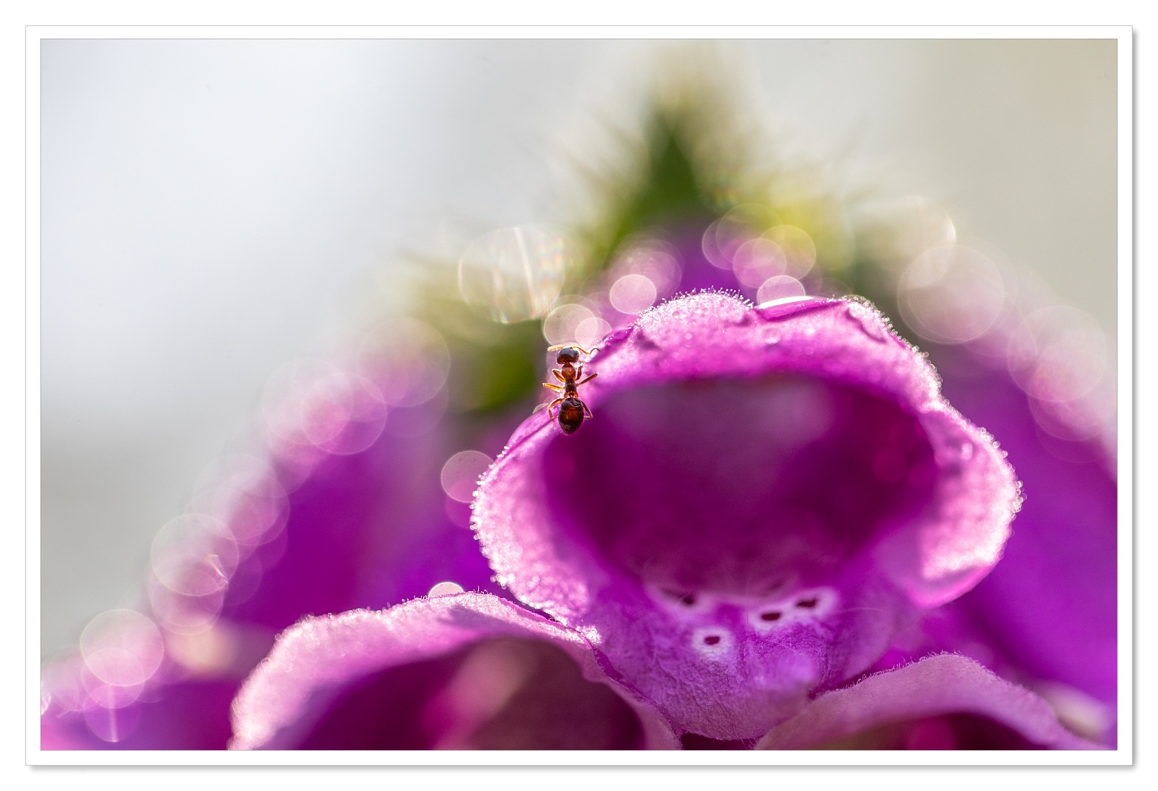 Normaal gesproken maak ik close up foto’s met mijn 100-400mm lens. Hiermee kan ik van de minimale afstand van 1.75 meter, geheel ingezoomd, mooie close up’s maken. Dit voorkomt verstoring van bijvoorbeeld een vlinder, maar ook het beschadigen van rondom gelegen vegetatie. In het geval van de foto van de mier op de digitalis gebruikte ik mijn 100 mm macrolens om zo 1 op 1 opnames van heel dichtbij te kunnen maken. Bovendien zakte ik door mijn knieën om zo op ooghoogte te komen van zowel de mier als de bloem. De foto maakte ik uit de hand.