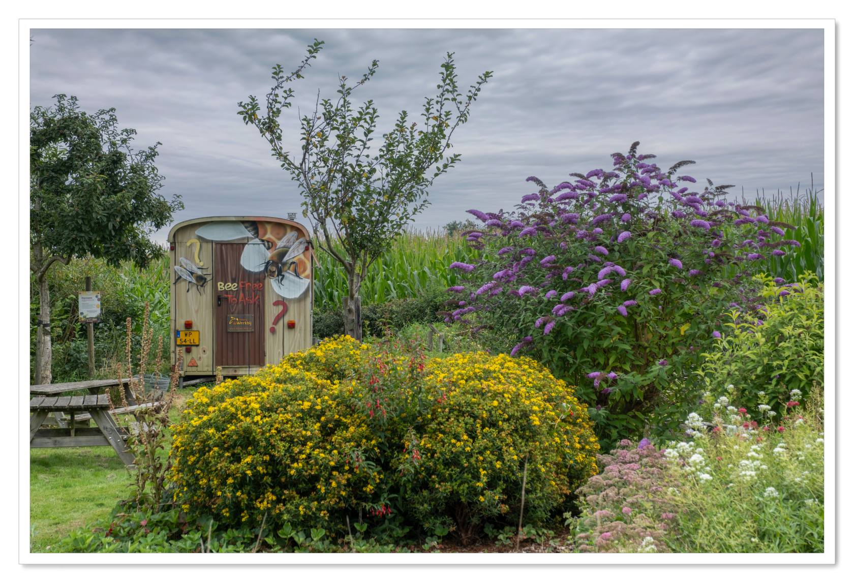 Niet alleen voor een pot (of meerder potten) heerlijke echte honing fietsen wij graag naar Imkerij De Werkbij nabij Vaassen. Nee, in de tegenoverliggende natuurtuin De Gatherhof maken wij tijdens deze fietstocht graag gebruik van het Rustpunt in de heerlijke tuin. Naast een aantal tafels met banken staat er ook een zigeunerwagen of ook wel Pipowagen genoemd. Hier kun je aan een tafel zitten en gebruikmaken van kopje koffie of thee en is er veel informatie over bijen en honing te vinden. De natuurtuin zelf heeft veel te bieden waaronder een aantal delen waar geplukt mag worden. De bloemen trekken insecten aan en zijn hier goed fotografeerbaar. Helaas is de tuin dit jaar minder fleurig door de schommelingen in het weer. Daarom zijn er vandaag geen vlinders, maar is de ambiance toch goed voor enkele foto’s….