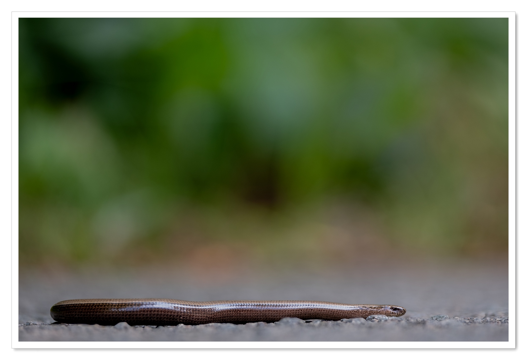 Een flink uit de kluiten gewassen hazelworm is het 1e overstekende wild dat wij tegenkomen. Oversteken laten wij het echter niet, maar dirigeren het weer het bos in.