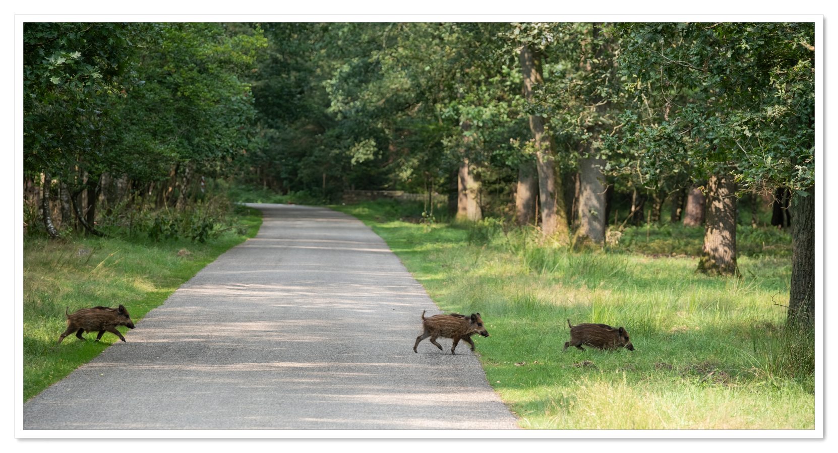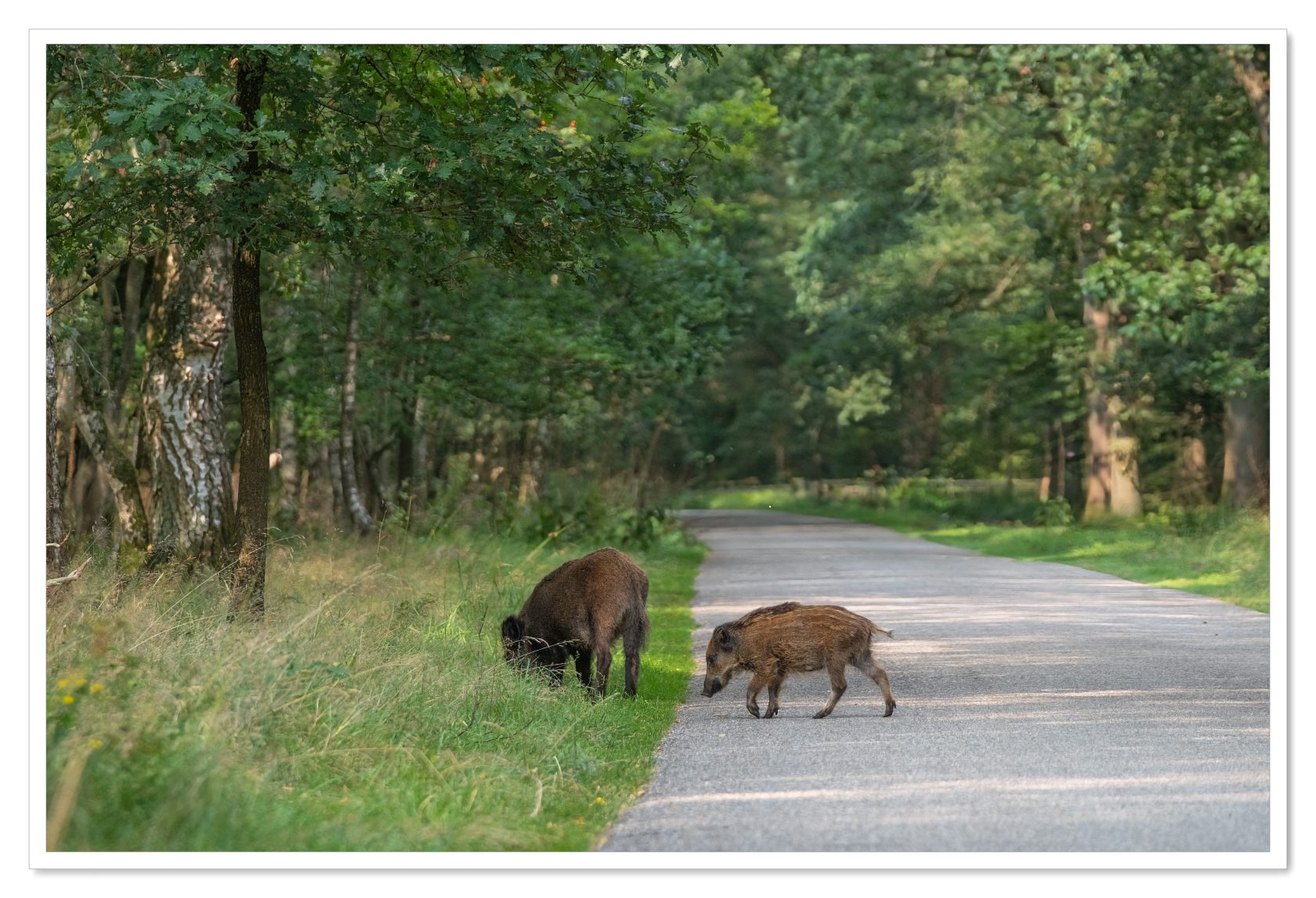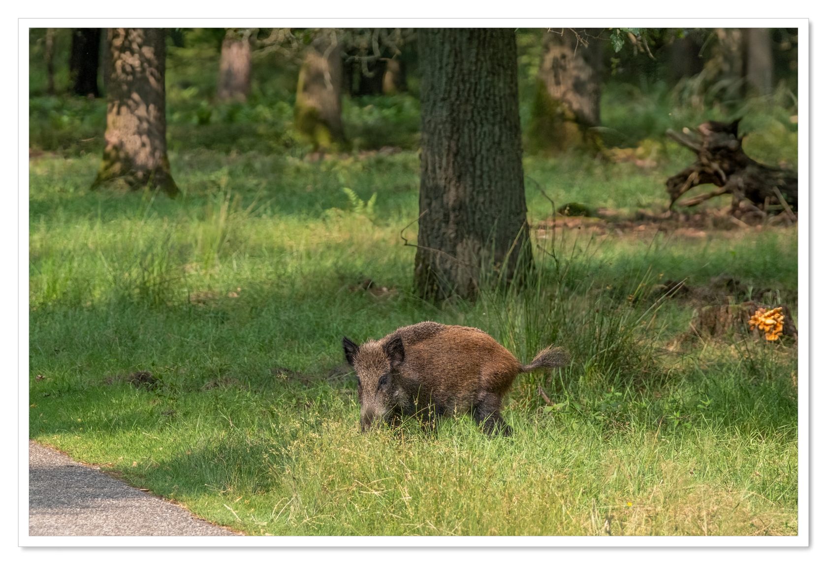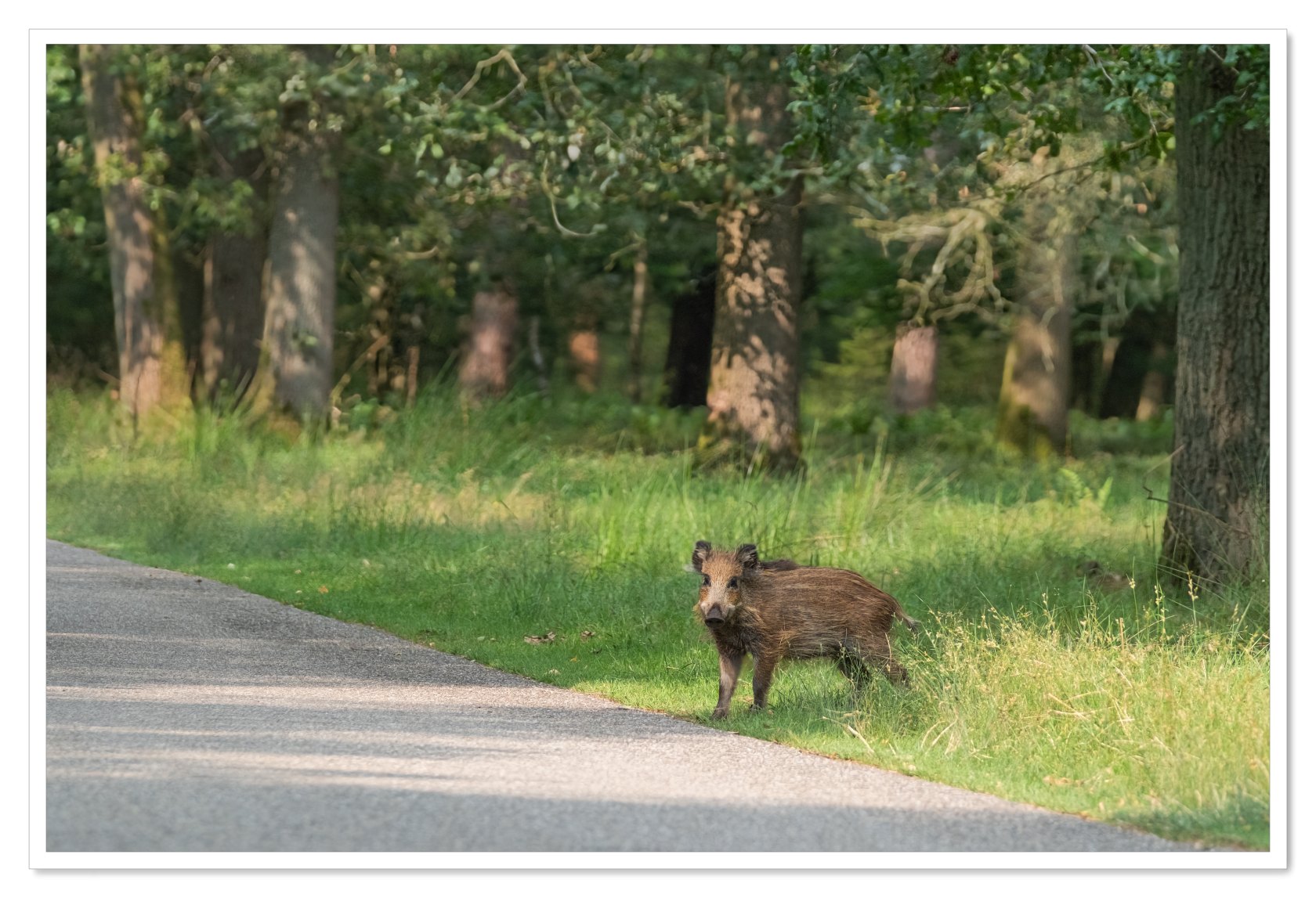 Tegen het einde van een prachtige fietstocht langs verschillende heidegebieden op de Noordelijke Veluwe, zien wij plotseling een wild zwijn langs de kant van de weg staan. Het dier, een jonge zeug, staat ongeveer 20 meter van ons vandaan. Zij blijft staan ondanks dat wij van de fiets afstappen en ik mijn camera pak. Even kijkt zij mij aan en steekt daarna op haar gemak de weg over. Uit het niets duiken er ook nog enkele biggetjes op die hun zus of tante snel volgen naar de overkant van de weg. Daar waar de dieren vandaan kwamen klinkt plotseling een kort en luid geknor. Het is de volwassen zeug die haar kroost terug roept. In een draf loopt het spul, over de weg, weer terug naar mama wild zwijn. Vanaf enkele meters worden wij in de gaten gehouden en kan ik naar hartelust fotograferen. Na enkele minuten verdwijnt het clubje wilde zwijnen het bos in.