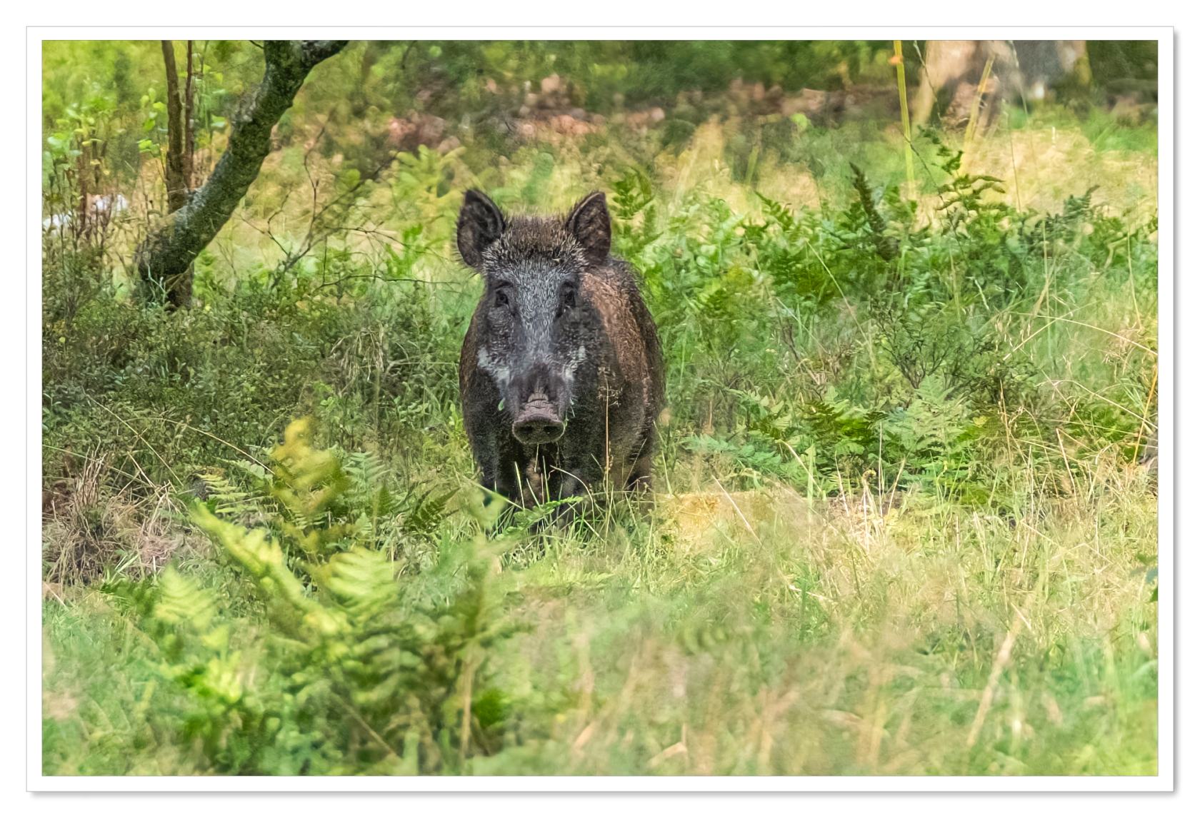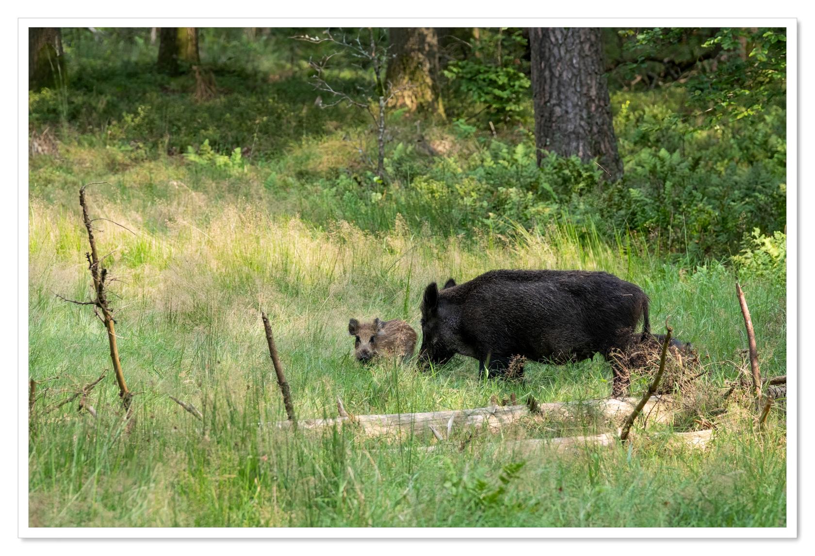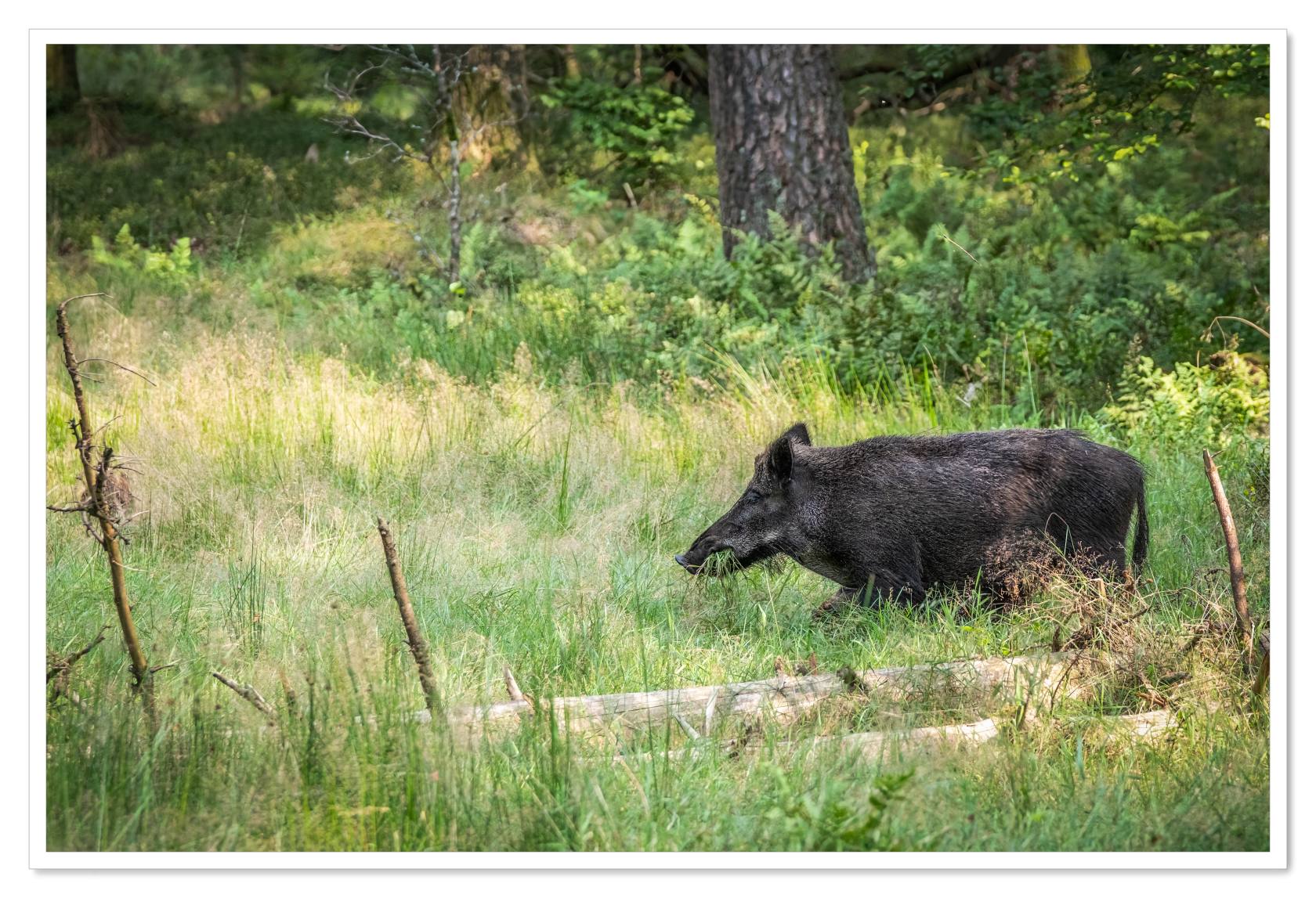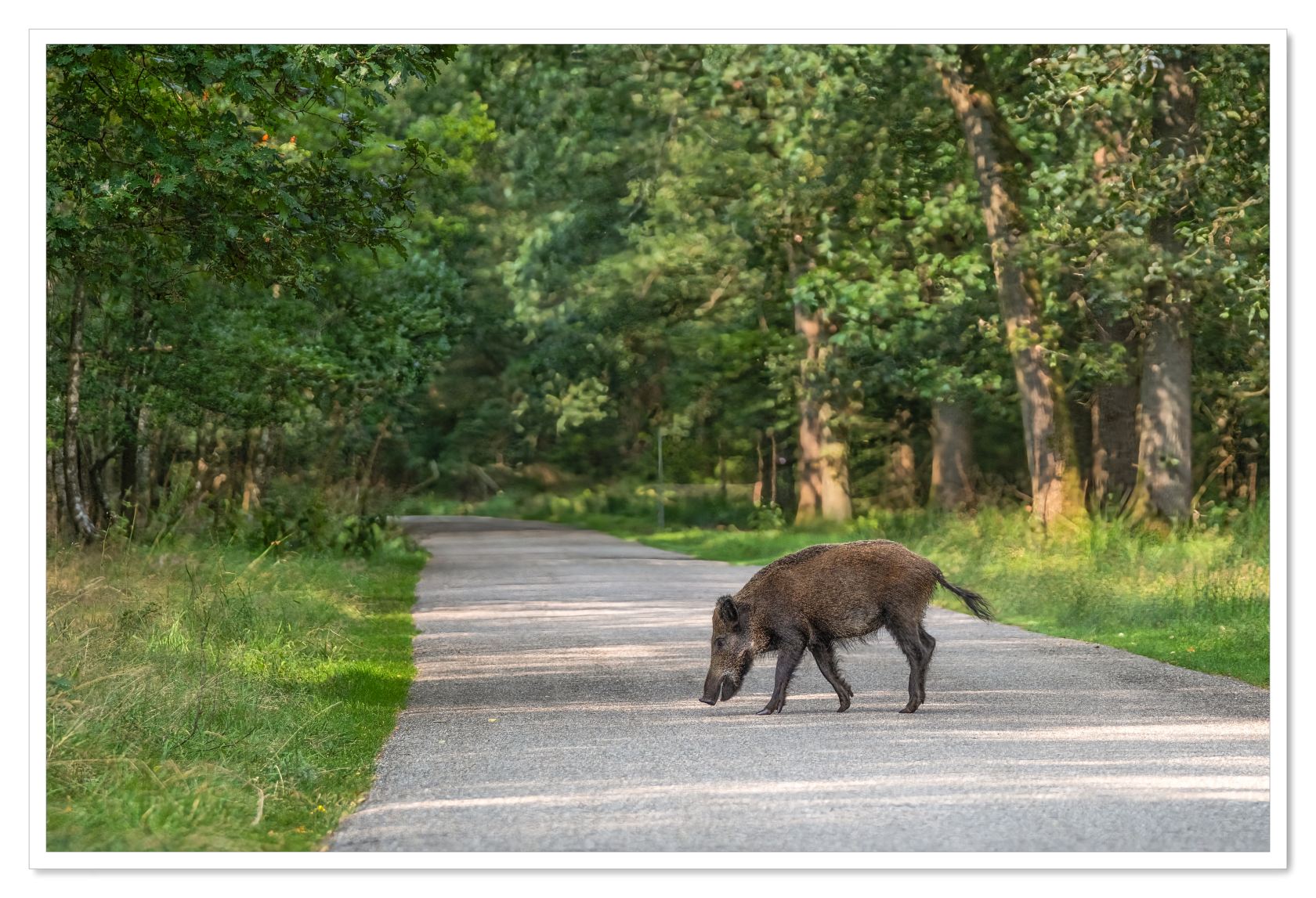 Tegen het einde van een prachtige fietstocht langs verschillende heidegebieden op de Noordelijke Veluwe, zien wij plotseling een wild zwijn langs de kant van de weg staan. Het dier, een jonge zeug, staat ongeveer 20 meter van ons vandaan. Zij blijft staan ondanks dat wij van de fiets afstappen en ik mijn camera pak. Even kijkt zij mij aan en steekt daarna op haar gemak de weg over. Uit het niets duiken er ook nog enkele biggetjes op die hun zus of tante snel volgen naar de overkant van de weg. Daar waar de dieren vandaan kwamen klinkt plotseling een kort en luid geknor. Het is de volwassen zeug die haar kroost terug roept. In een draf loopt het spul, over de weg, weer terug naar mama wild zwijn. Vanaf enkele meters worden wij in de gaten gehouden en kan ik naar hartelust fotograferen. Na enkele minuten verdwijnt het clubje wilde zwijnen het bos in.