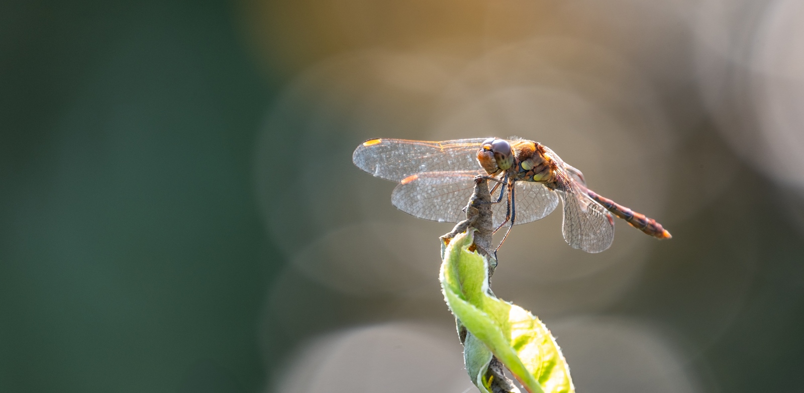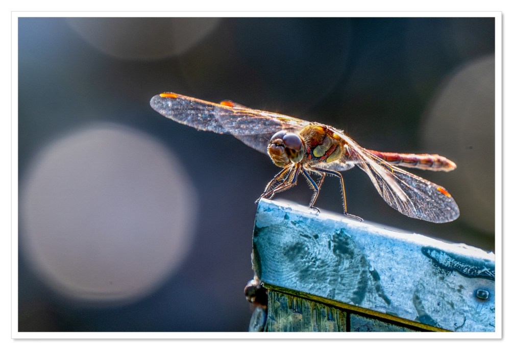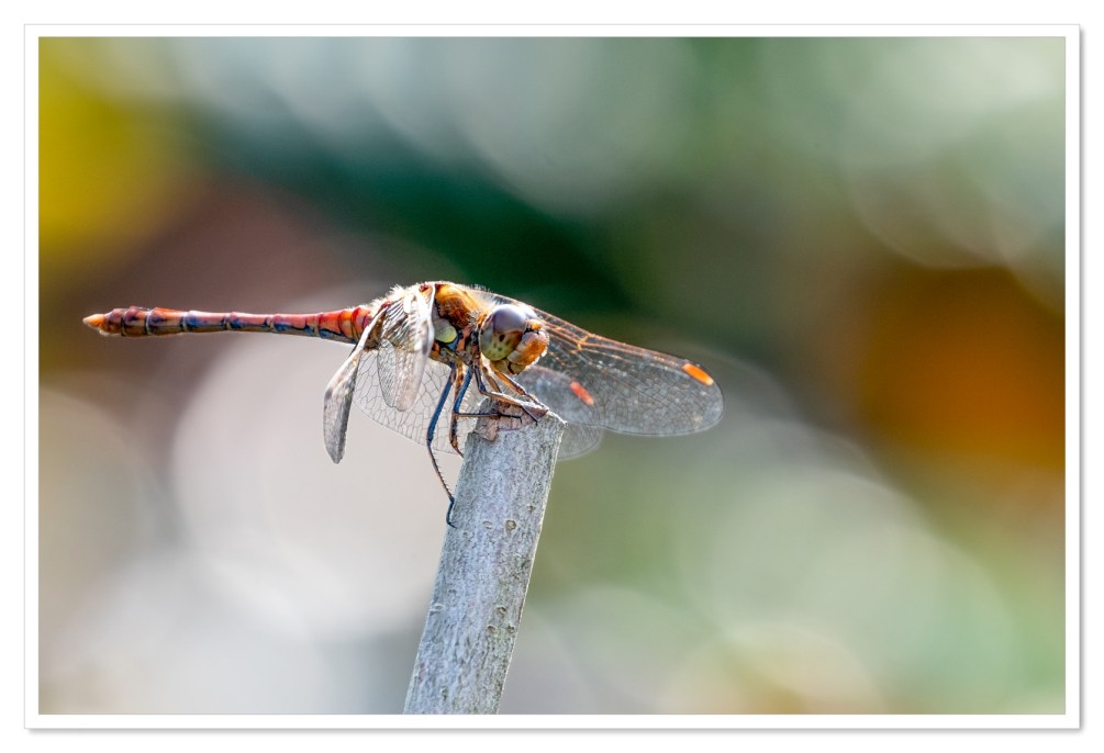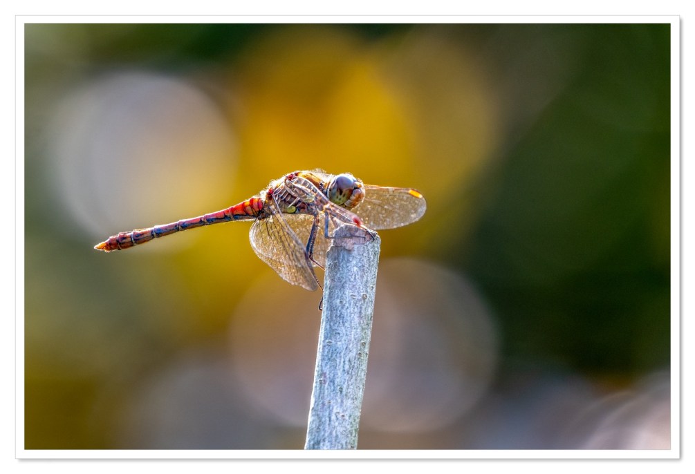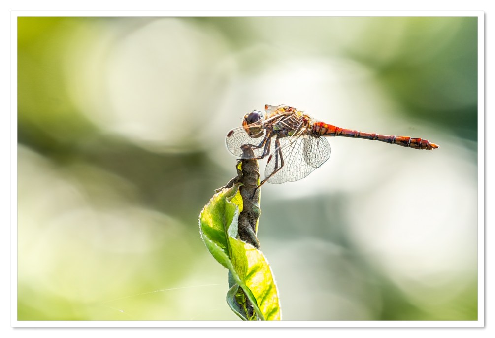 Soms hoef je niet verder te gaan dan je eigen tuin om interessante foto’s te maken. Neem nu de bruinrode heidelibel die onlangs een mooi overzichtsplekje in onze tuin vond. Het dier kon ik gedurende een flinke tijd fotograferen. Met regelmaat vloog het op om een insect in de lucht te vangen om vervolgens weer naar dezelfde plek terug te keren. Op deze manier had ik tijd genoeg om te spelen met de compositie en de achtergrond. Een achtergrond bestaande uit de bladeren van struiken waar her en der licht doorheen schijnt.