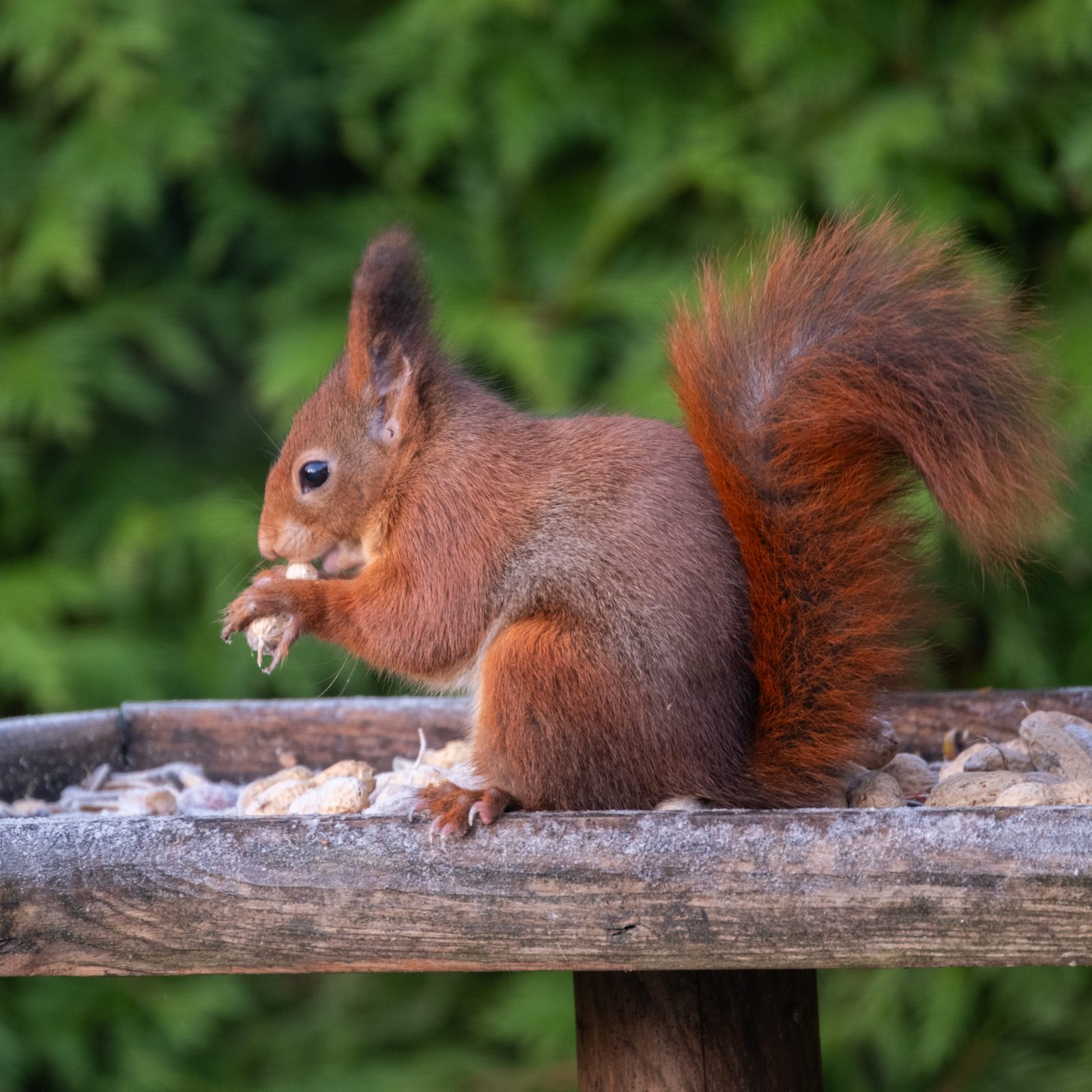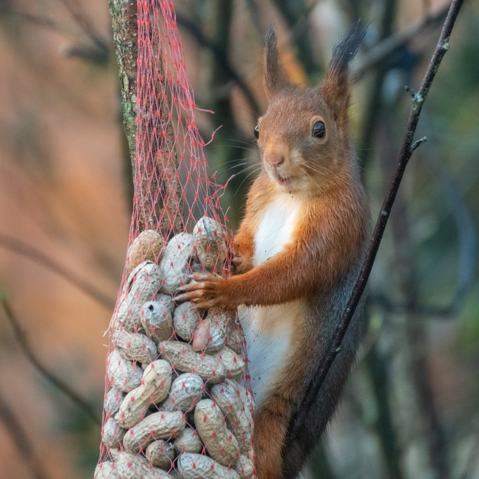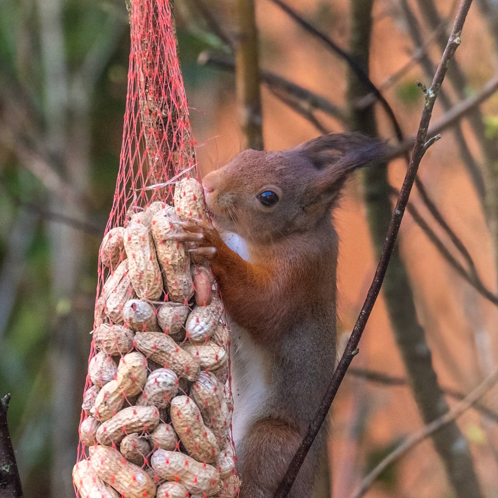 Om onverteerbaar plastic in de maag van de eekhoorn te voorkomen, knipte ik het net open en strooide de pinda’s op de voedertafel. Een goede daad? Misschien, maar zelf vond ik dat ik beter had kunnen weten. Hoe dan ook, niet alleen de eekhoorns genoten nu van de pinda’s op de voedertafel, maar ook de vogels….