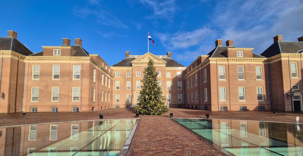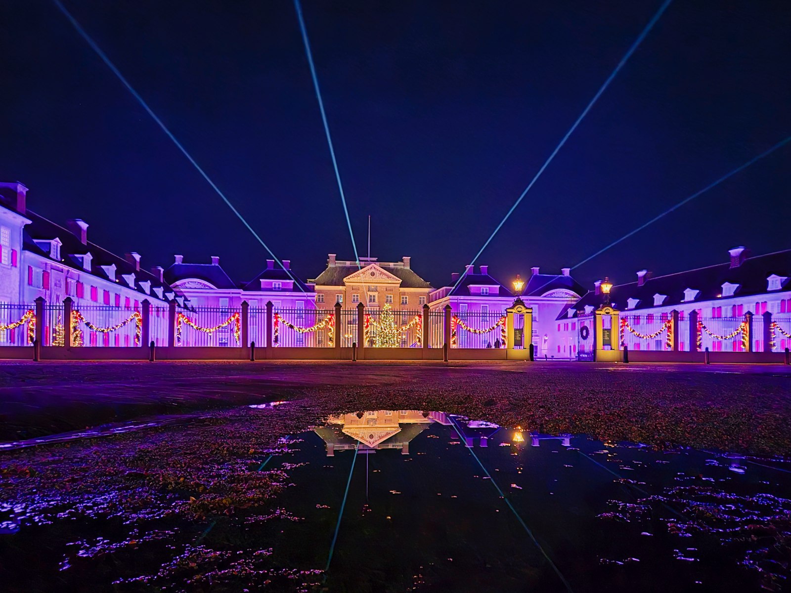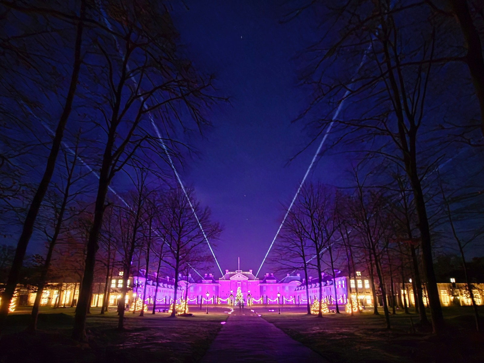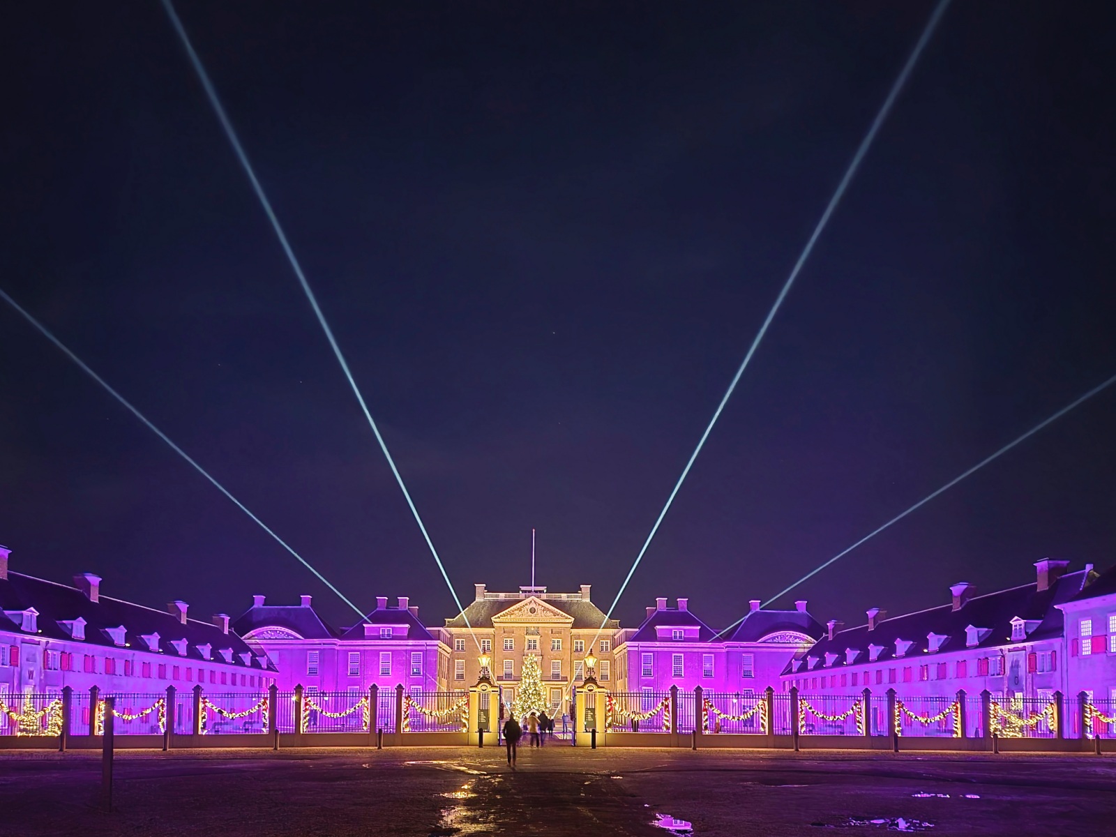 Ook in de avond is het de moeite waard om het Paleis te bezoeken. In dit geval dan de voorzijde ervan. Deze wordt tot 5 januari ’25 mooi verlicht en schijnen vier lazerstralen naar de (Kerst)sterren….