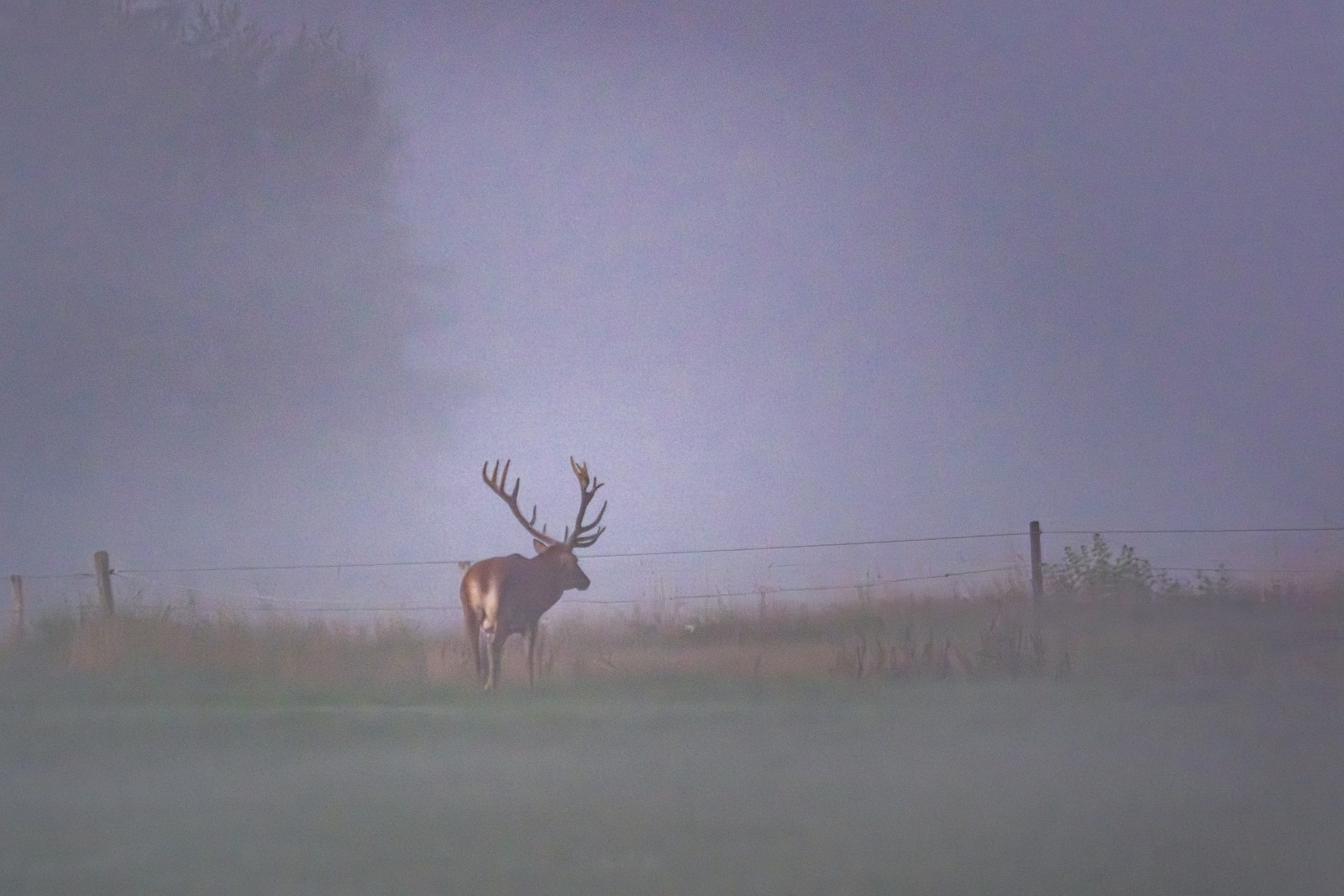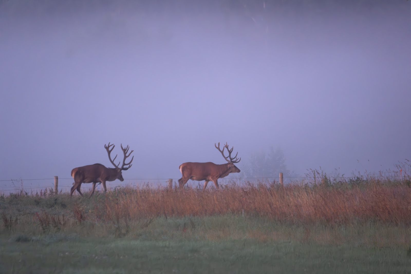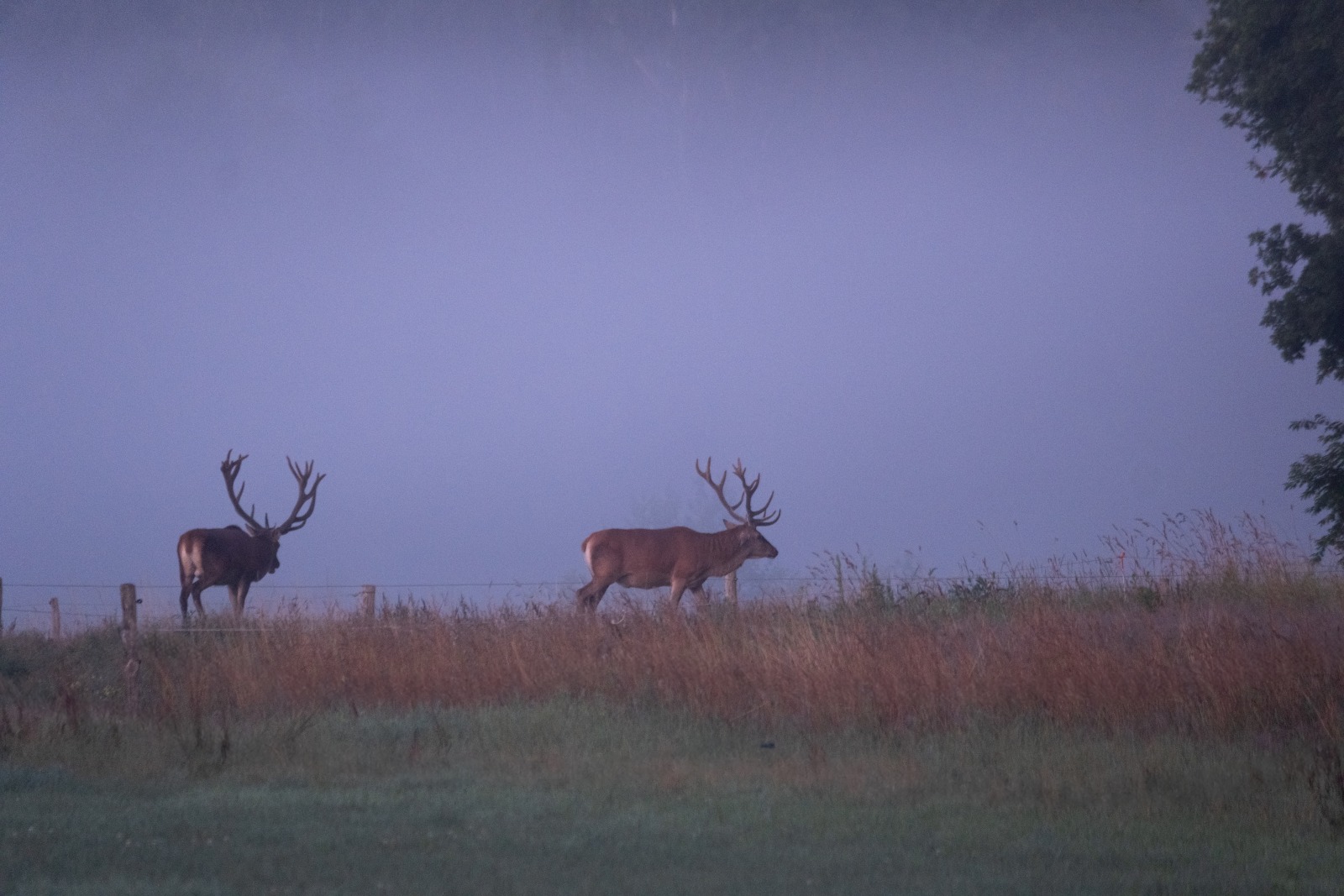 In het voorbij fietsen zag ik gisterenochtend vroeg deze twee edelhert mannen op een akker staan. Rustig grazend omgeven door wat lichte nevel om na verloop van tijd evenzo rustig het bos in te trekken….