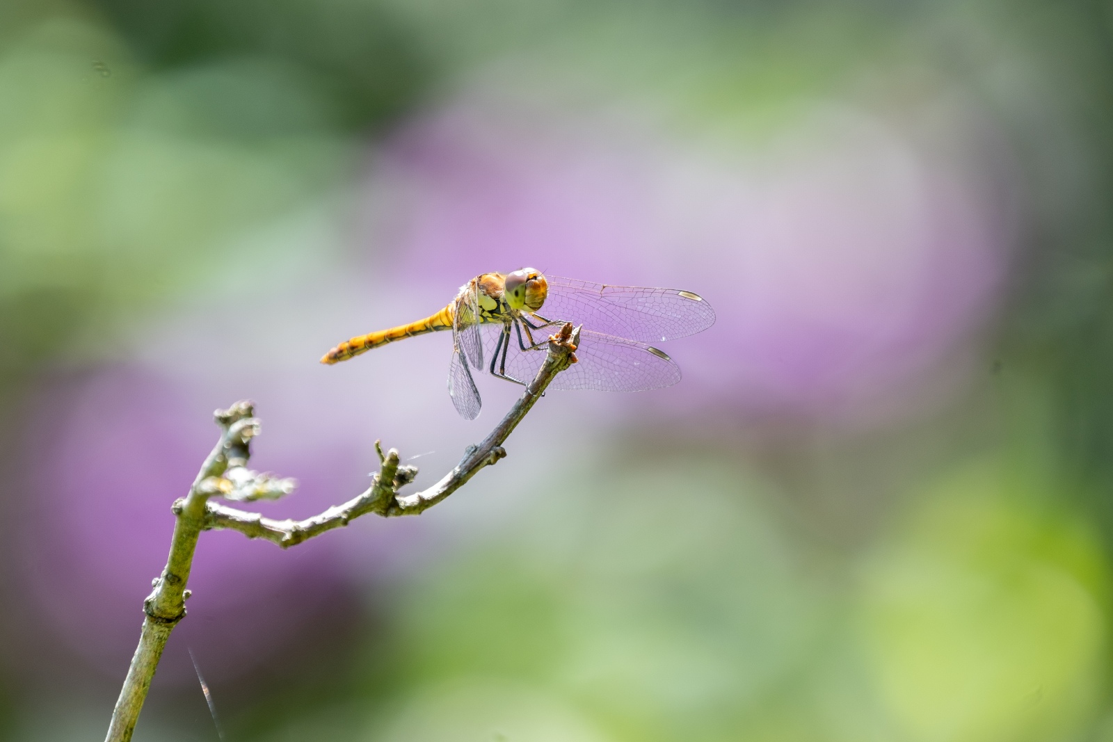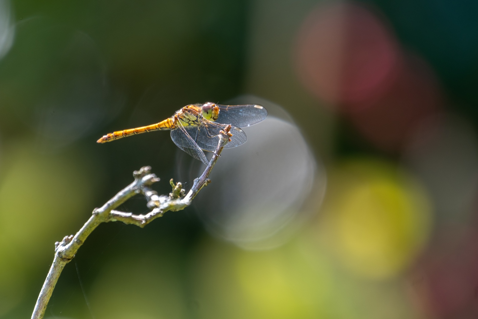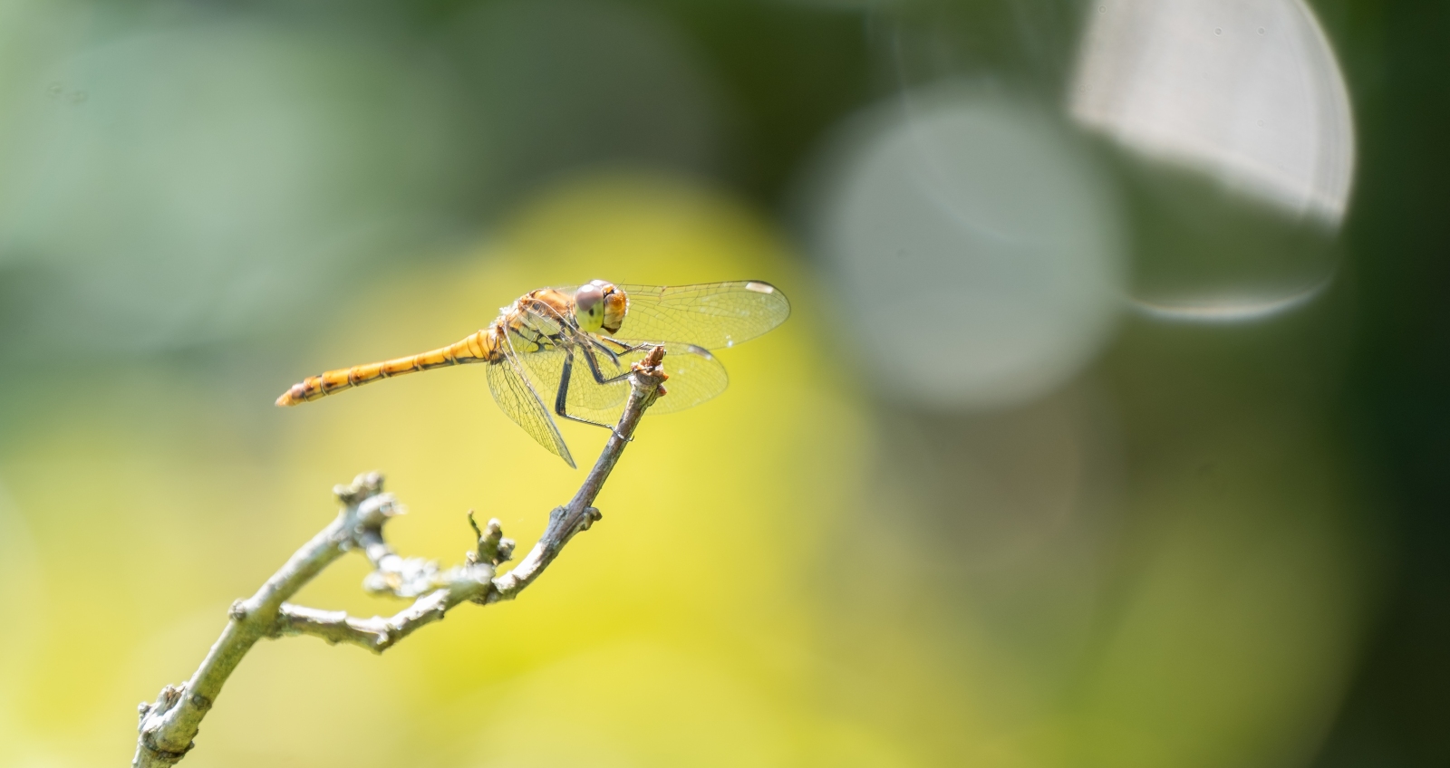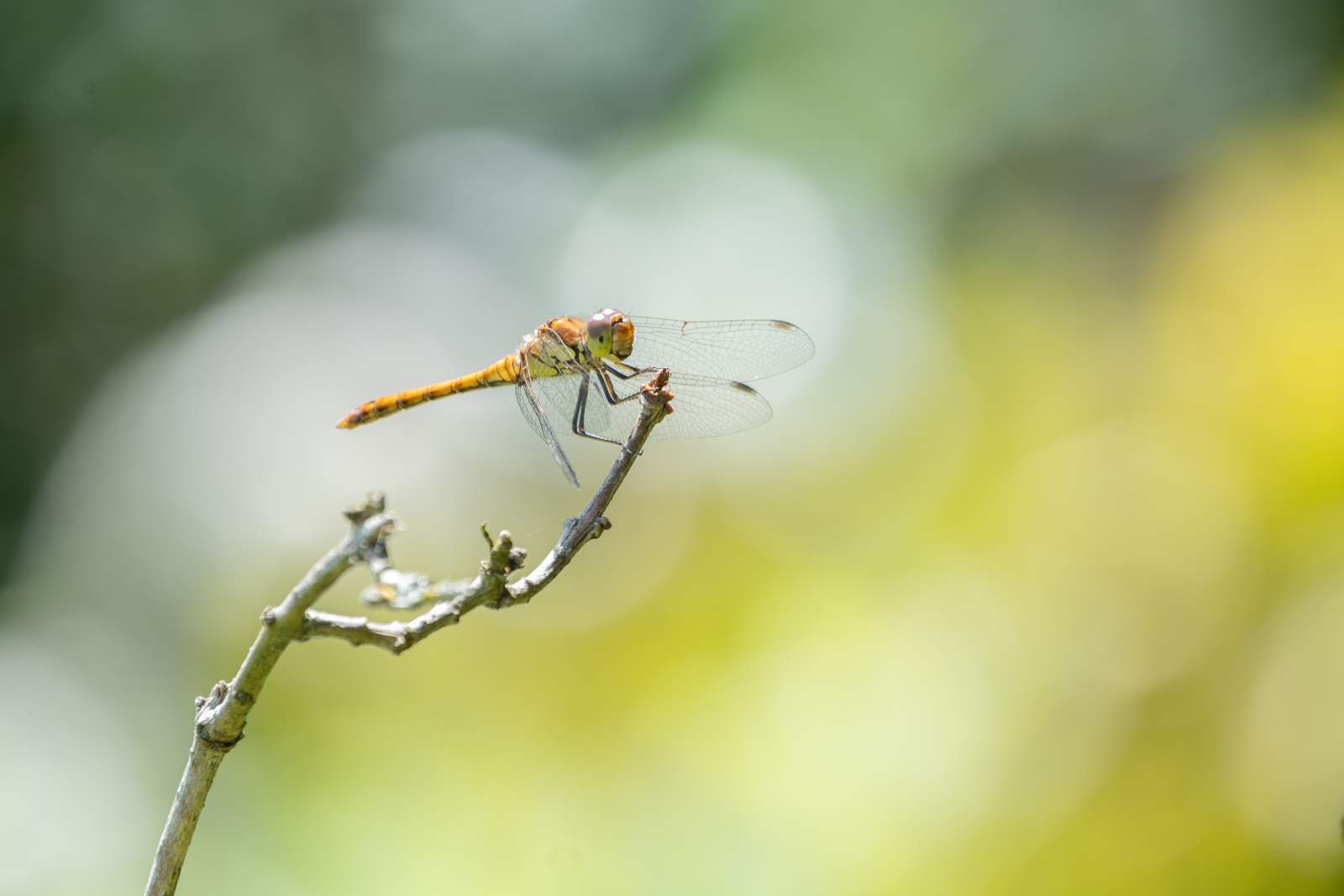Wanneer de mogelijkheid zich voordoet, dan mag ik graag spelen met de achtergrond van het te fotograferen onderwerp. Vooral bij het maken van close up opnames van insecten zoals vlinders en libellen. De achtergrond speelt tenslotte een belangrijke rol in een opname. Dit maal was het een bruinrode heidelibel, vrij zittend op een takje en een variëteit aan struiken op de achtergrond. De libel bleef gelukkig rustig zitten. Dit gaf mij de kans om op ‘veilige’ afstand in te zoomen en na iedere foto mijn standpunt ietsjes te veranderen. Dit leidde tot een serie close up opnames met iedere keer een andere achtergrond.