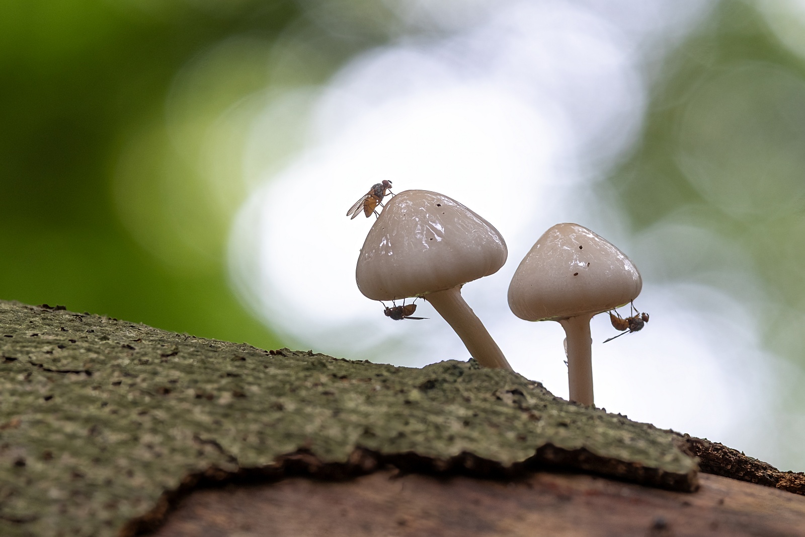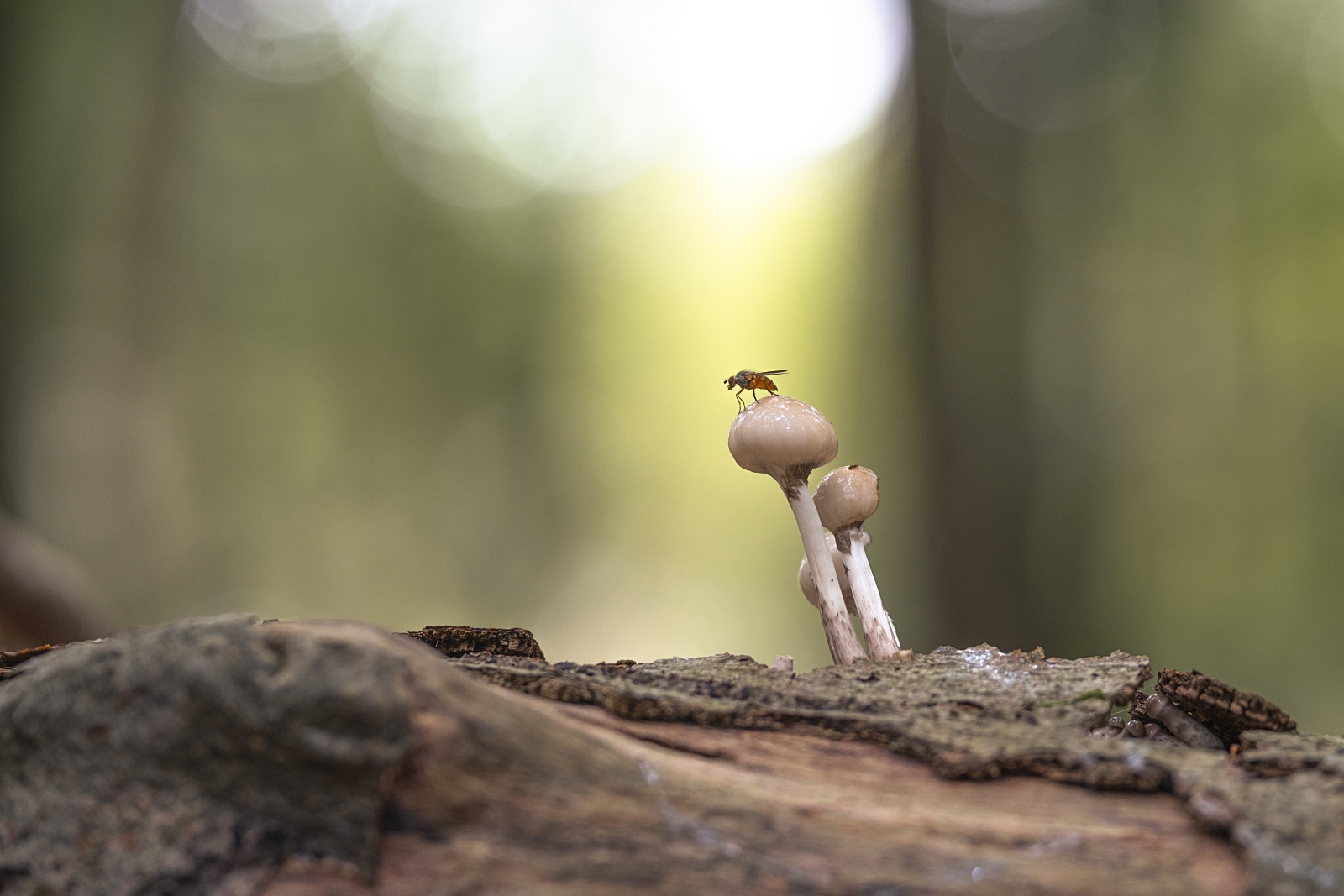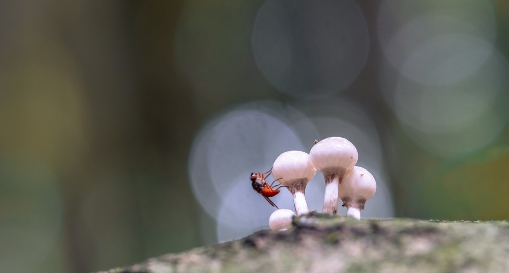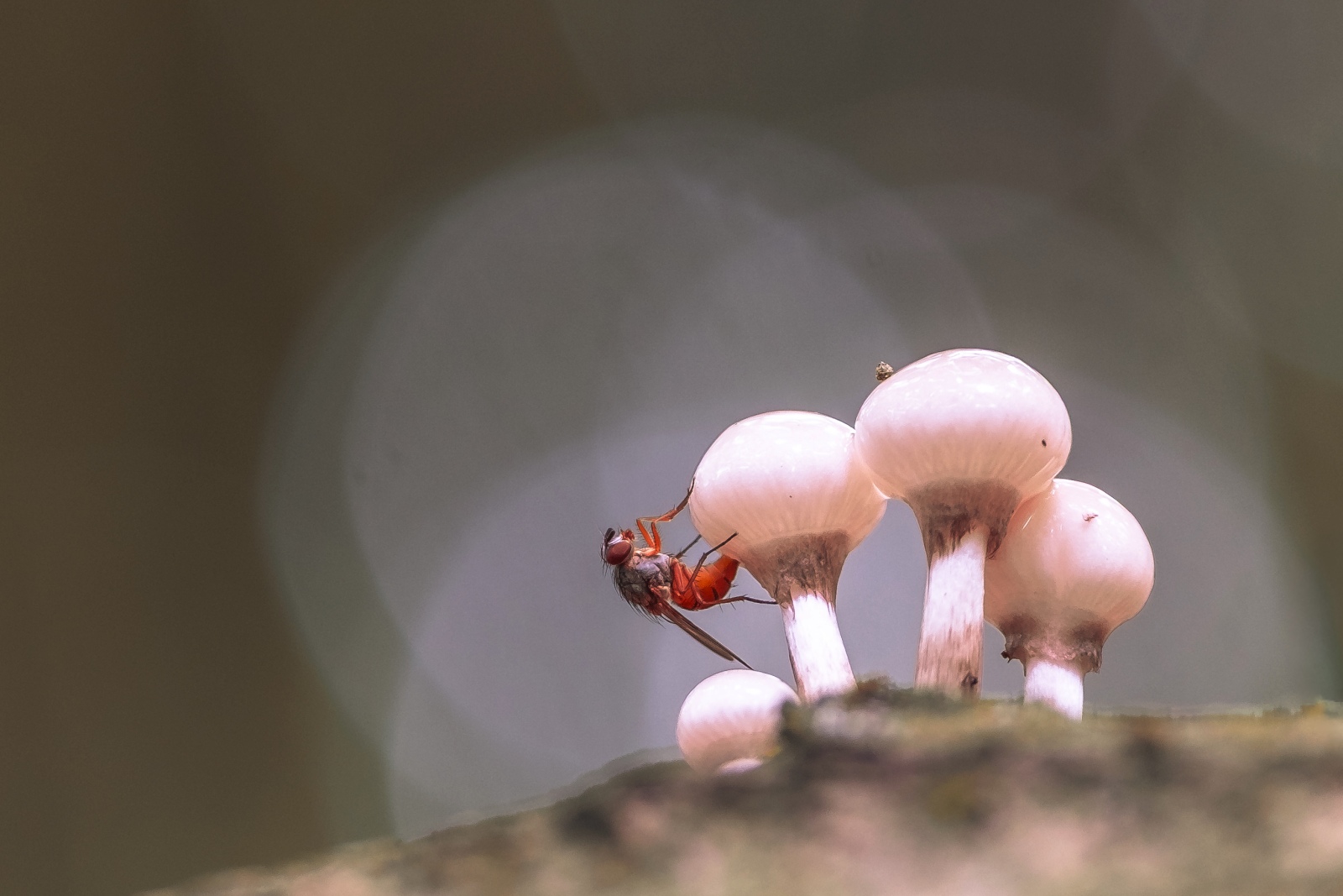 Een paddenstoel is een favoriete plek voor insecten, zoals de vlieg. Voor mij is deze combinatie van paddenstoel en vlieg een van mijn favoriete composities…..