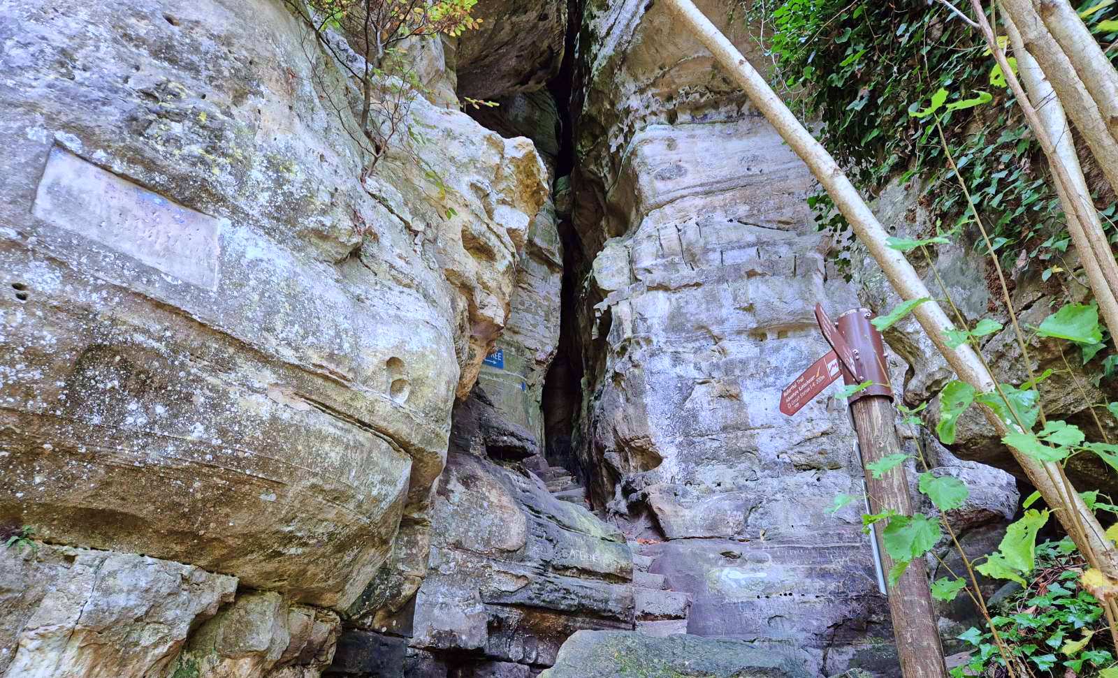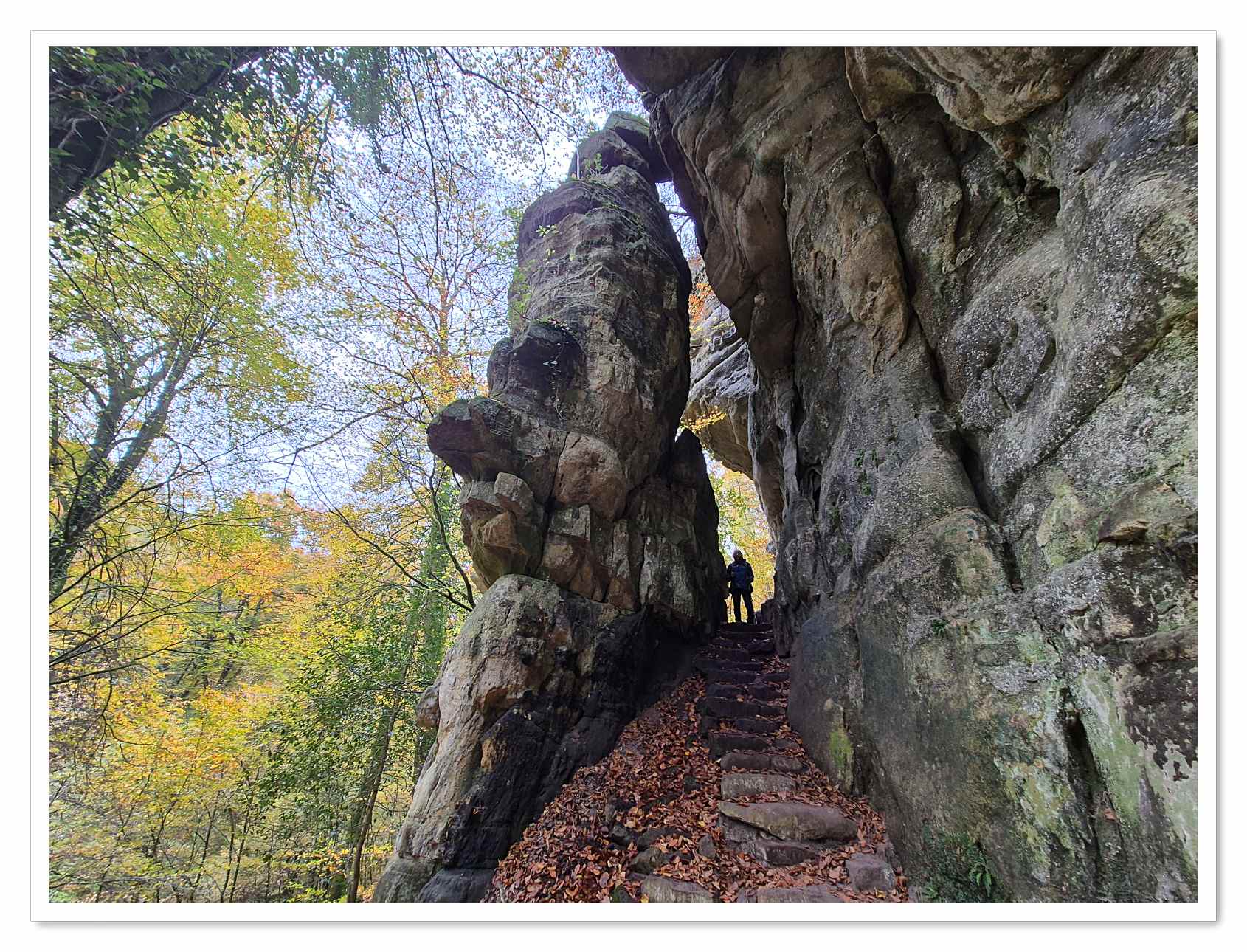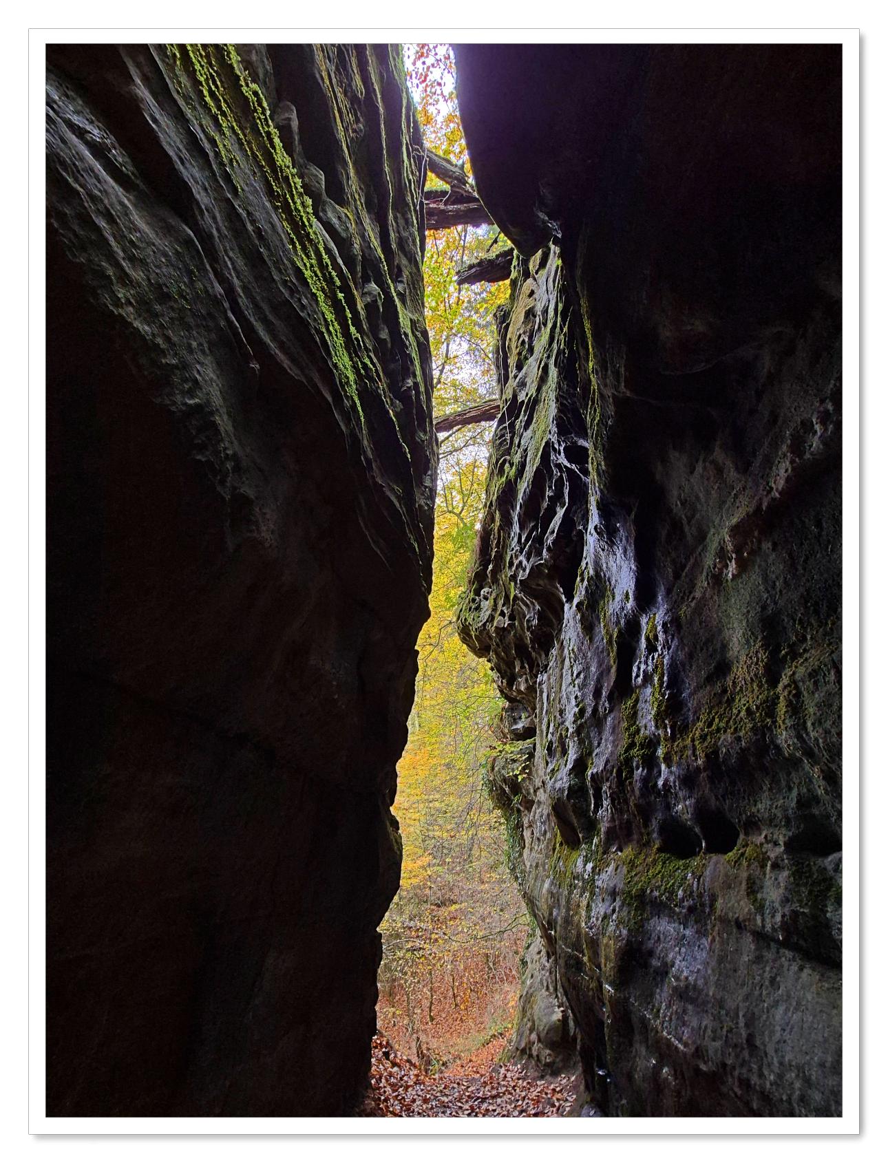 Vandaag opnieuw een favoriete wandelroute van ons, een route bestemd voor avonturiers en waaghalzen. De vier-en-een-halve kilometer route voert namelijk door een aantal uiterst smalle en pikdonkere rotsspleten! Een zaklamp is bij deze doorgangen een must, claustrofobie is daarentegen een no-go. Na dit avontuur, verlengen wij de route met een prachtige wandeling door het herfstlandschap.