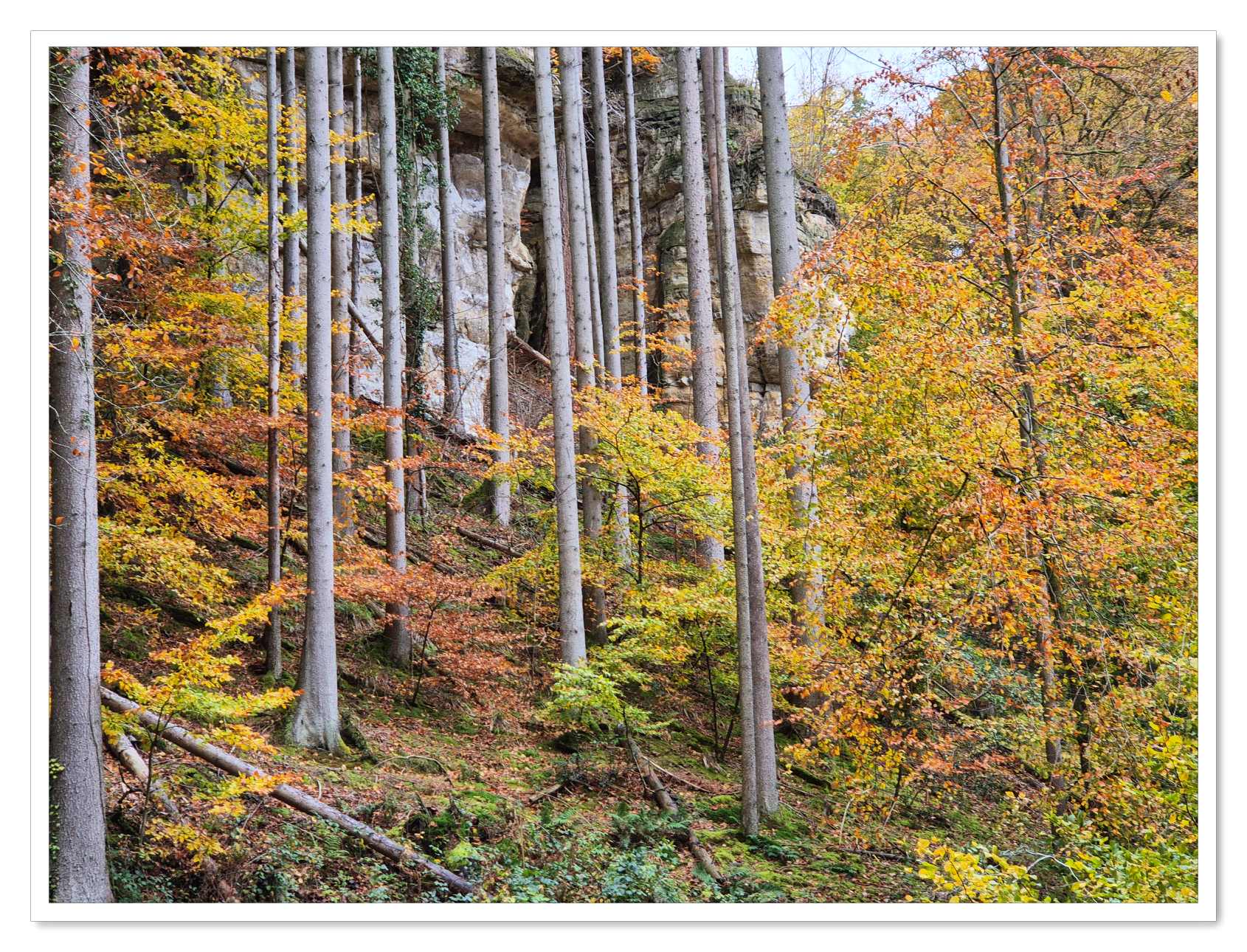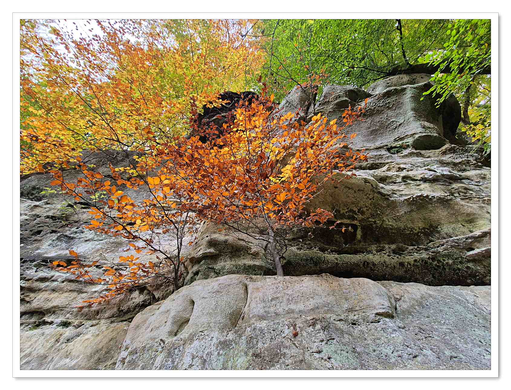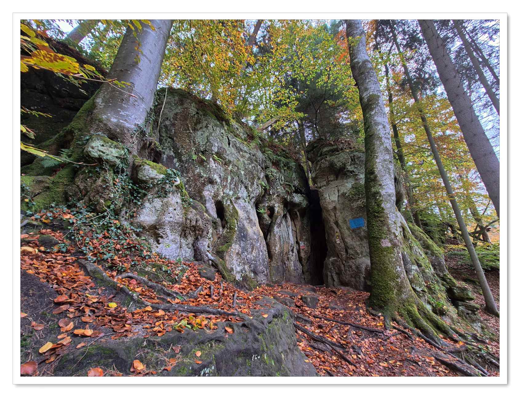 Vandaag opnieuw een favoriete wandelroute van ons, een route bestemd voor avonturiers en waaghalzen. De vier-en-een-halve kilometer route voert namelijk door een aantal uiterst smalle en pikdonkere rotsspleten! Een zaklamp is bij deze doorgangen een must, claustrofobie is daarentegen een no-go. Na dit avontuur, verlengen wij de route met een prachtige wandeling door het herfstlandschap.