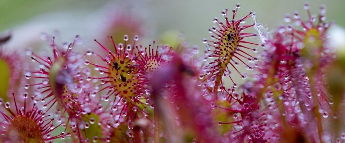 Tijdens een voorverkennings fototocht op het Leersumseveld kwamen wij de kleine zonnedauw tegen. De zonnedauw is lid van de vleesetende planten. Al hoewel het begrip eten hier moet worden uitgelegd door verteren. De zonnedauw produceert namelijk een enzym in de vorm van kleverige druppeltjes rond een uitstulping of draad. Insecten worden door het (dauw) druppeltje … Leersumseveld, zonnedauw verder lezen